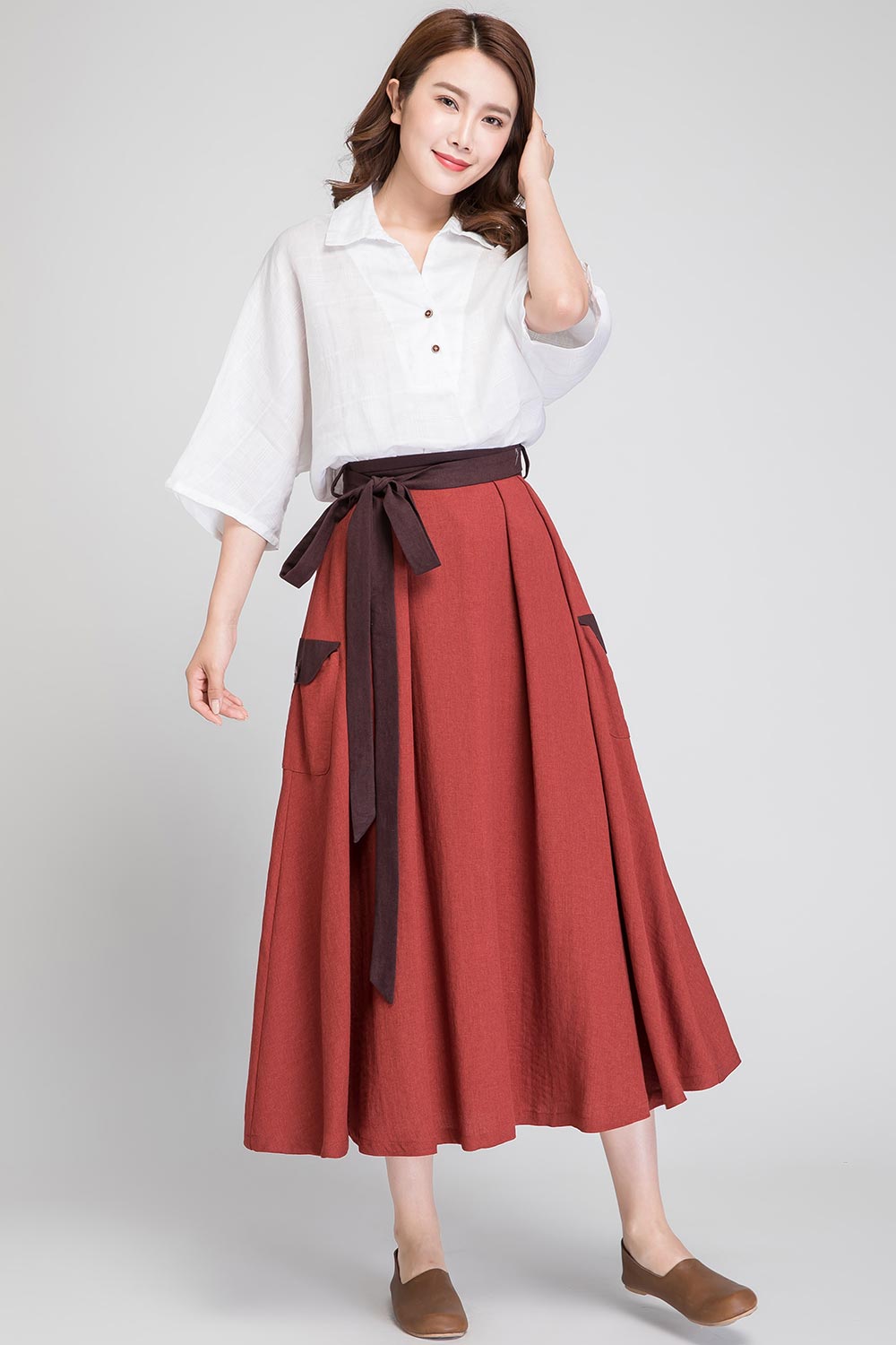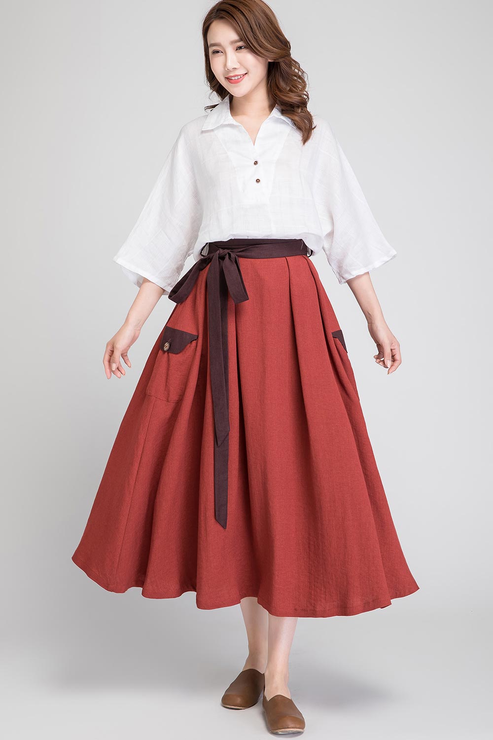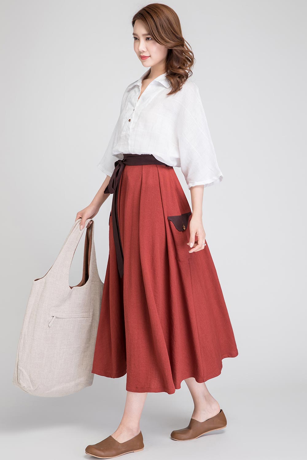 Flap pockets add utilitarian charm to our midi linen skirt cut with a high banded waist and a drapey sash tie belt.