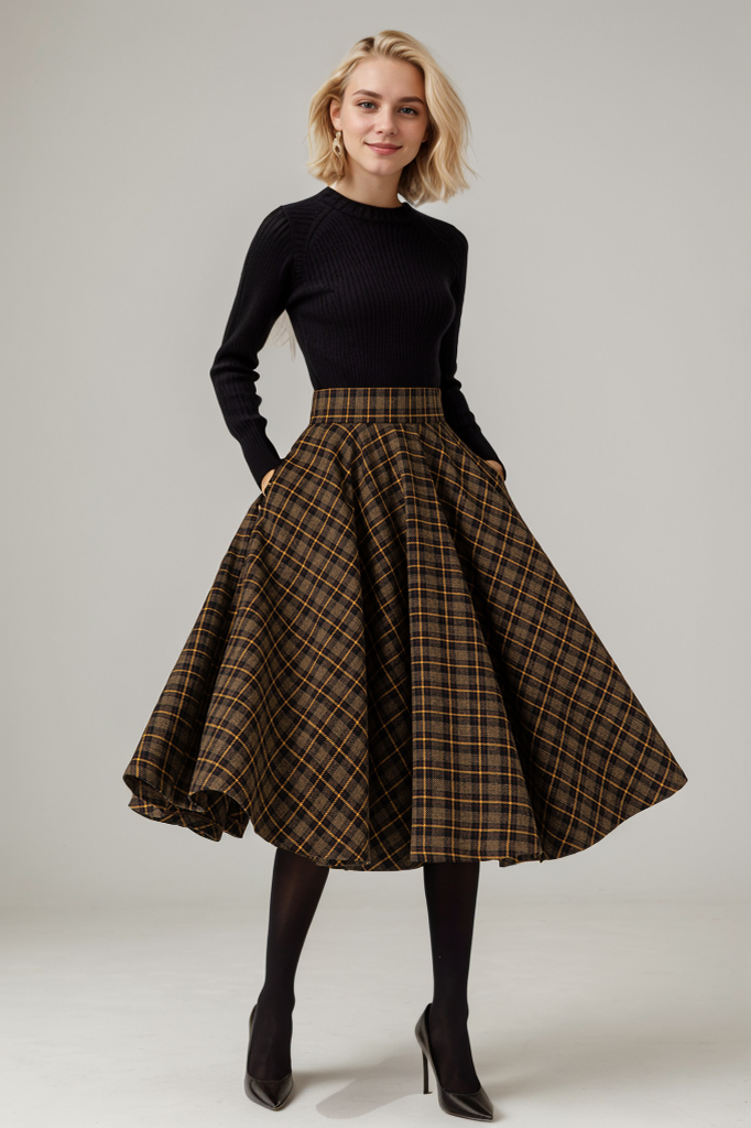This brown plaid wool midi swing skirt feels warm and substantial, with a full circle silhouette that moves beautifully as you walk. The high waist creates a flattering line while the structured fabric and smooth lining keep you comfortable from workdays to winter outings.