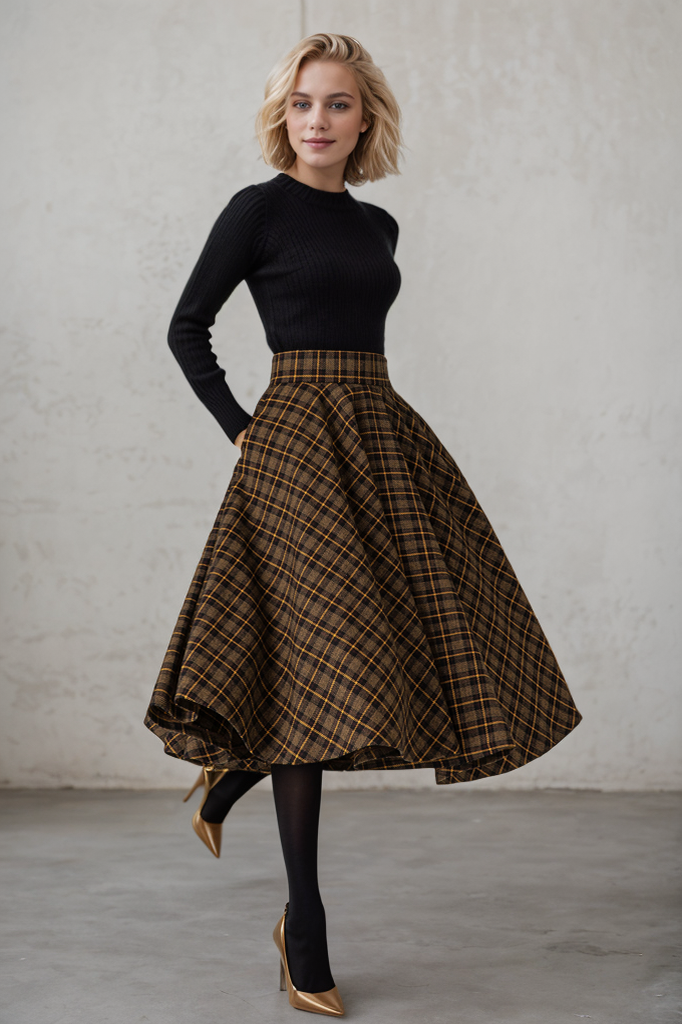 This wool plaid swing skirt is perfect for the winter months. The midi length provides coverage and warmth, while the plaid design adds a touch of classic style. Made with high-quality wool, this skirt will keep you comfortable and fashionable during the colder seasons.