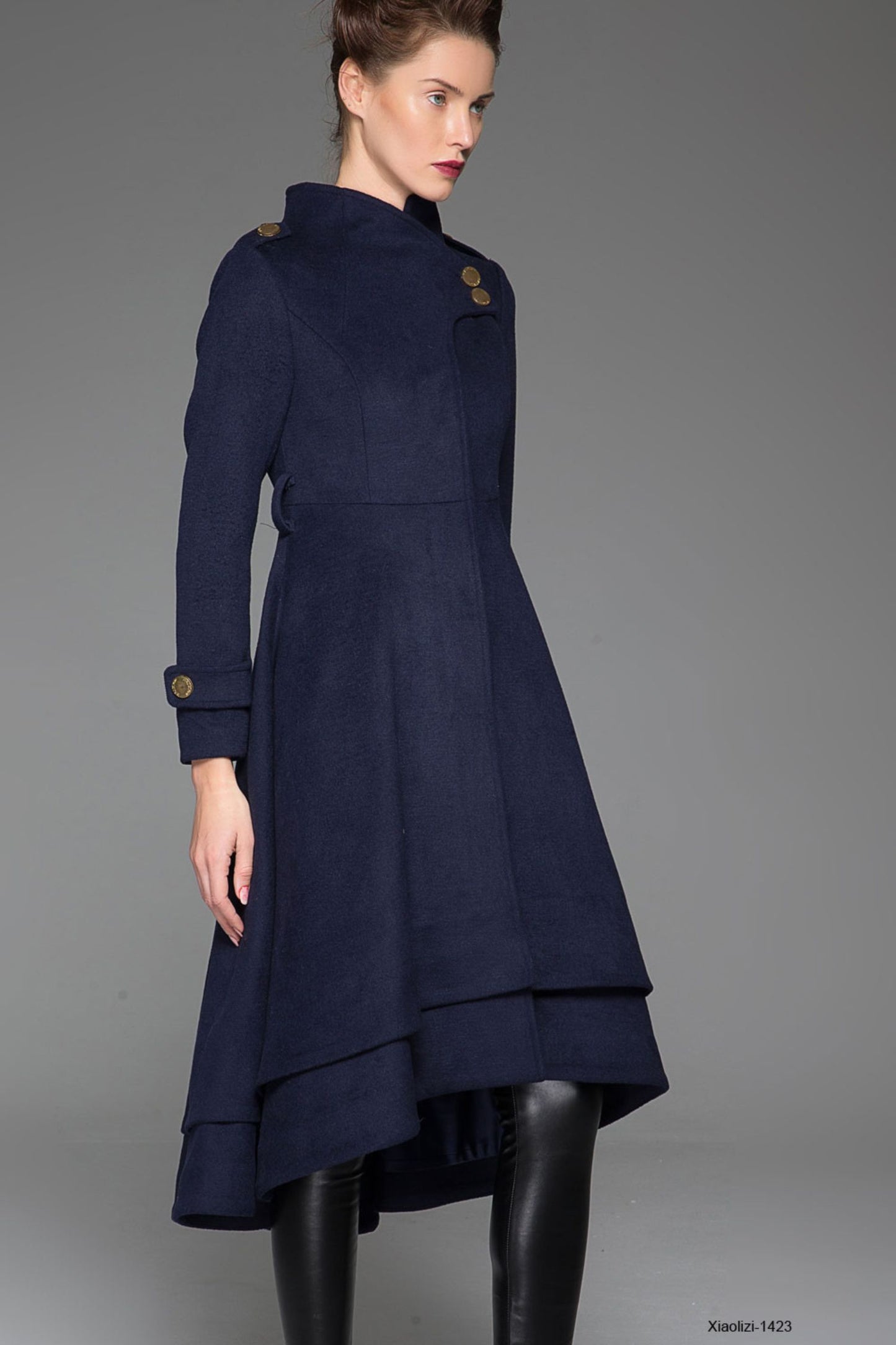 Feminine Wool Coat Navy Blue – Asymmetrical Hem & Stand Collar – 1423