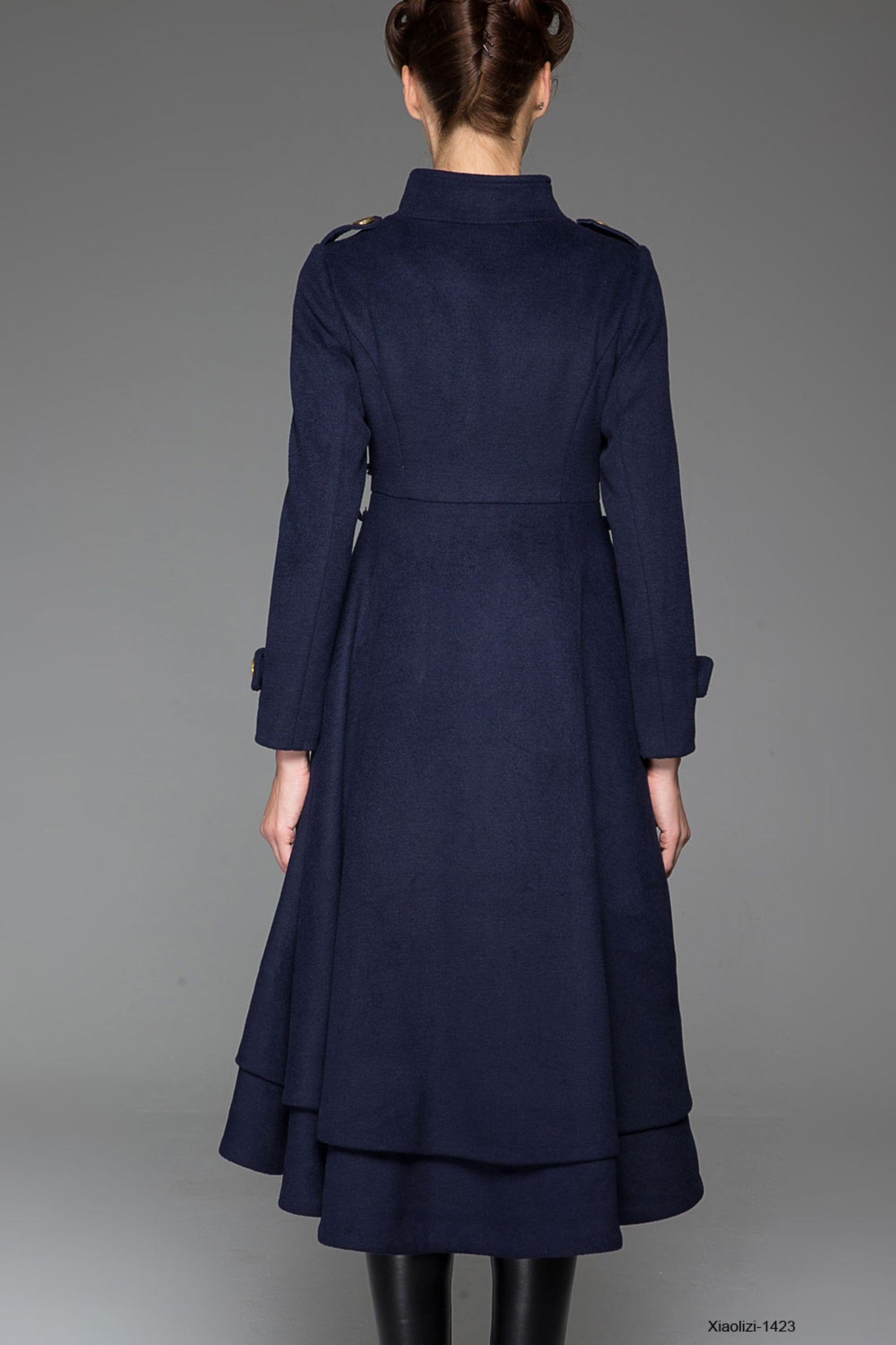 This navy blue wool coat brings cozy structure and graceful movement together in one distinctive winter piece. The tailored seams and high stand collar offer warmth and elegance, while the layered asymmetrical hem adds a soft, feminine twist to every step.