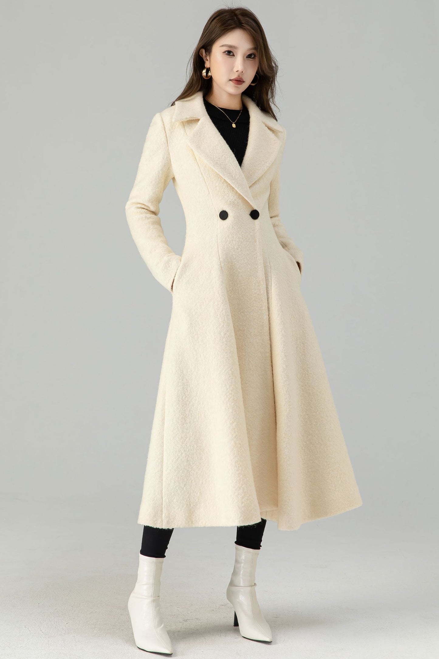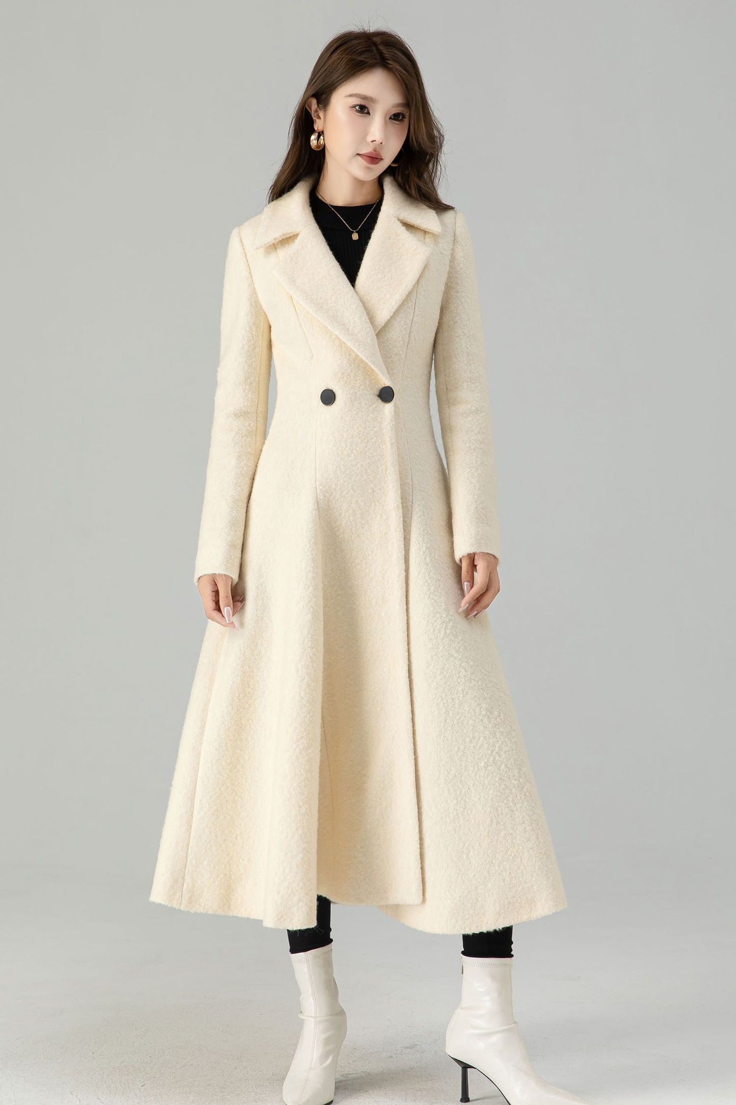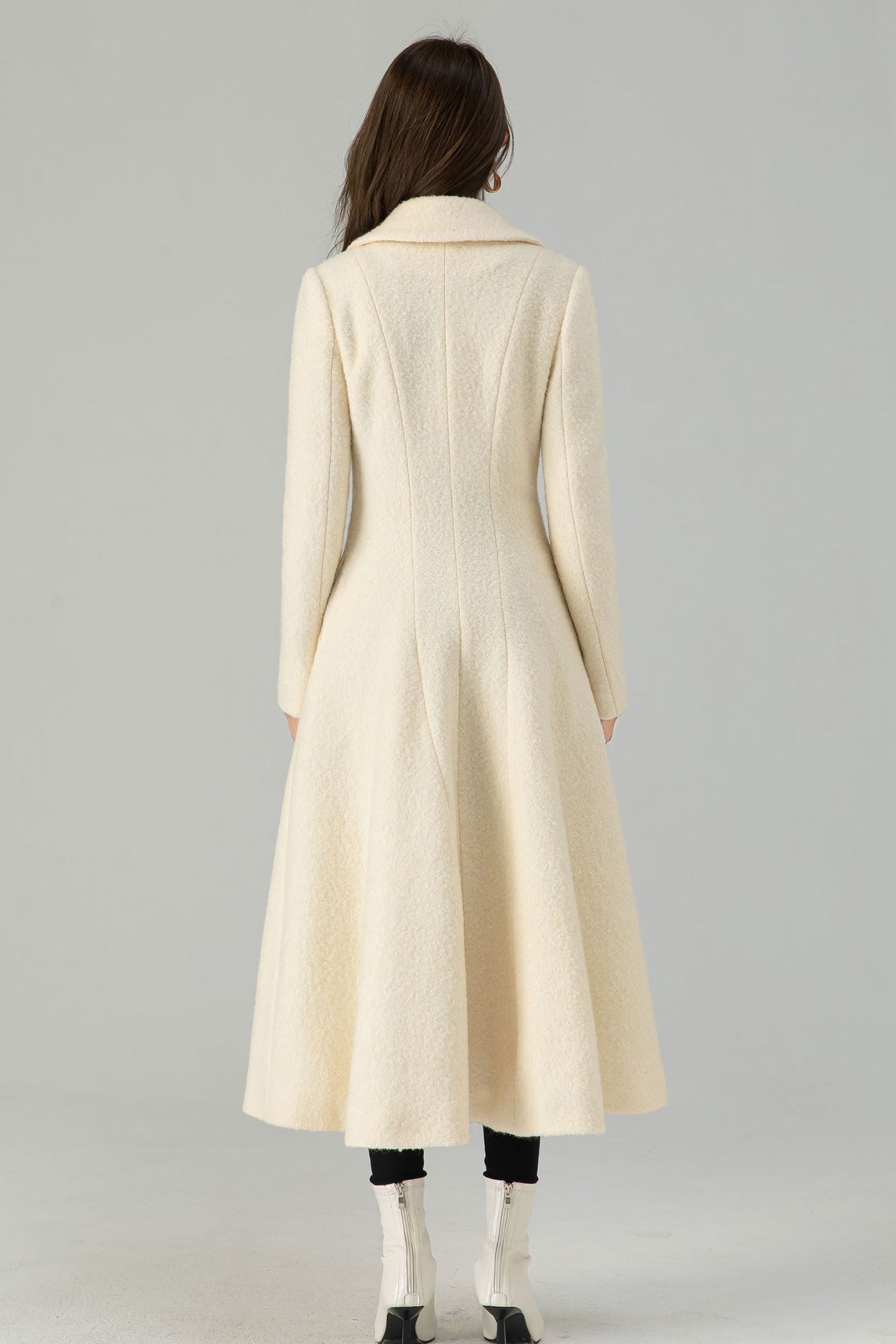 This vintage inspired white long maxi wool coat is just perfect for your wedding, Event, prom in winter, Crafte with wool blend fabric, featuring fit and flare silhouette, double breasted , Feminine and stylish