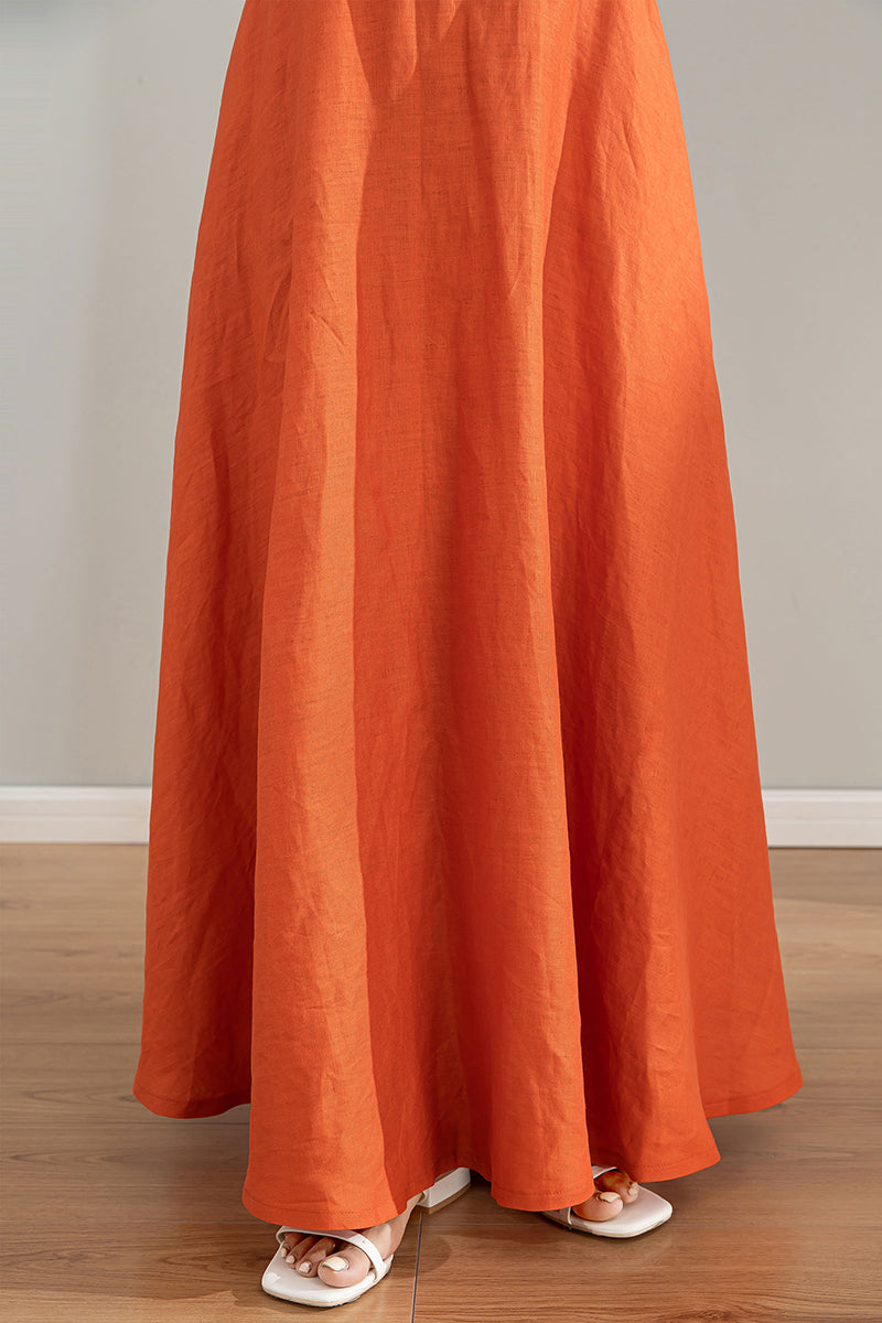 This orange A-line linen midi skirt is made from high-quality linen material, which is soft, comfortable, and breathable. The bright and vibrant color makes you stand out in the crowd. The wide hemline adds an elegant and flowing movement to your look. The high-waisted design highlights your waistline, creating a flattering silhouette. Pair it with a lace top or a loose-fitting t-shirt to create different fashion styles. This skirt is suitable for various occasions such as dates, parties, and vacations. It is a must-have item in your wardrobe.