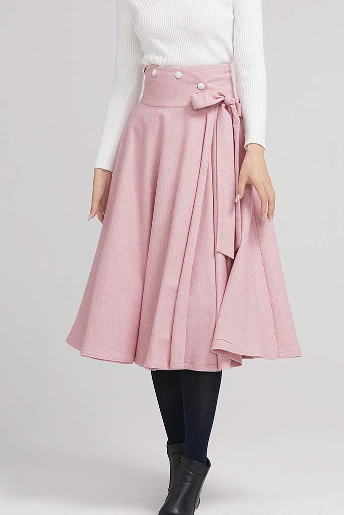 Step into timeless elegance with this wine red wool blend midi skirt, designed with a flattering high waistband and a charming bow tie detail. Crafted for warmth and sophistication, its A-line swing silhouette flows gracefully with every step. Pair it with a blouse or knitwear for an effortlessly chic winter look.