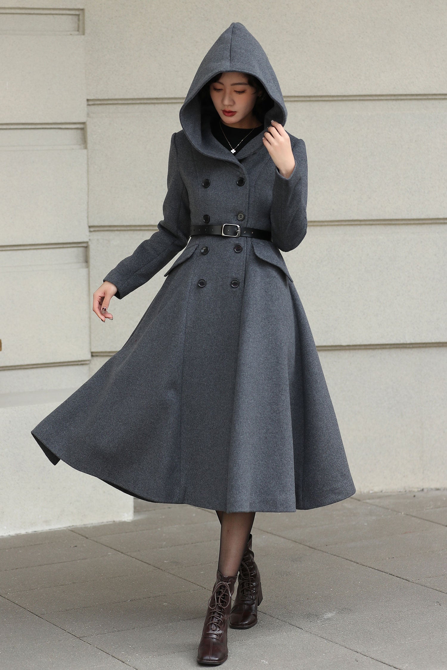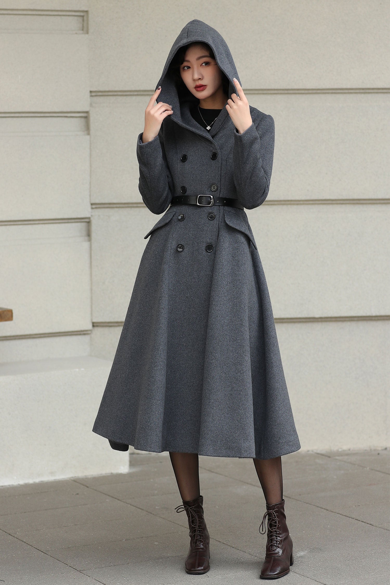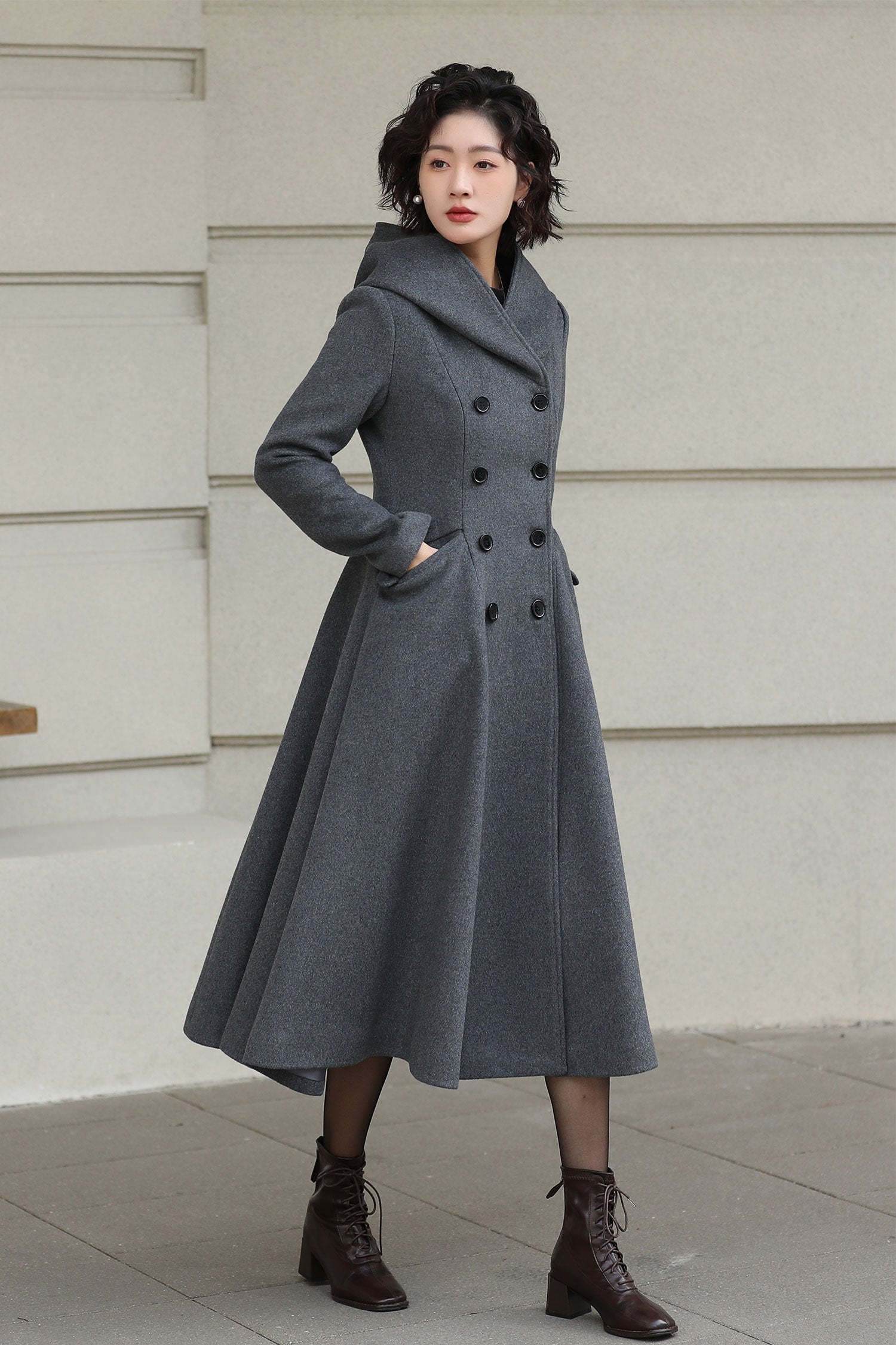 Elegant, warm, and beautifully sculpted, this gray hooded wool coat brings timeless winter charm to your cold-weather wardrobe. The soft wool-blend fabric flows from a gently shaped empire waist into a sweeping A-line hem, creating a graceful silhouette with every step. A sculpted hood adds cozy warmth, while the double-breasted front and tailored seams highlight the craftsmanship that defines every Xiaolizi piece. Fully lined and designed for comfort, this coat is a refined choice for winter, autumn, and early spring.