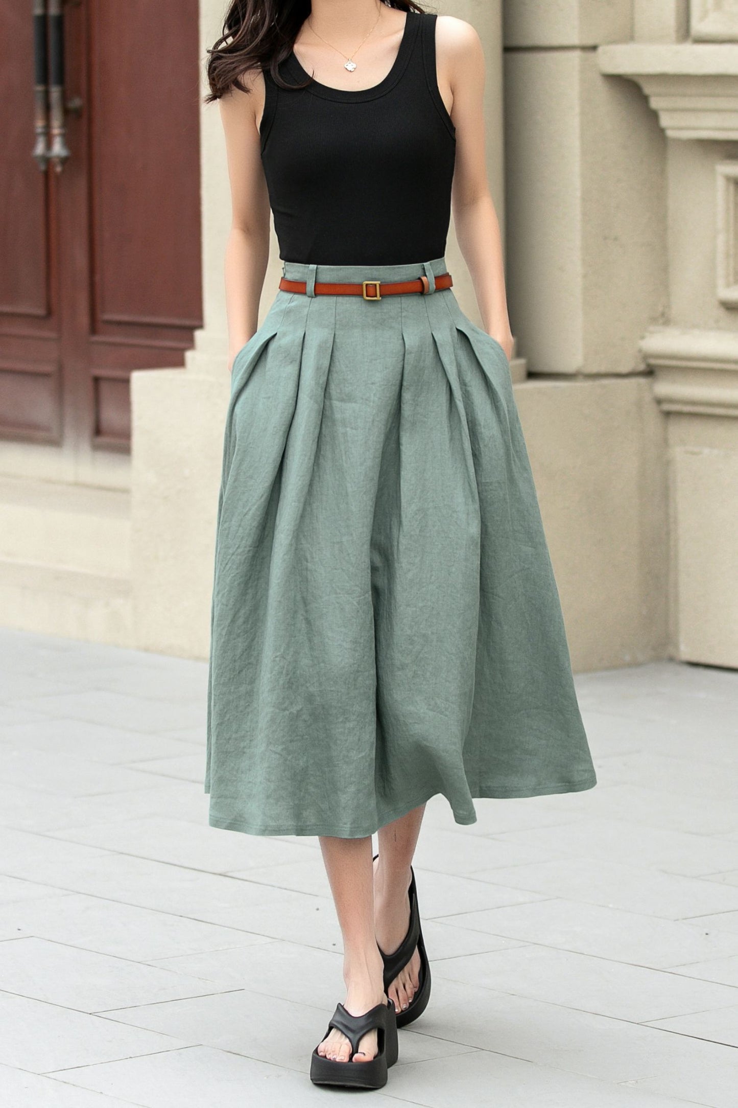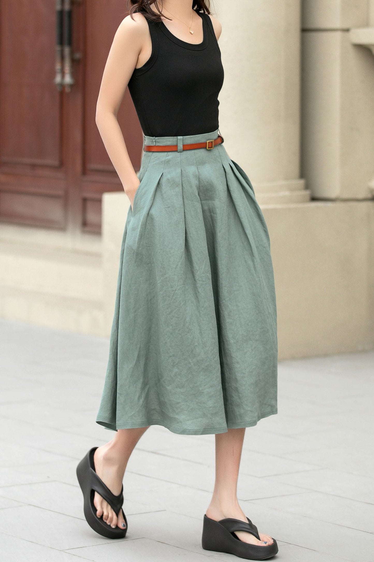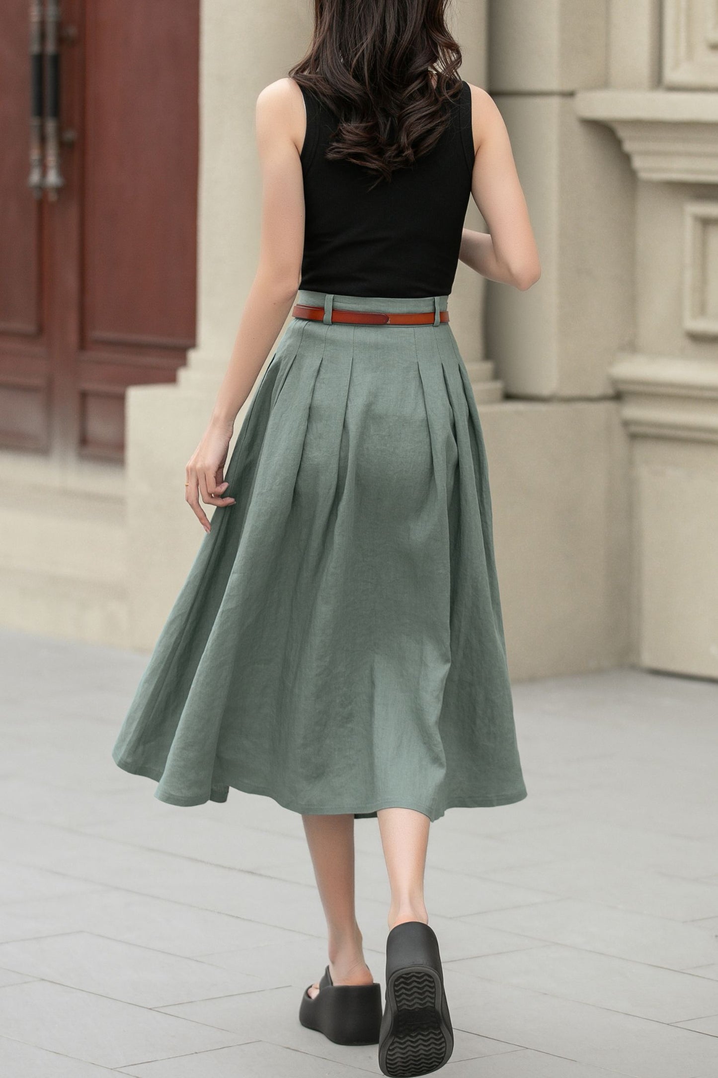 This charming linen skirt in a muted green shade offers a fresh take on a classic A-line silhouette. The high waist is beautifully defined by pleats, creating a flattering shape that adds both volume and movement. The skirt’s length is perfect, hitting just below the knees, making it versatile for various occasions.