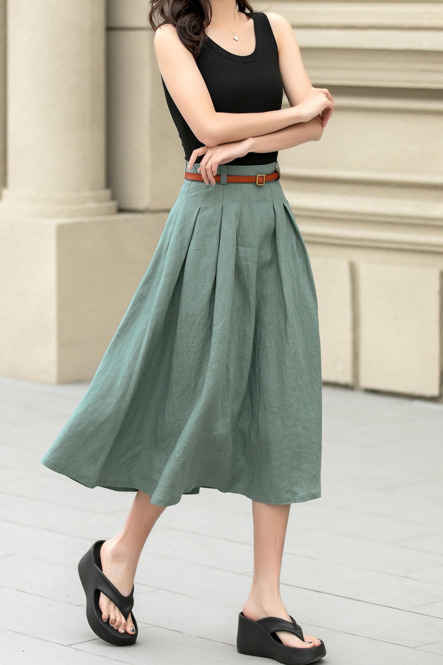 Pleated green midi summer linen skirt 4958
