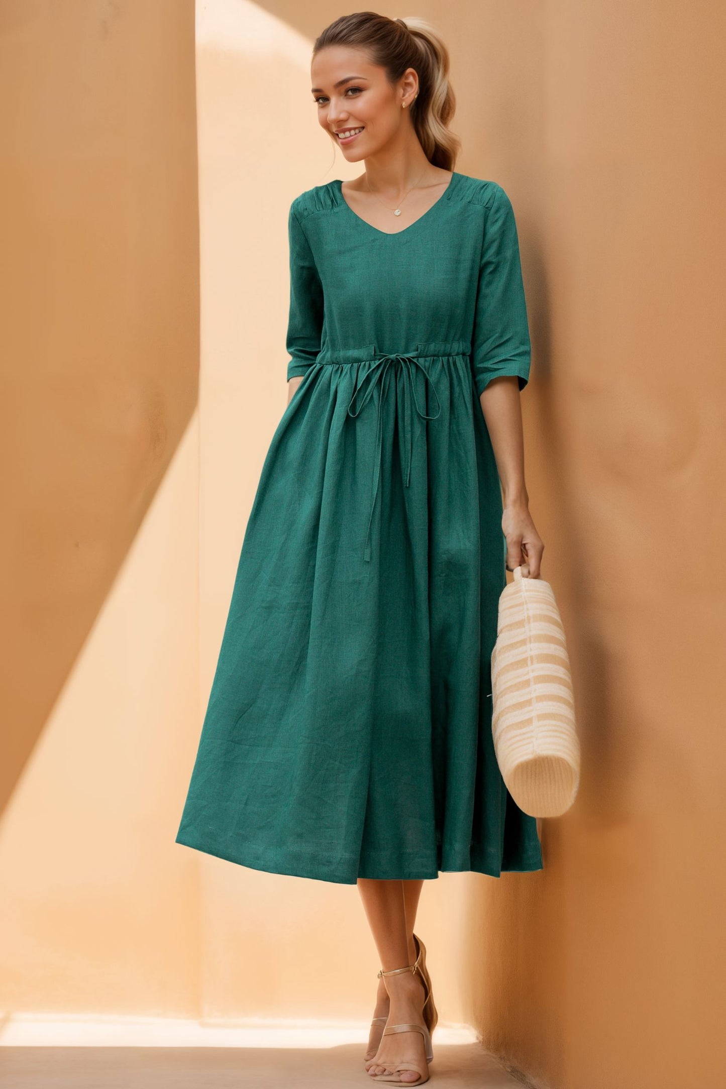 This chic green linen dress is designed with a mid-length cut that elegantly flows with movement.This dress is perfect for a variety of occasions, from casual outings to more formal events.