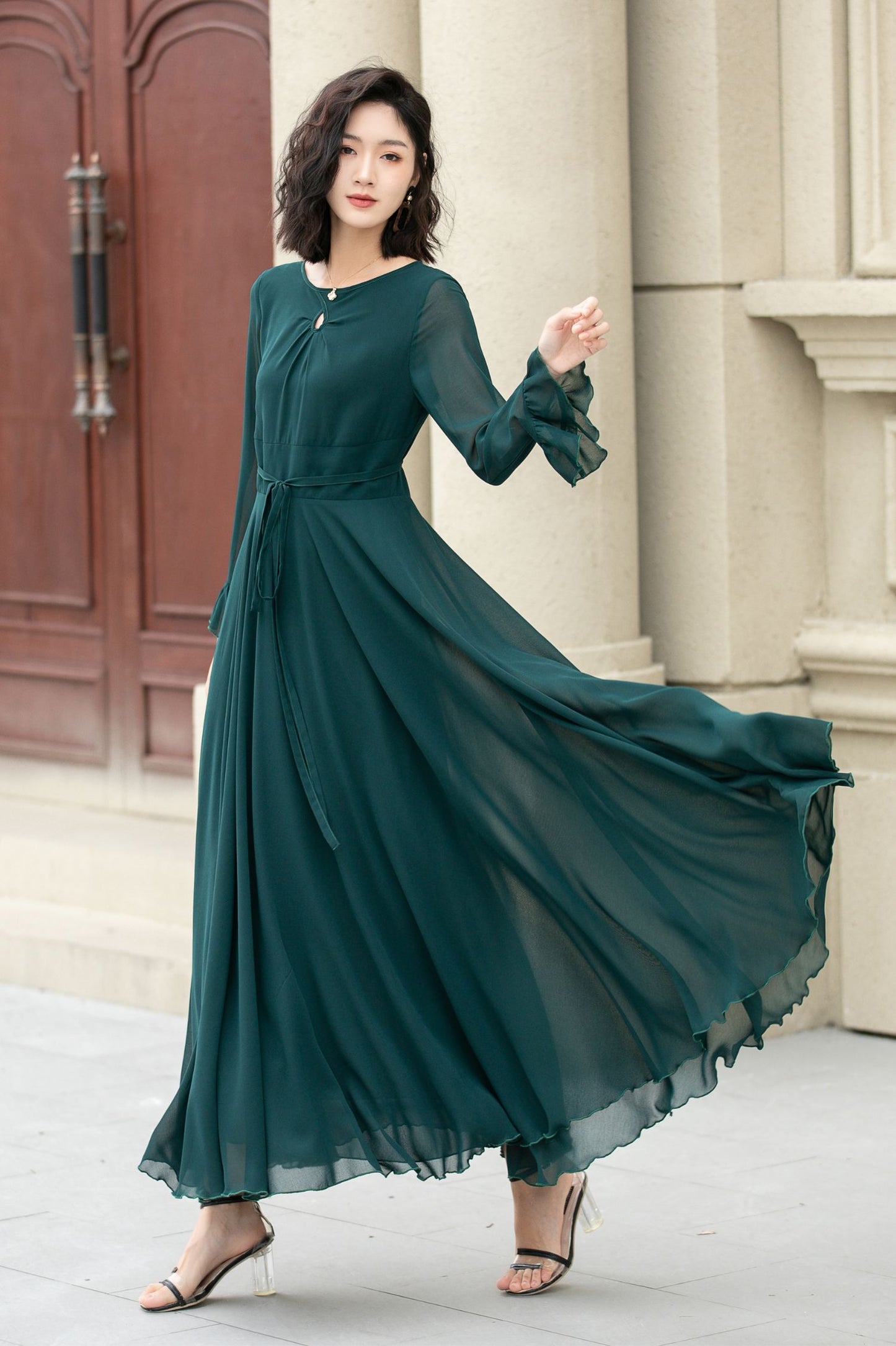 The skirt is the highlight of this dress, with its generous flow and soft waves that gracefully move with the wearer, perfectly capturing the lightweight and airy essence of chiffon. This dress is an embodiment of elegance, perfect for those who appreciate a blend of contemporary design and timeless fashion.
