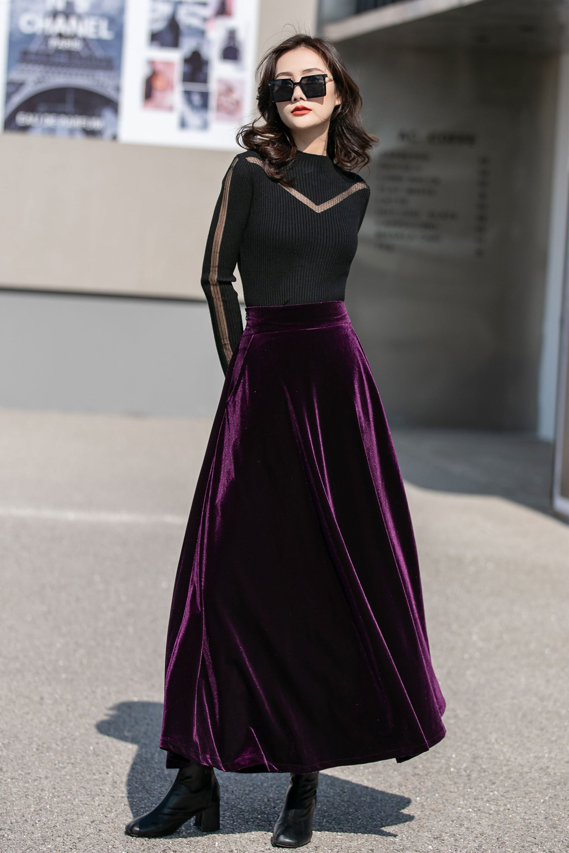 This purple skirt is made of comfortable velvet. You can wear it daily. You can also wear it to parties or dinner parties. This skirt is a good choice.