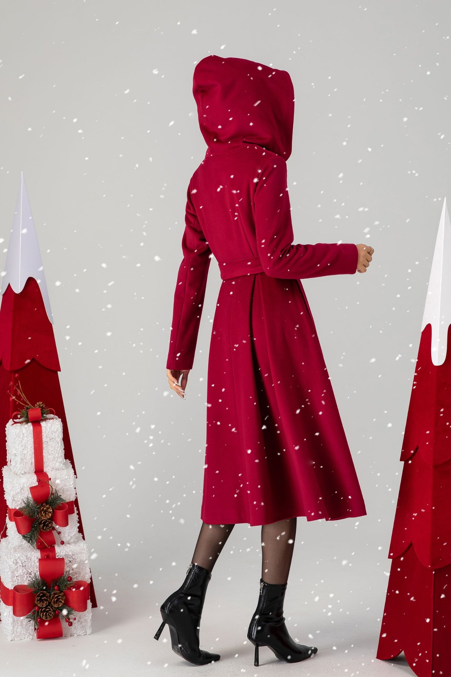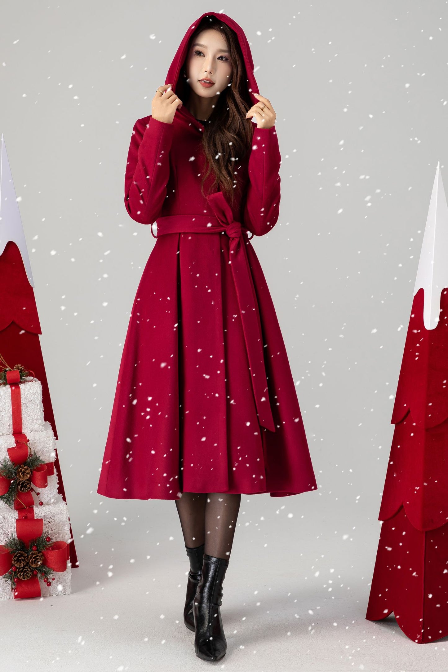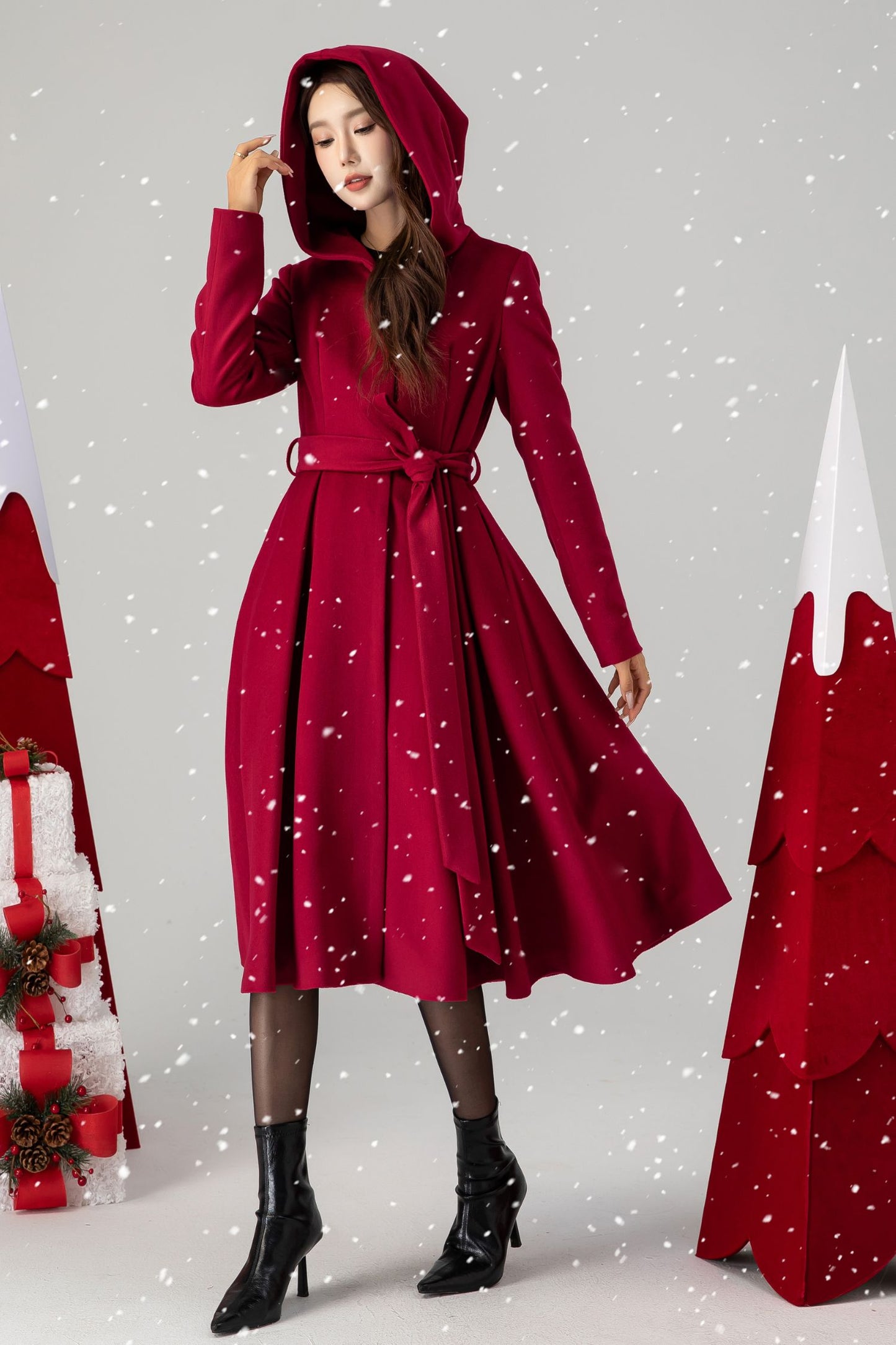 Unveiling our elegant red wool princess coat, with a flattering mid-length silhouette and a captivating hood. This coat seamlessly merges classic princess-inspired design with modern functionality, allowing you to stay warm and stylish. The rich red color is a statement in itself, and the hood adds a touch of versatility to the piece.