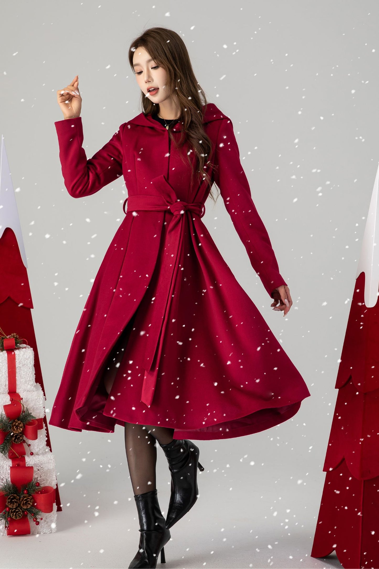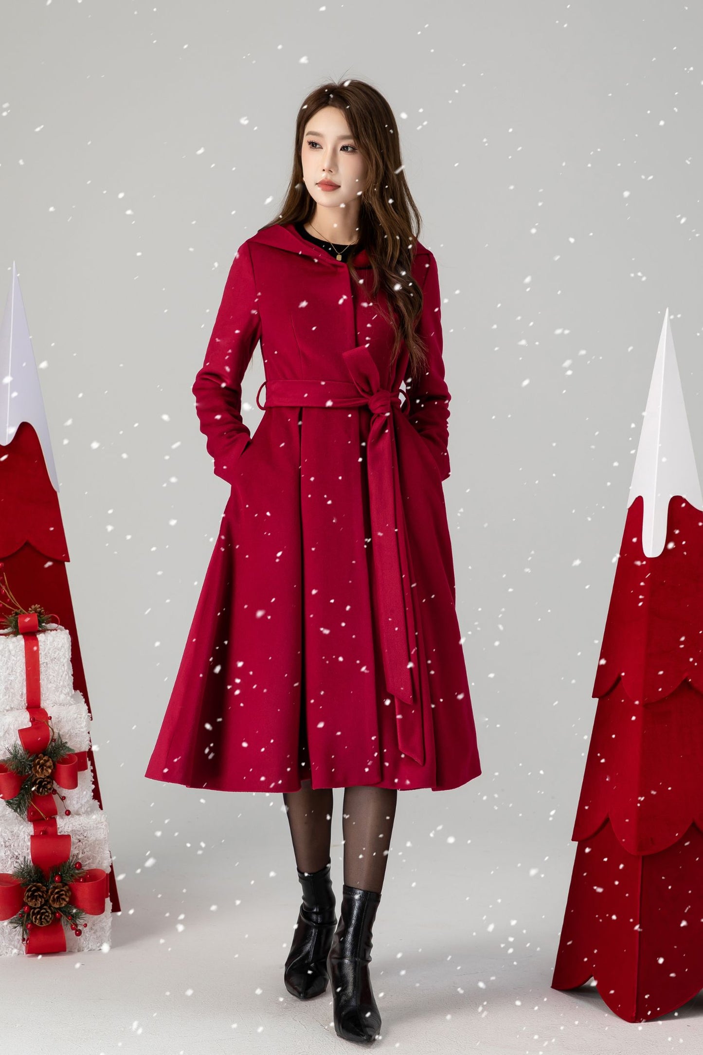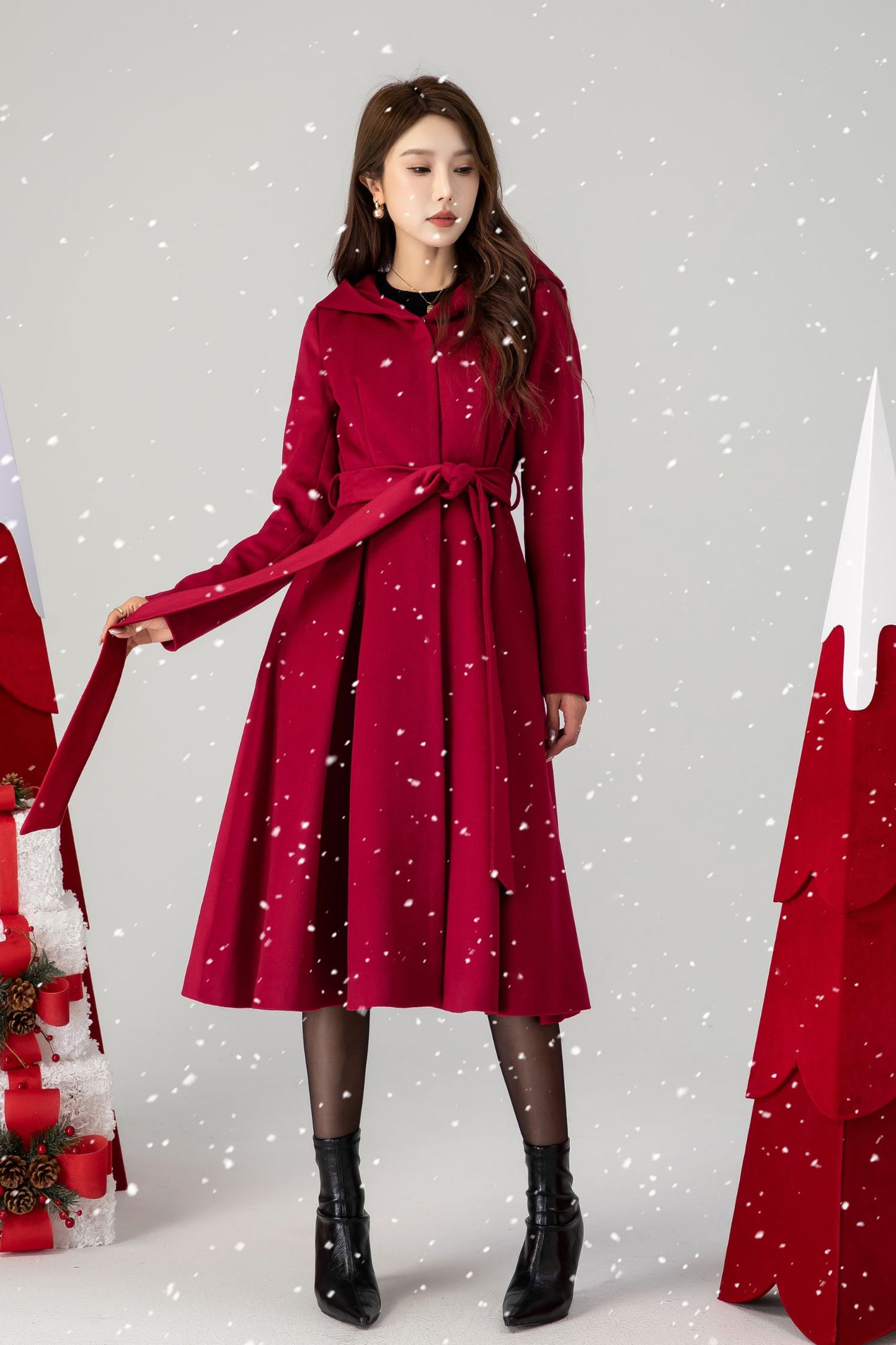 Red hooded long wool coat women 4615