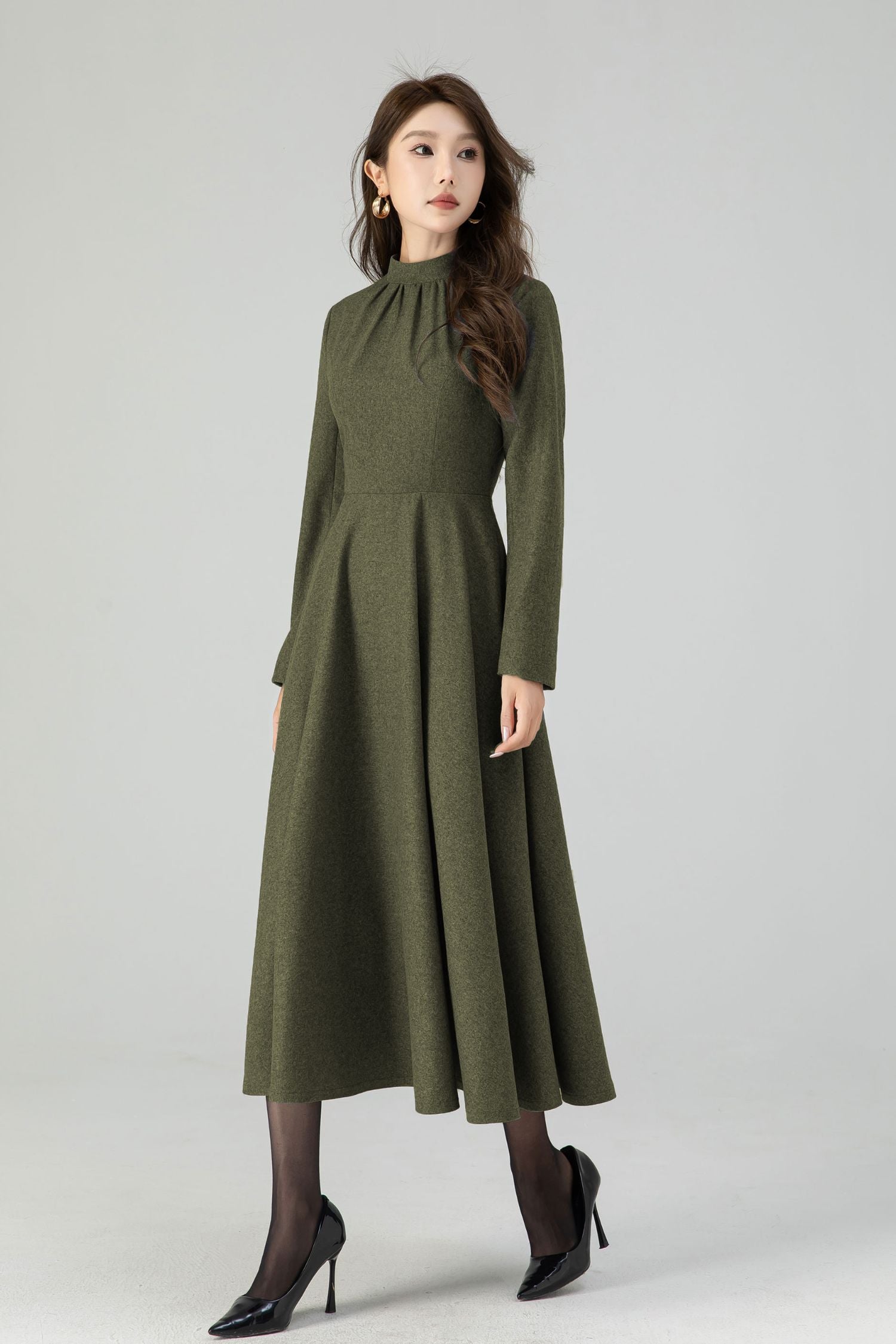 This retro-style swing dress in army green is crafted from warm, durable wool, combining vintage charm with practical comfort. Its flattering silhouette gently flares to create elegant movement, while the rich green hue adds a classic military-inspired touch. Ideal for cooler seasons, this dress offers both style and cozy wearability, making it a refined choice for those who appreciate timeless design with a modern edge.