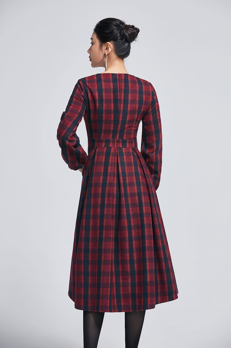 Bring cozy charm to winter days with this handmade red plaid wool dress. Featuring lantern sleeves, a pleated waist, and flowing below-knee length, it combines warmth with vintage elegance. Fully lined in satin for comfort, this dress is ideal for autumn and winter gatherings, offering both sophistication and timeless style.