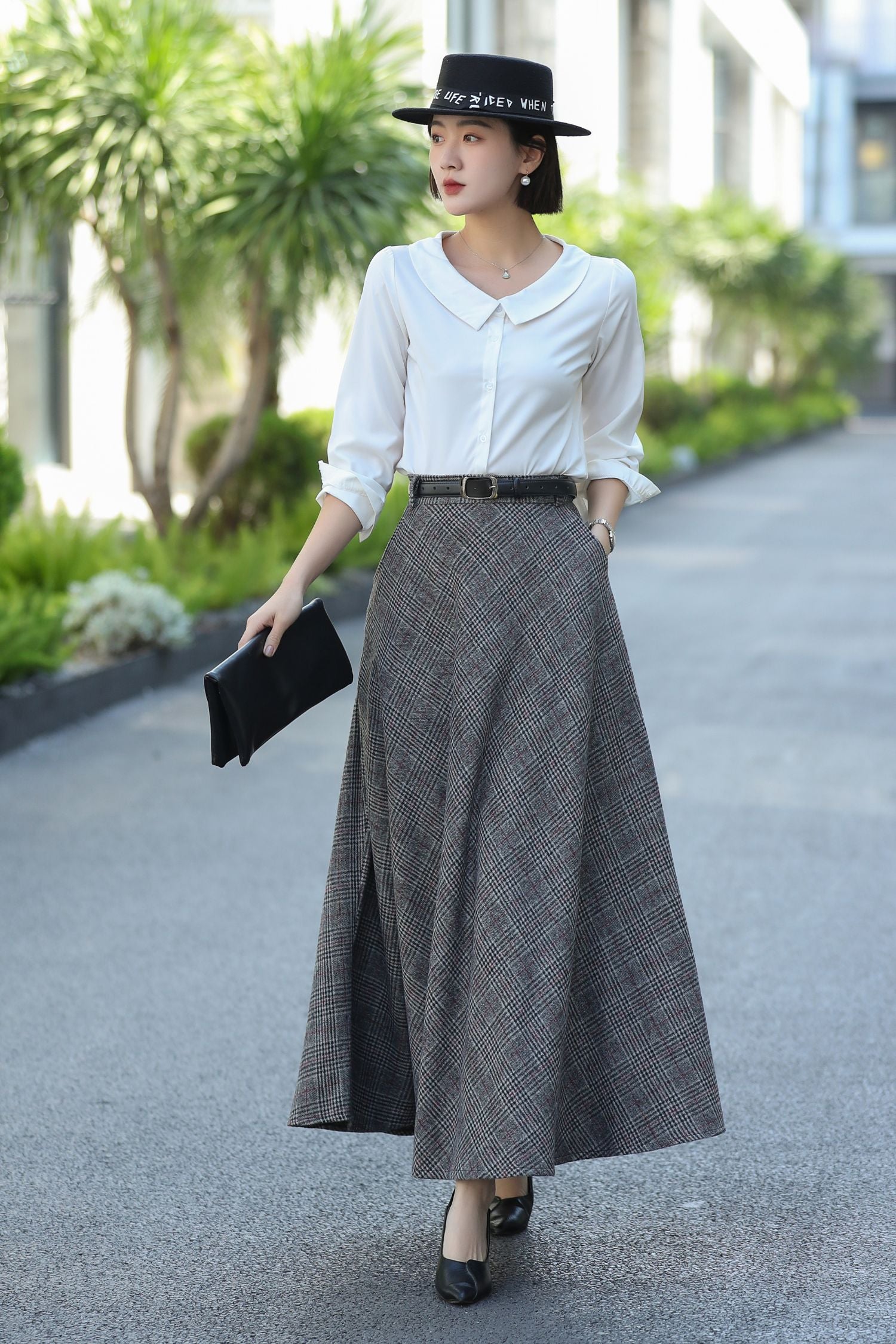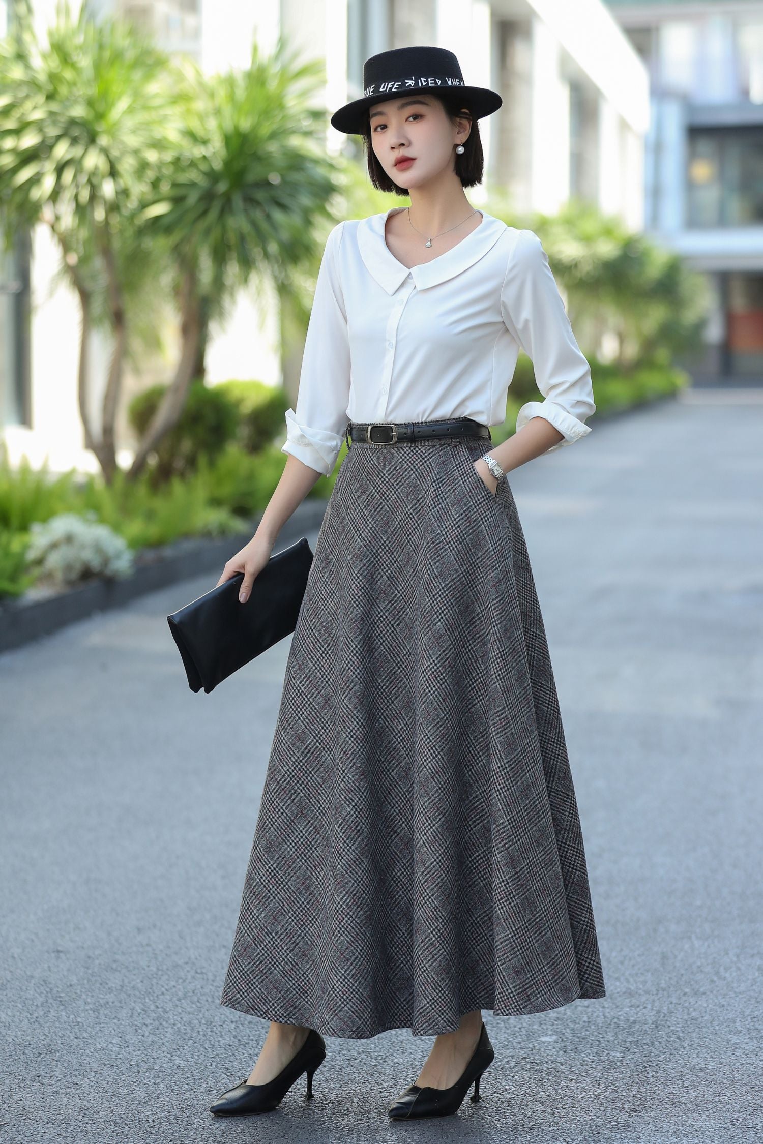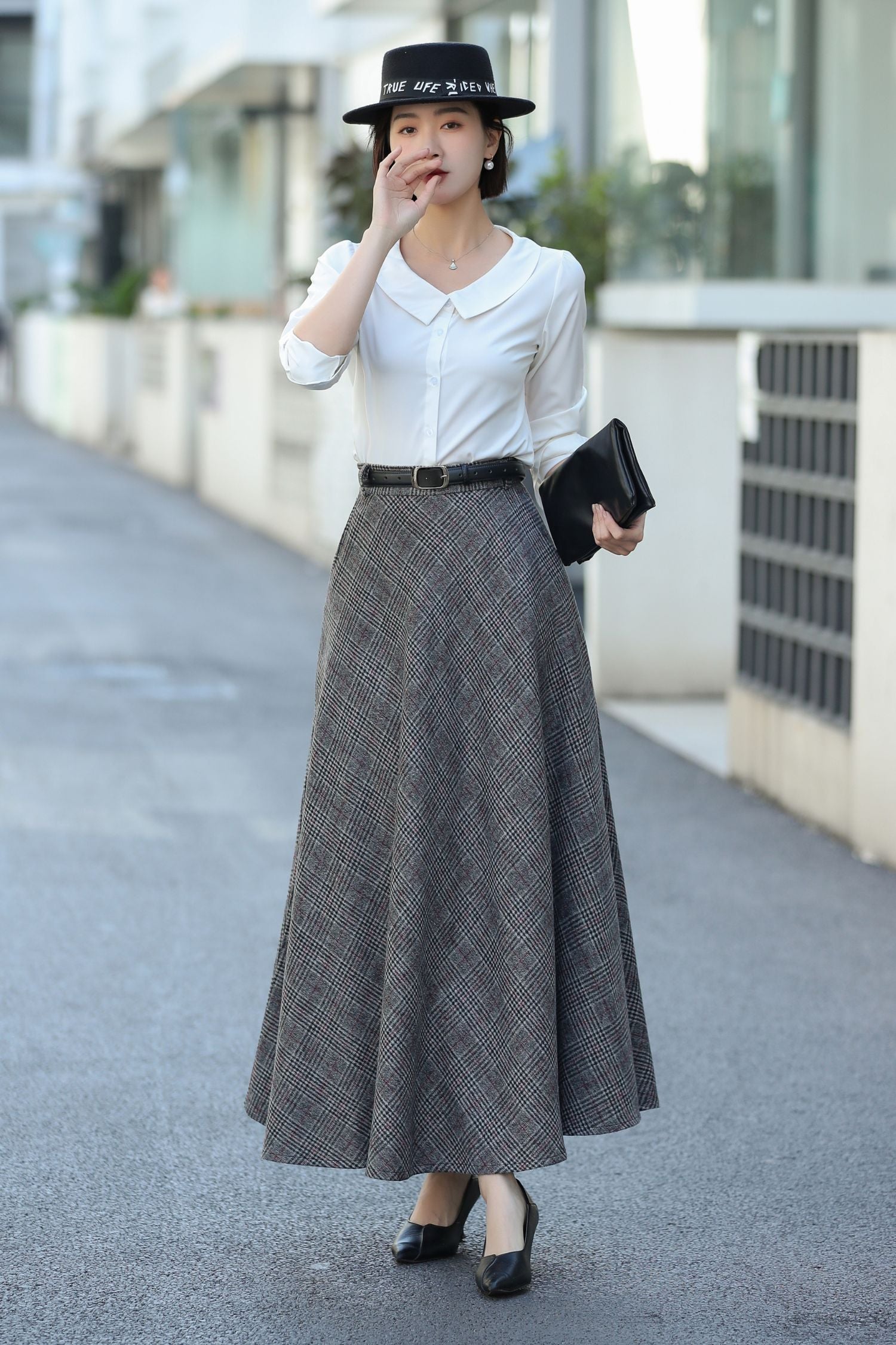 Elevate your winter style with this timeless gray plaid wool maxi skirt. Designed with a flattering high waist and flowing flared silhouette, it captures vintage elegance while offering everyday practicality. Crafted in a warm wool blend with a satin lining, side pockets, and a touch of stretch at the back waist, this skirt is both comfortable and versatile—perfect for festive gatherings, office wear, or casual autumn outings.