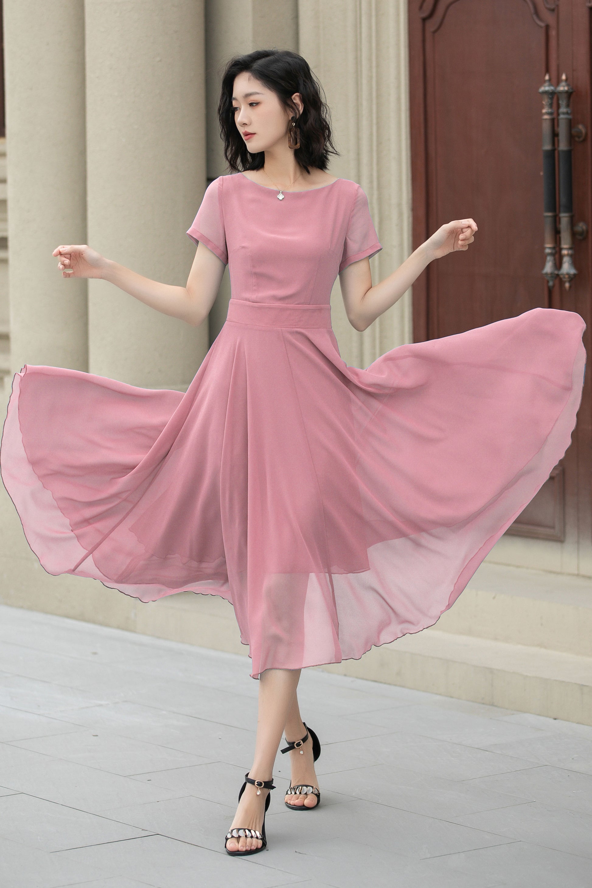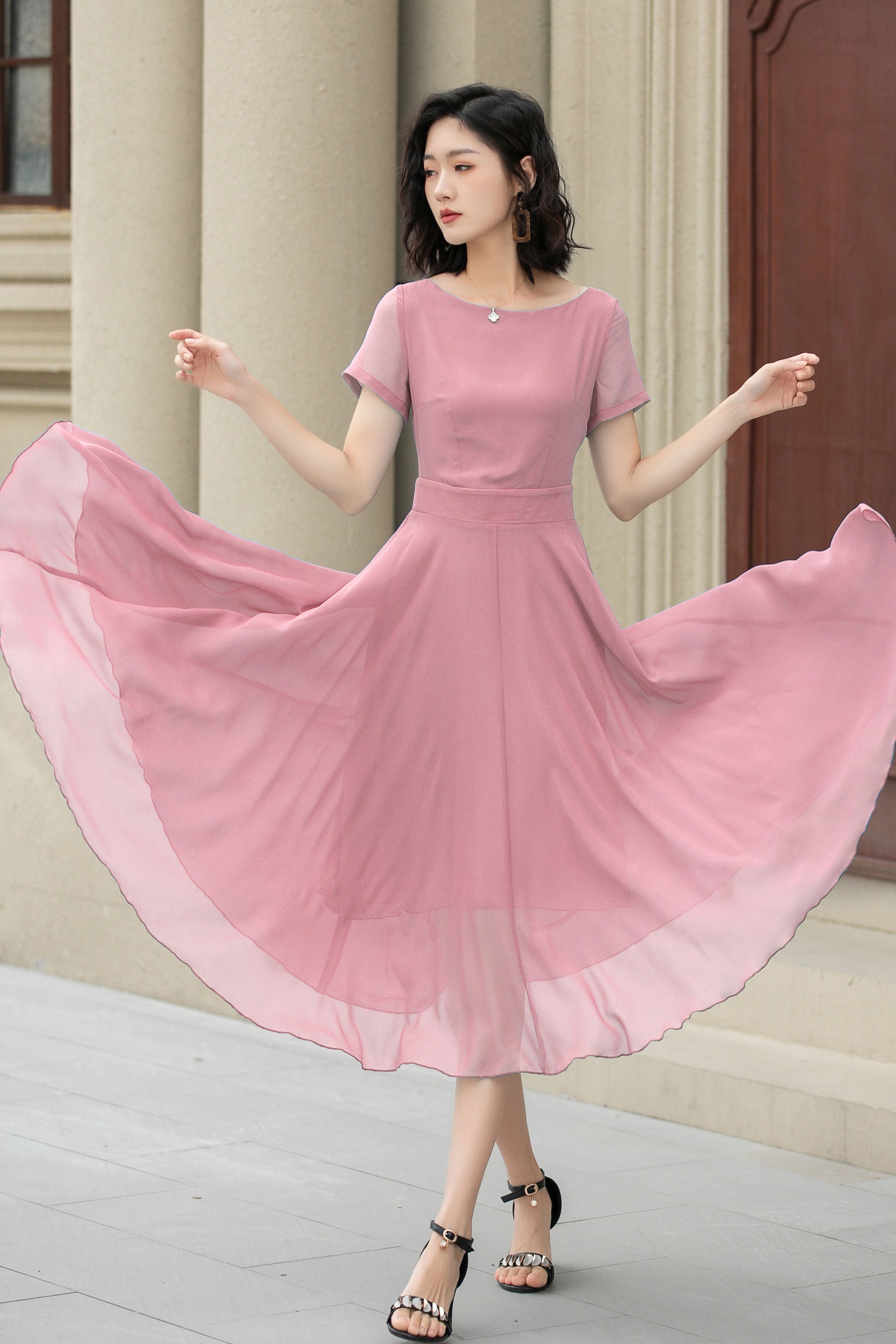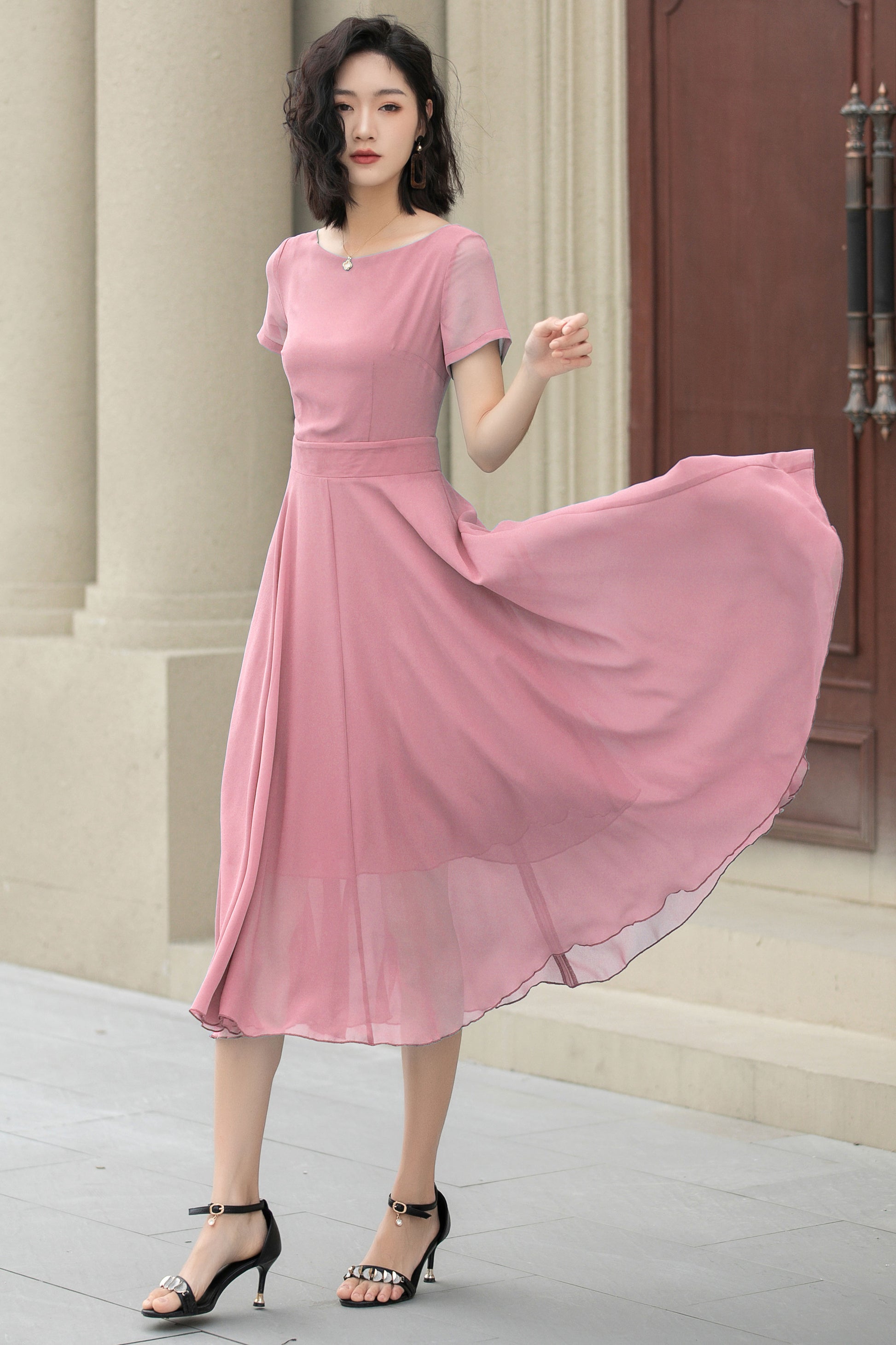 This chiffon dress is a charming choice for wedding - related events. Its soft pink shade exudes a sweet and romantic vibe. The round neck and short sleeves offer a classic look, while the waist - defining design flatters the silhouette. The full, flowing skirt creates a dreamy effect as you move. Ideal for wedding guests or as a bridesmaid dress to ensure you shine on the special day.