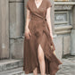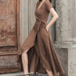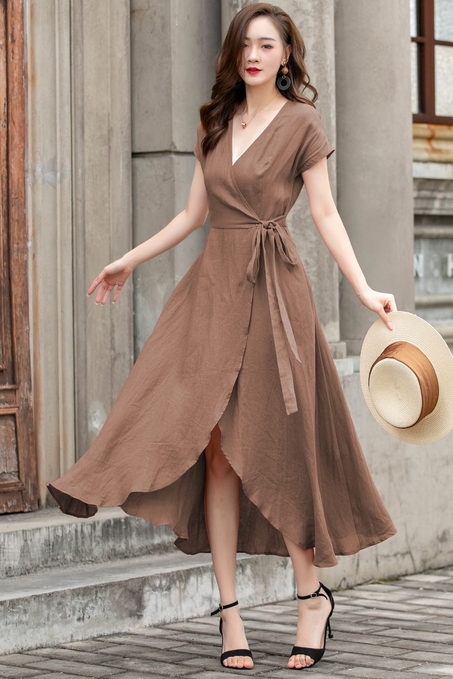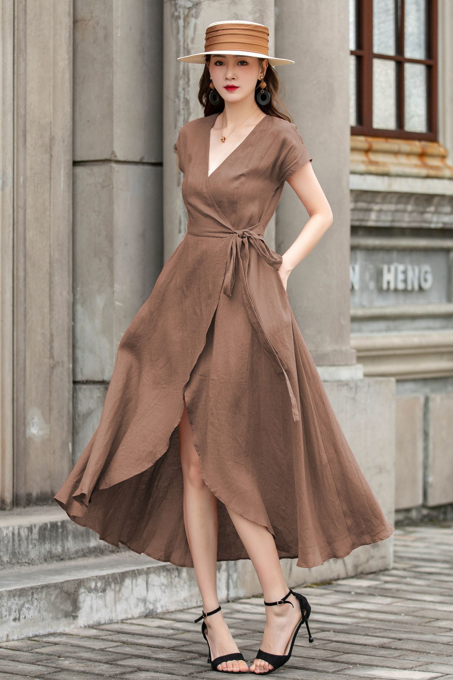 Embrace timeless elegance with this handmade brown linen wrap dress. Featuring a flattering V-neckline and flowy A-line silhouette, it brings out a graceful vintage charm while keeping you cool through warm summer days. The natural linen fabric offers both comfort and sophistication, making it the perfect piece for garden parties, vacations, or casual city strolls.