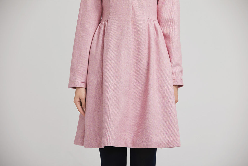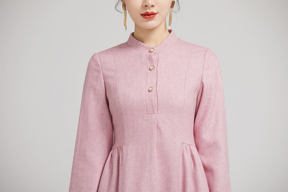 This fitted wool dress has front pearl buckle that looks interesting and are also practical. It is closed with a zipper at the back. This piece looks great with both flats and heels.