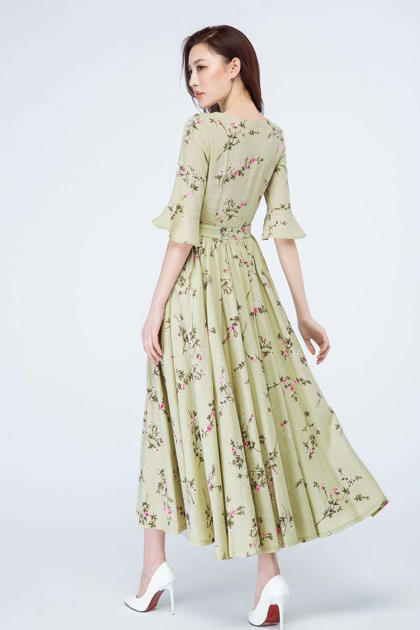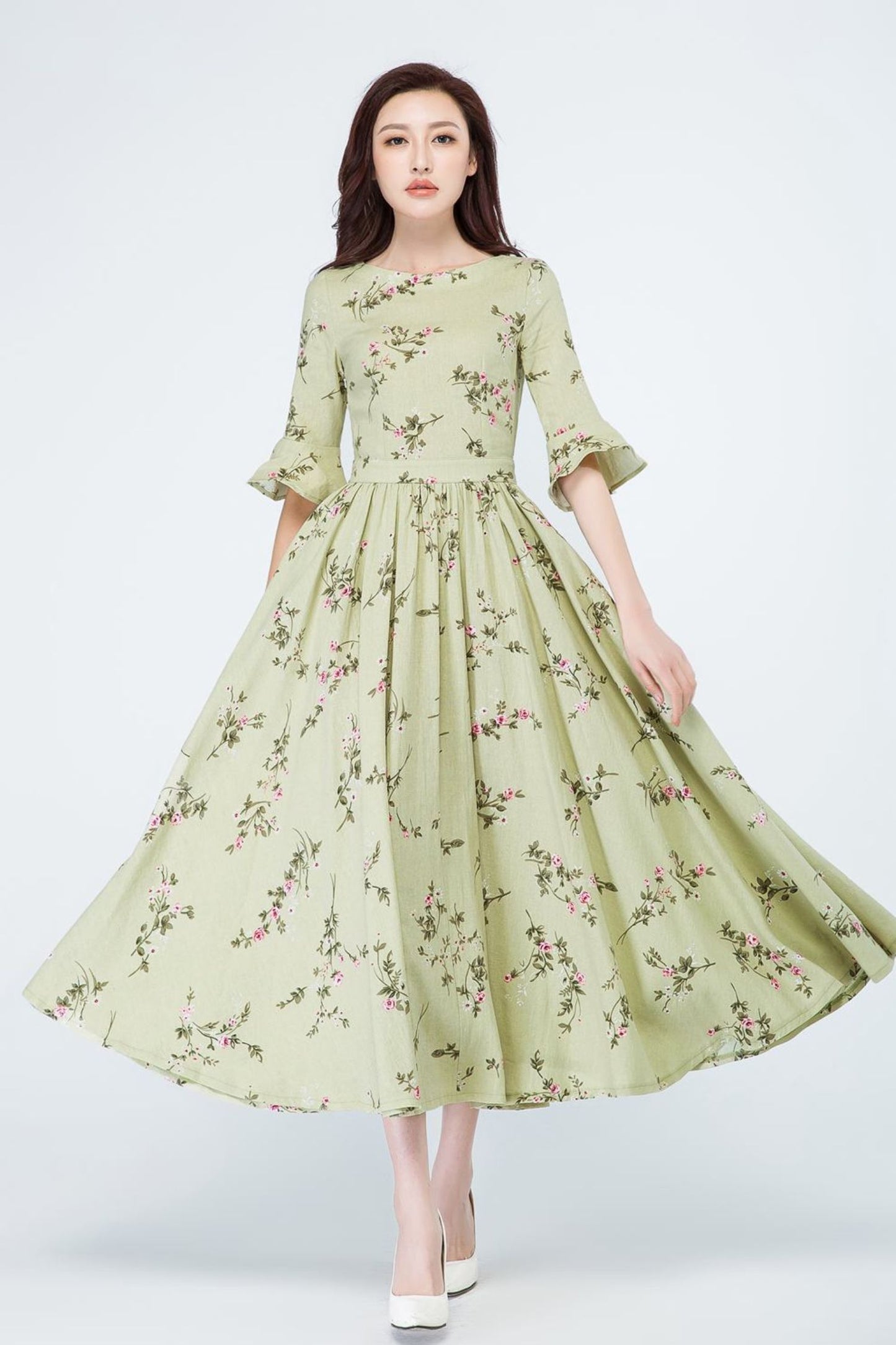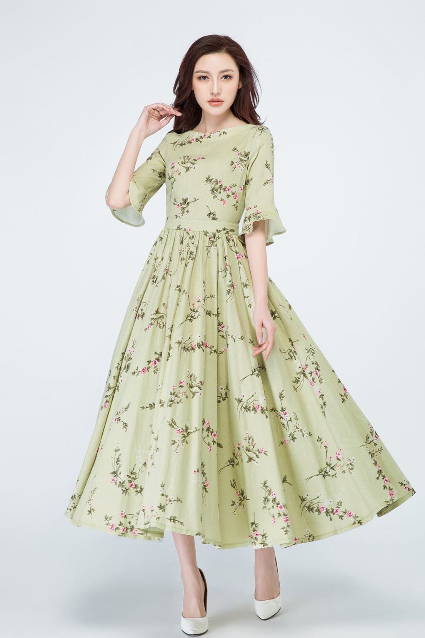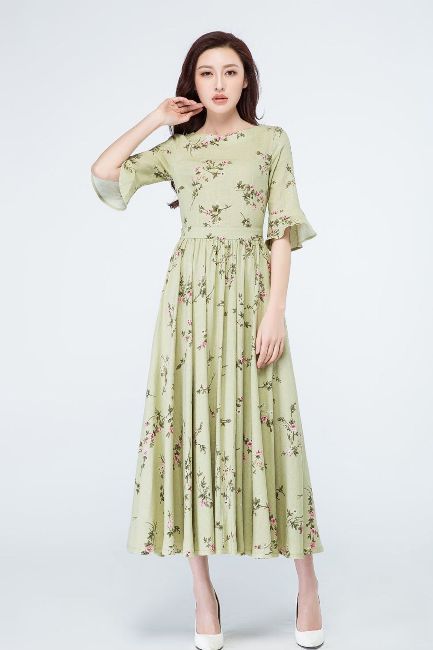 Spring has sprung in this long linen dress from Xiaolizi. The garden party dress built from a floral fabrication with a defined waist. The green bridesmaid dress topped with a round neckline + ruffled elbow length sleeves. The pleated dress finished with a high-rise long skirt.