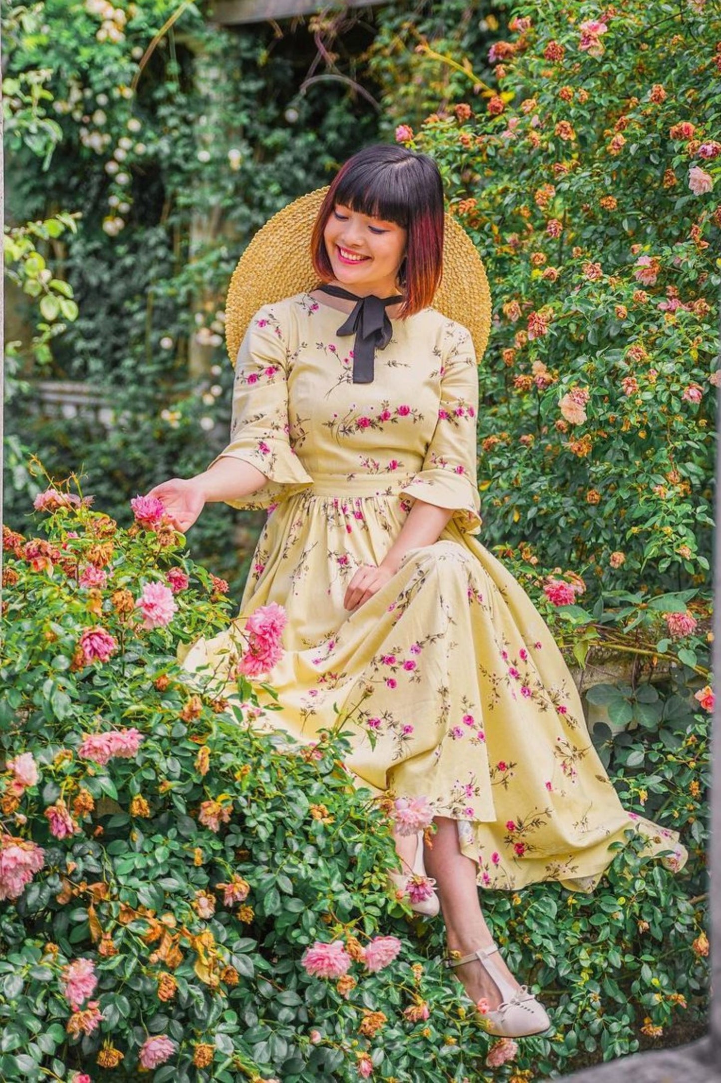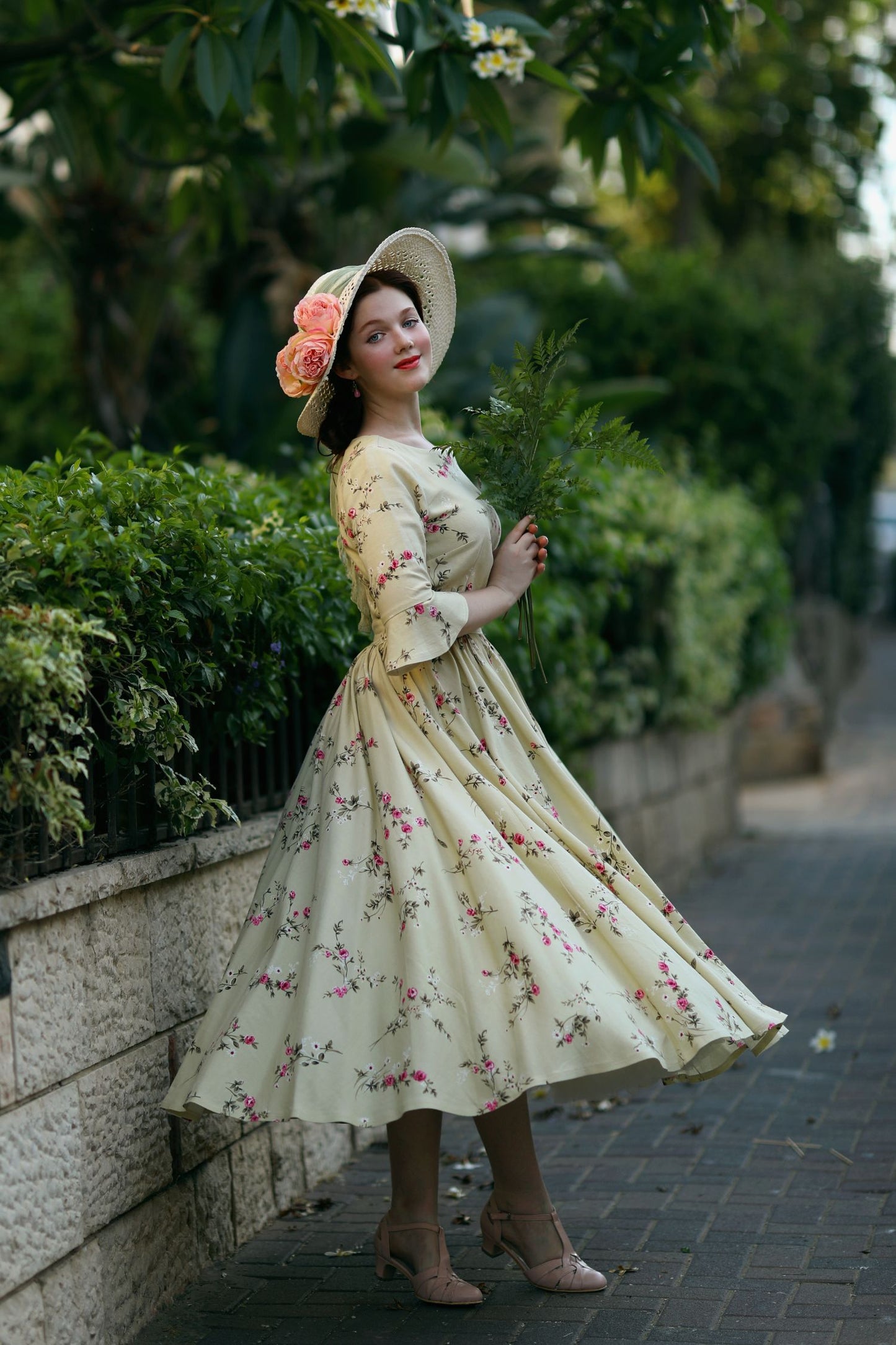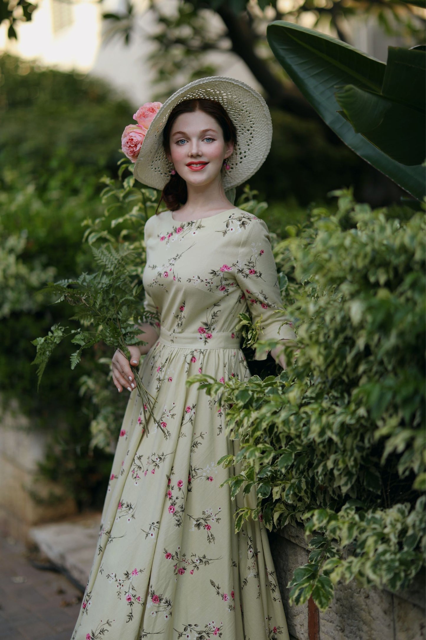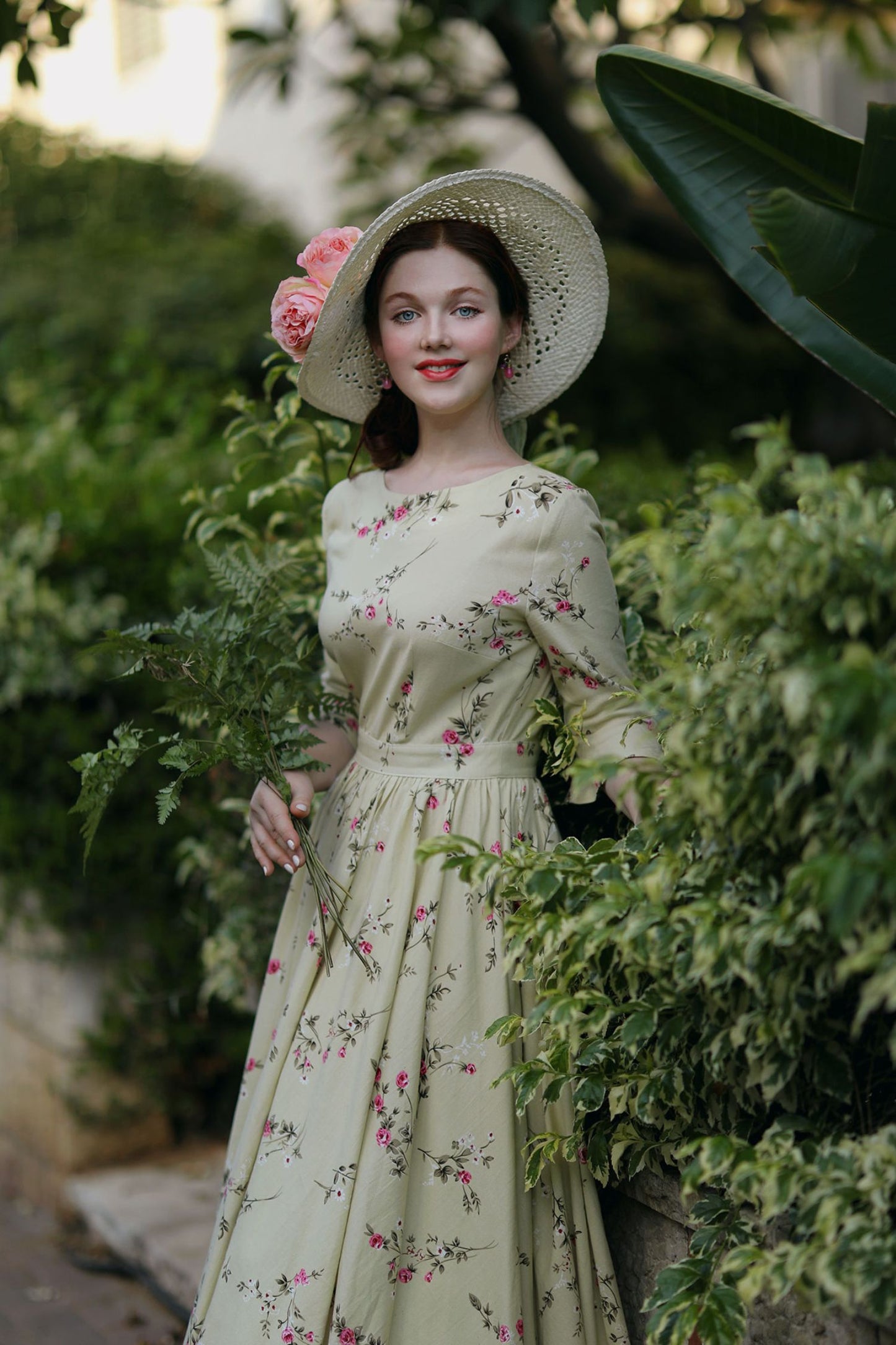 Spring has sprung in this long linen dress from Xiaolizi. The garden party dress built from a floral fabrication with a defined waist. The green bridesmaid dress topped with a round neckline + ruffled elbow length sleeves. The pleated dress finished with a high-rise long skirt.