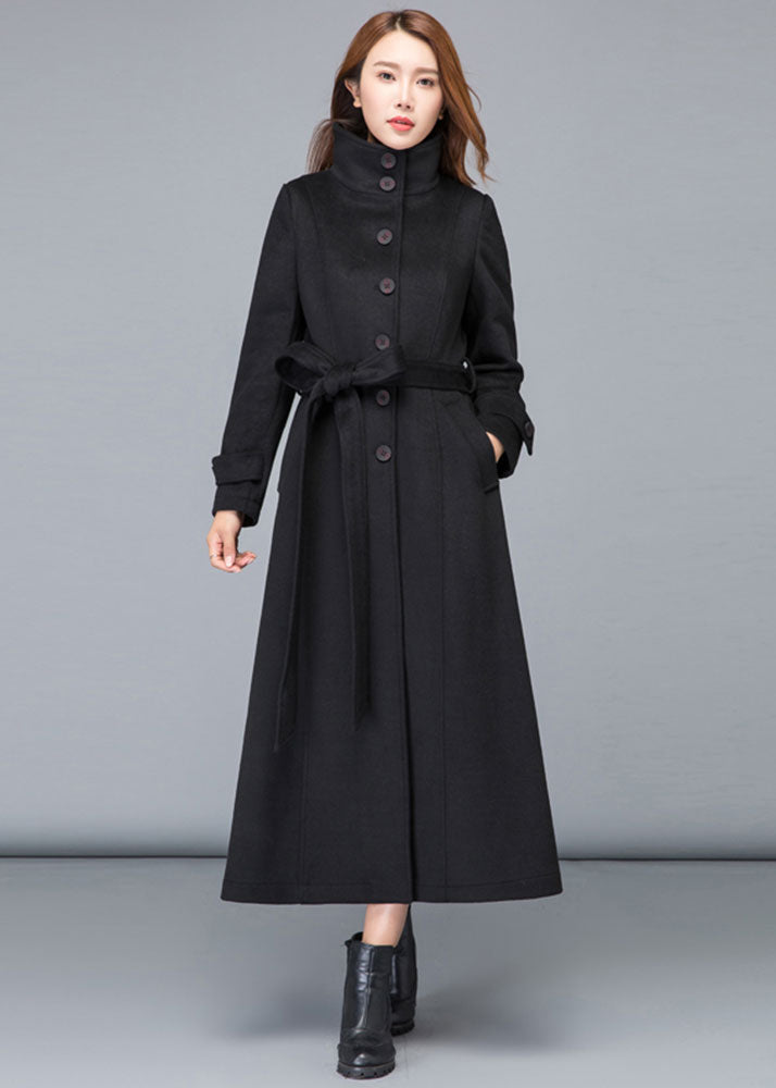 Black stand collar single breasted long wool coat 2478