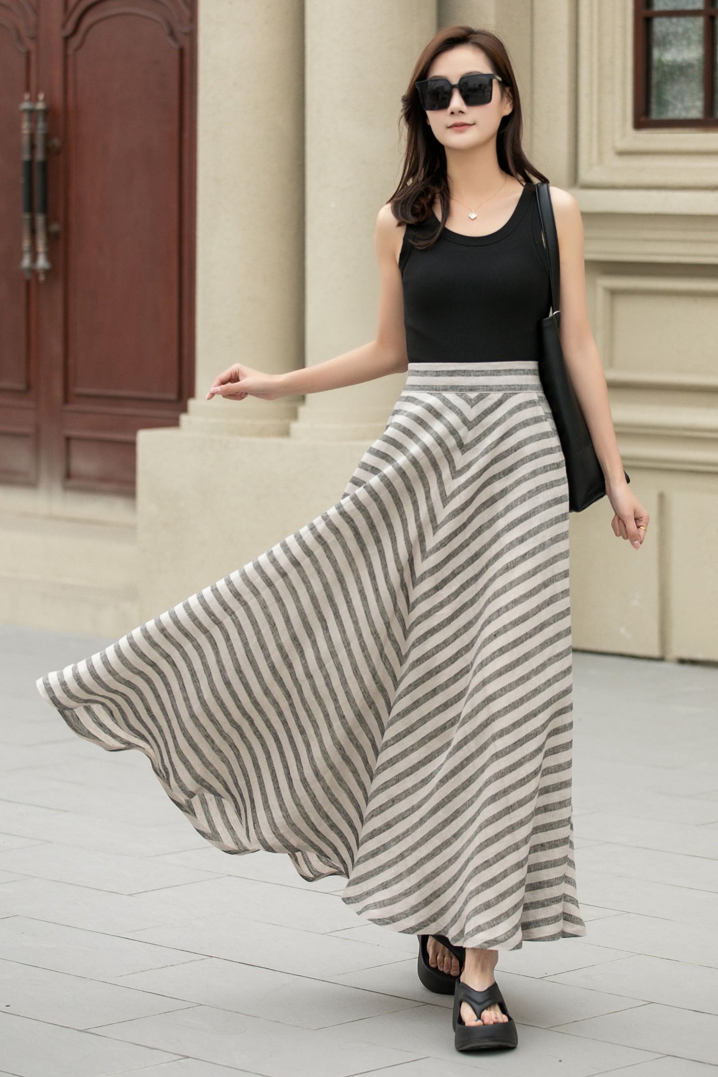 This chic and stylish linen skirt features a striped pattern, adding a dynamic visual element to the design. The long, flowing cut ensures a graceful silhouette. Accessorized with a black shoulder bag and platform sandals, this ensemble is perfect for a variety of outdoor settings, offering both comfort and fashion-forward appeal.