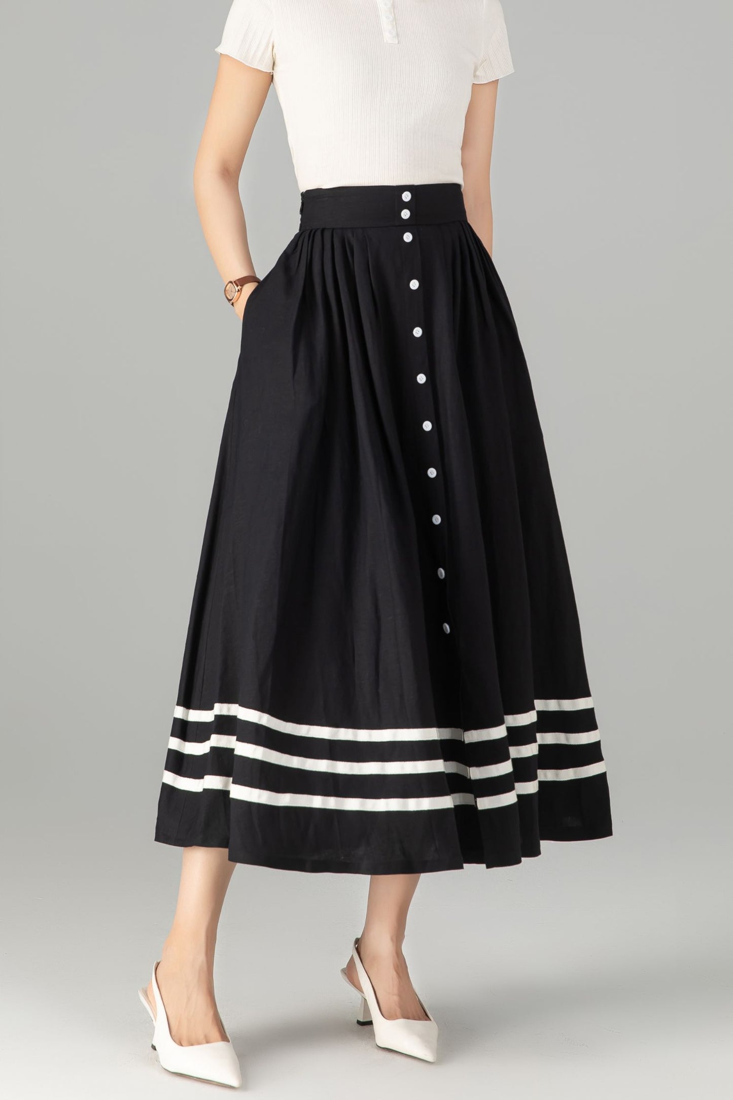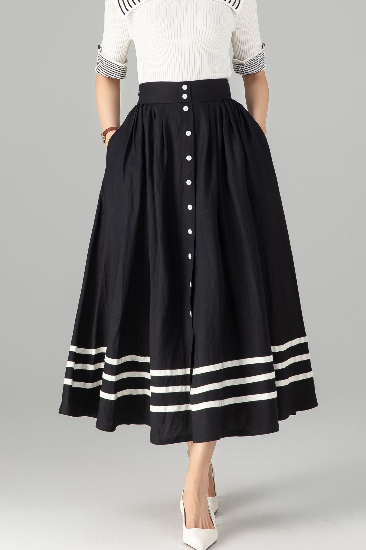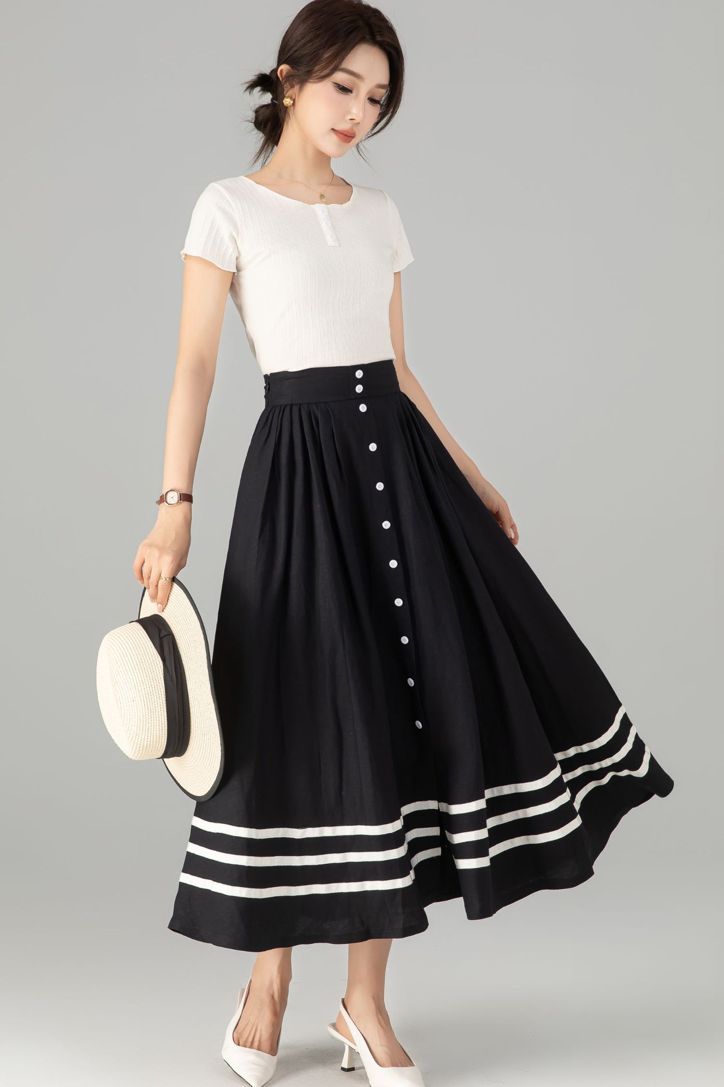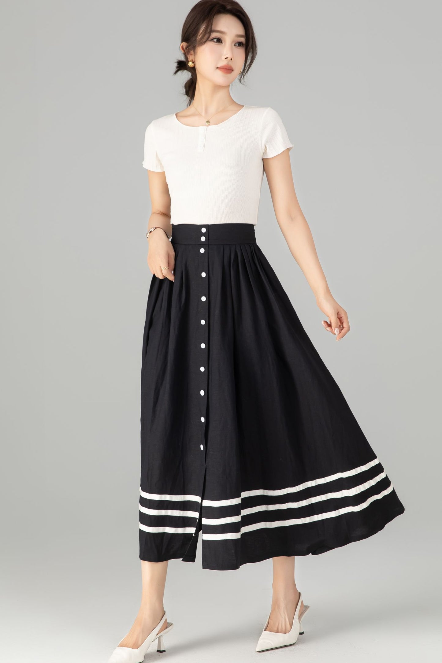 Stylish Button-Up Linen Skirt with Striped Hem 5712