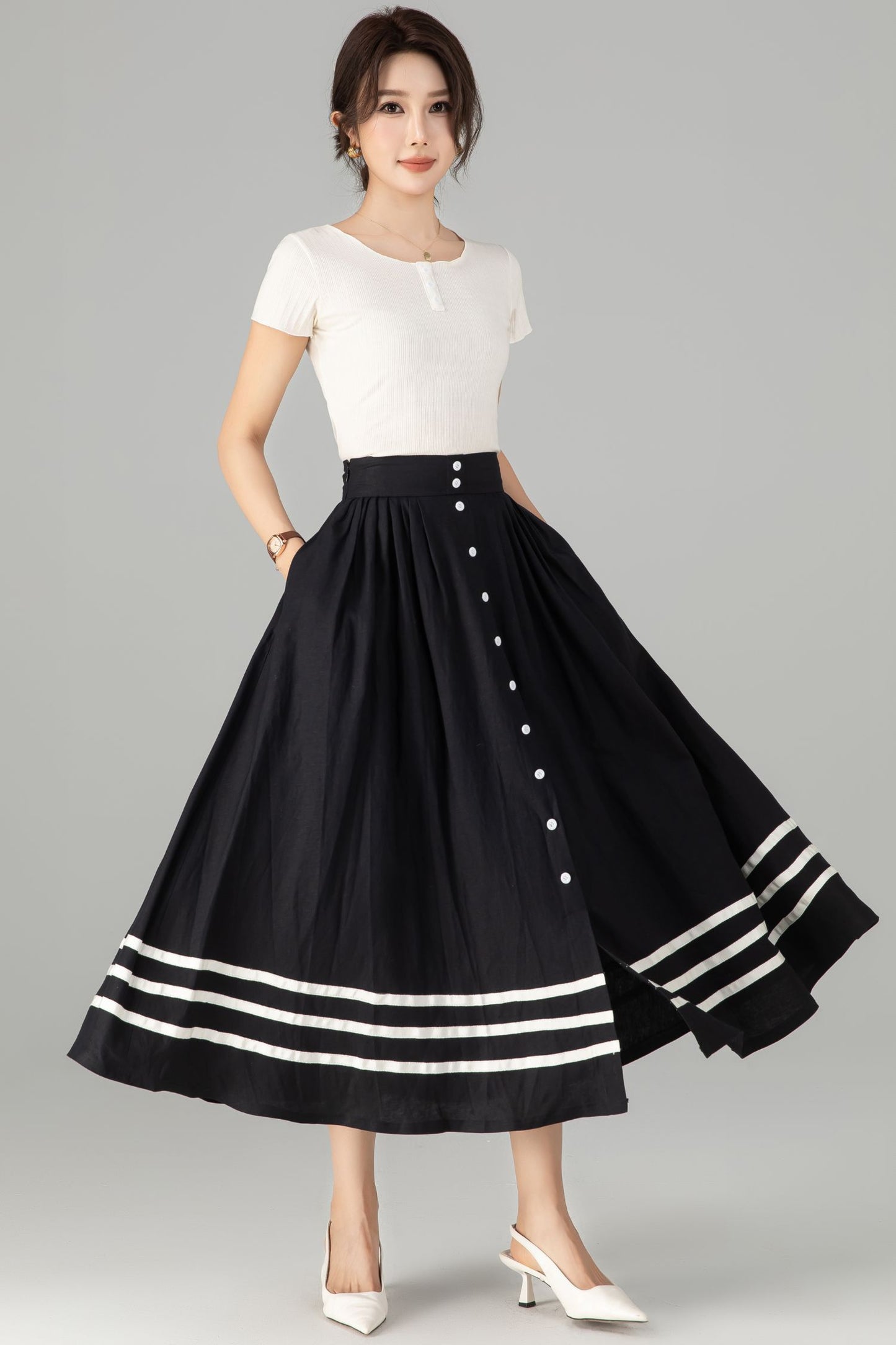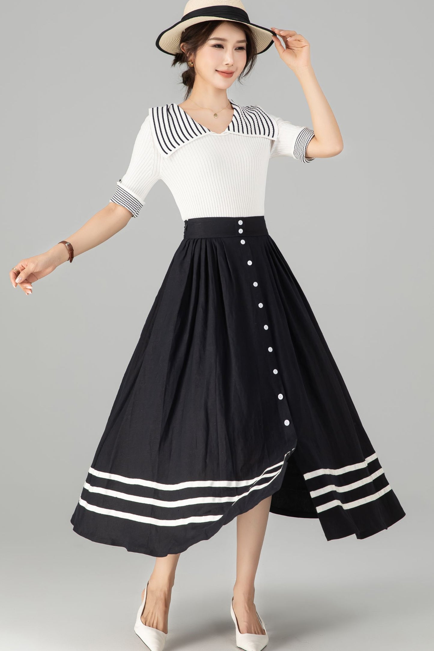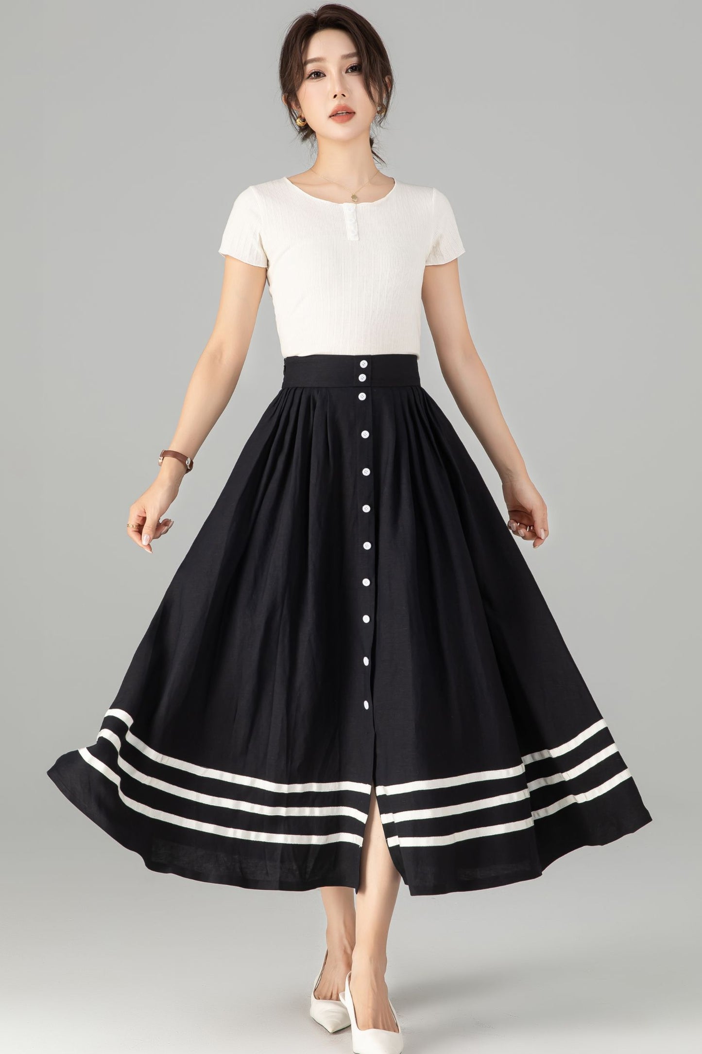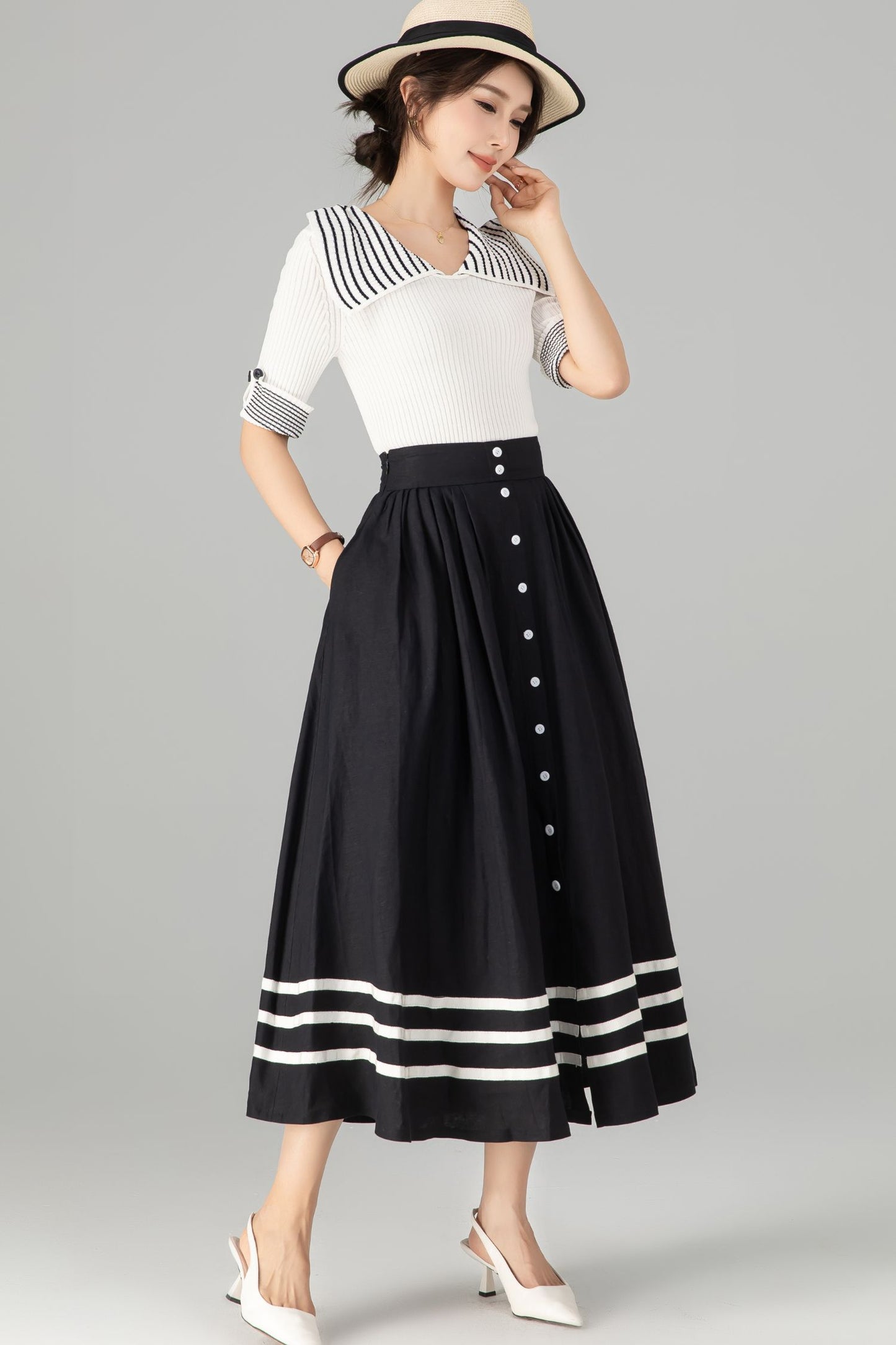 Stylish Button-Up Linen Skirt with Striped Hem 5712