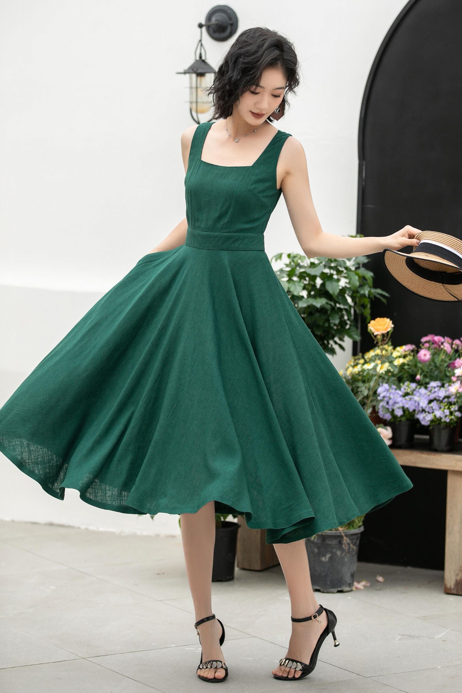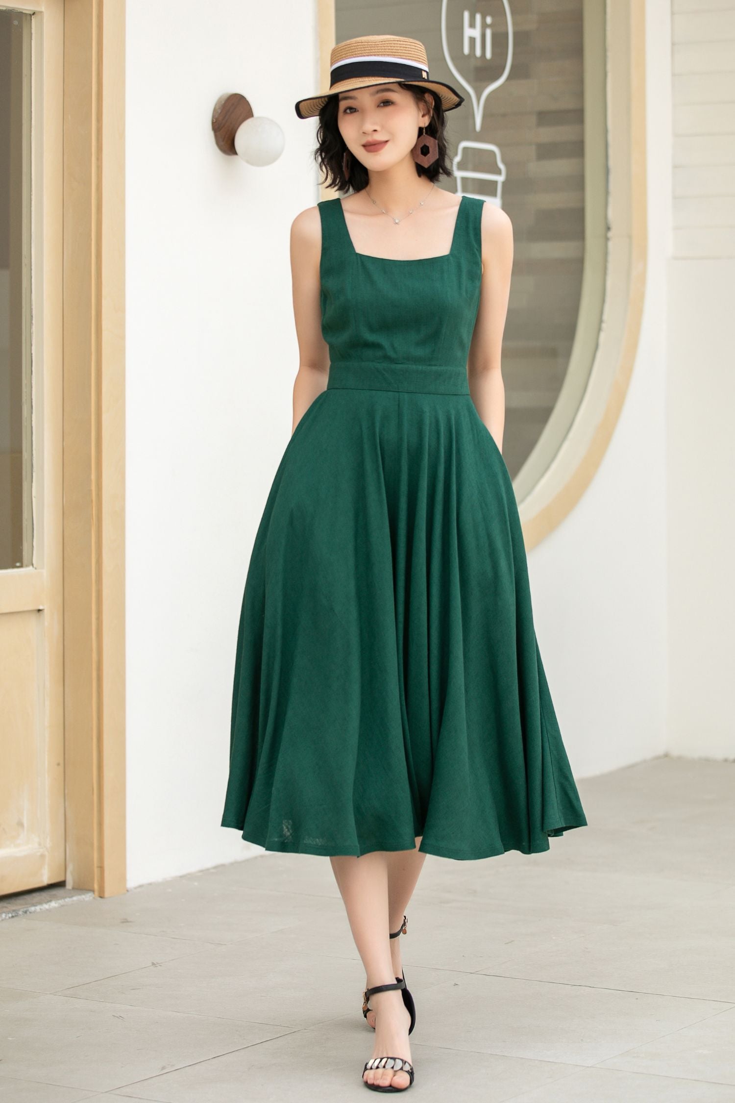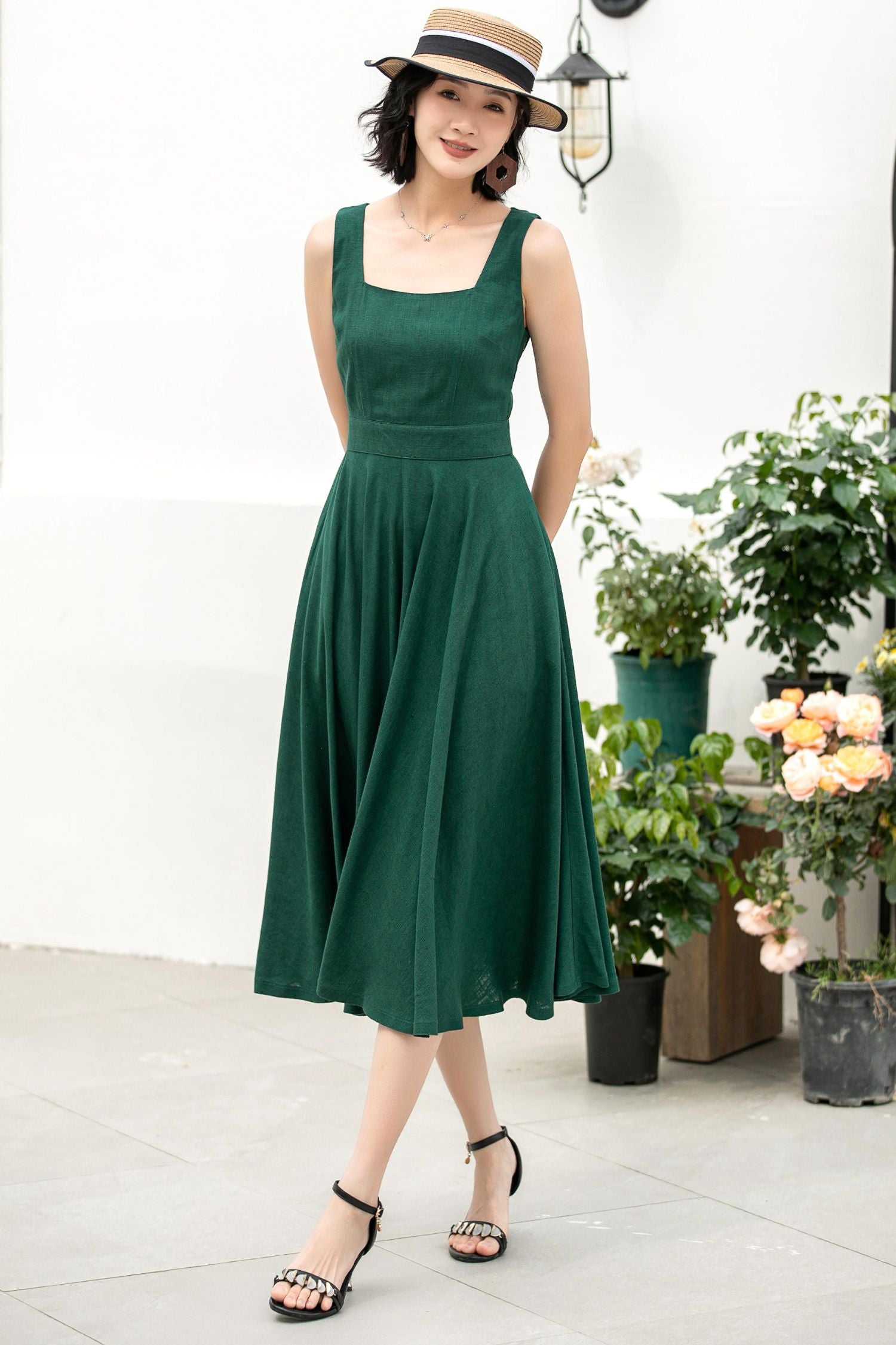 Stylish Deep Green A-Line Linen Suspender Dress with Square Neckline 5860