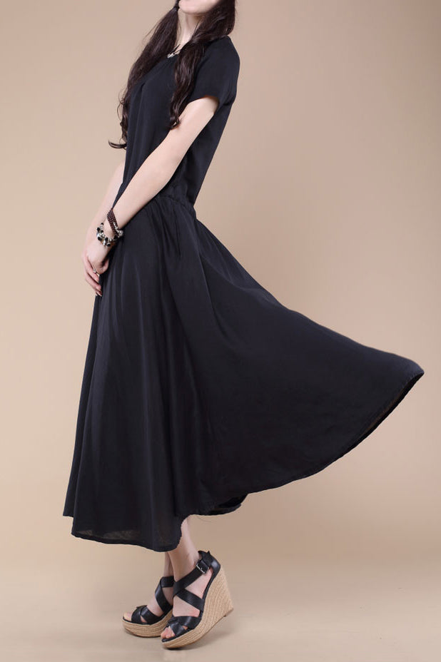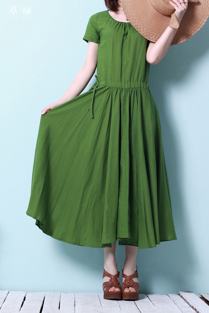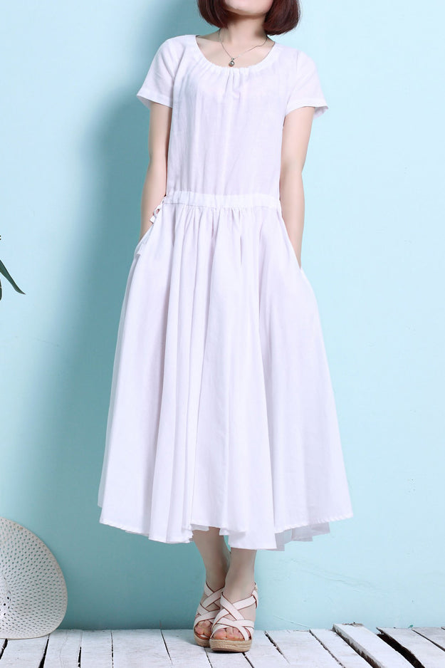 Summer Cotton Linen Short Sleeve Women Midi Dress 3687