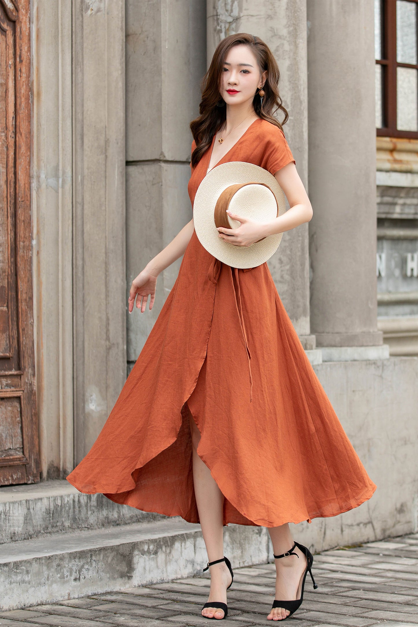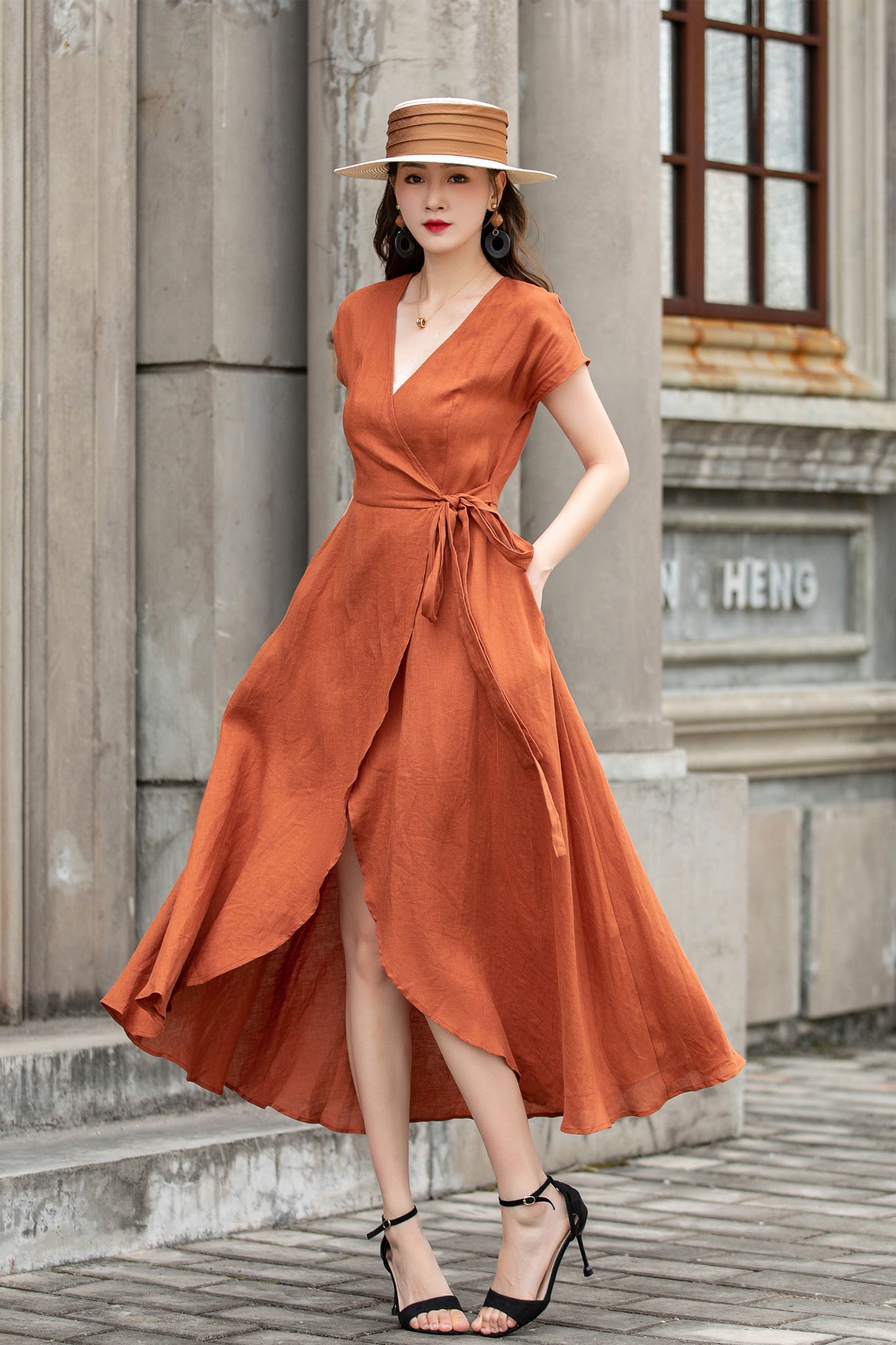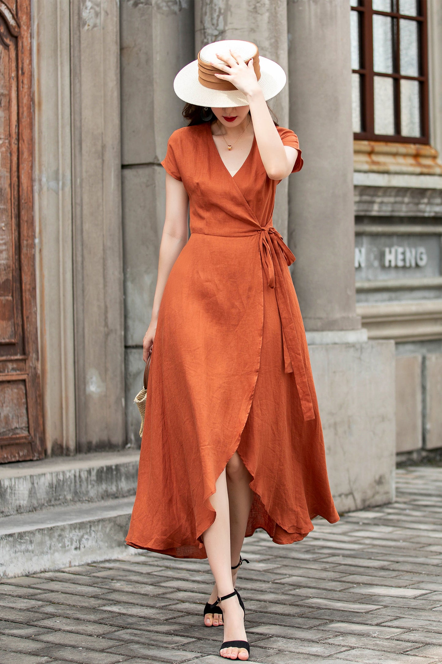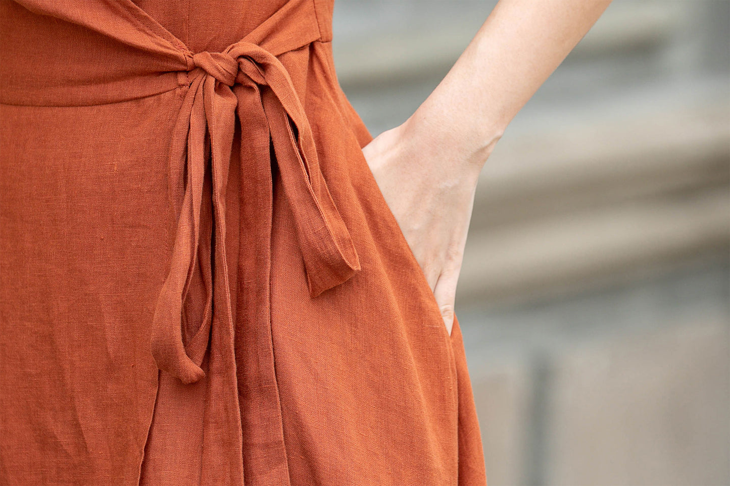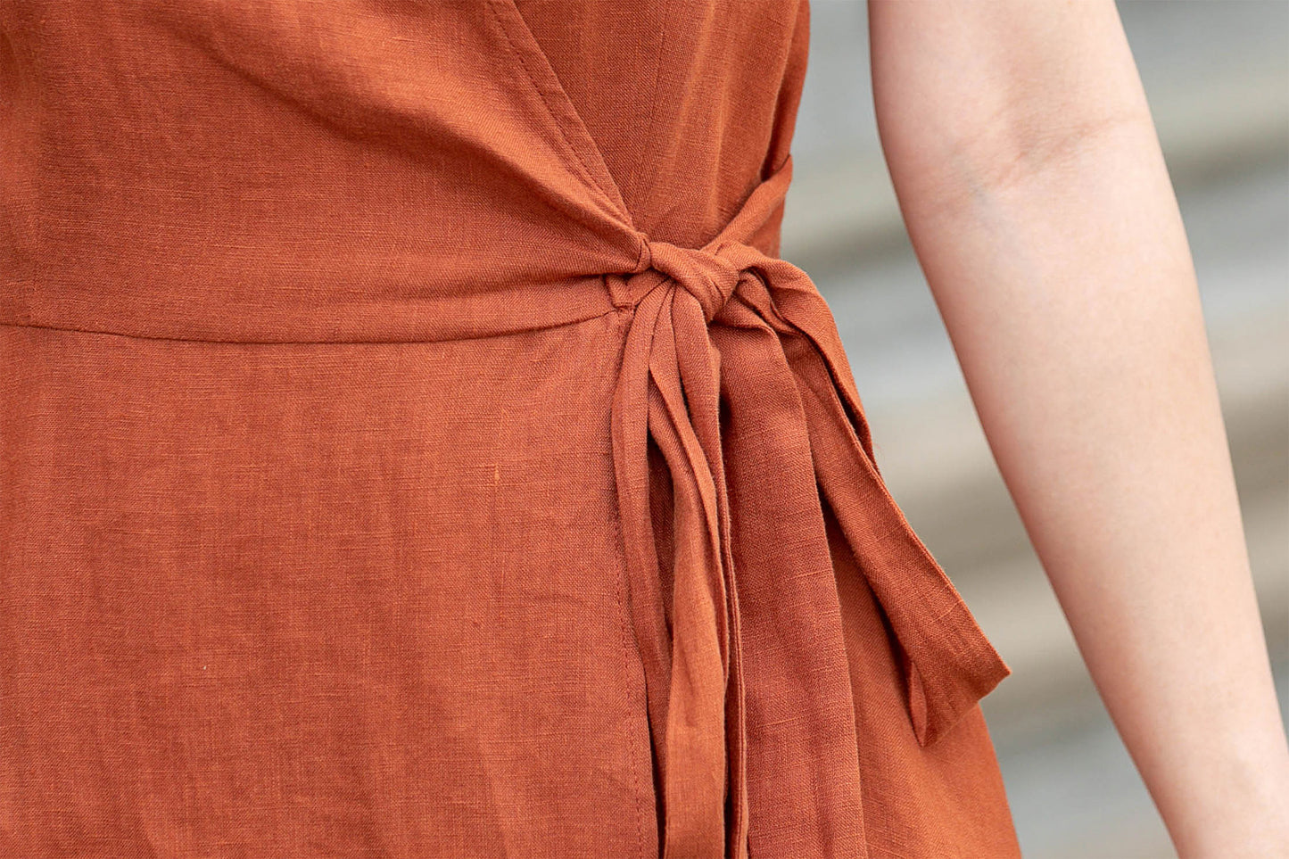 Handmade Linen Wrap Dress | Rust Orange Midi 4287