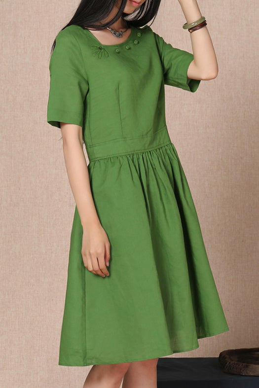Summer Pure Color Short Sleeve Cotton Linen Dress 3690