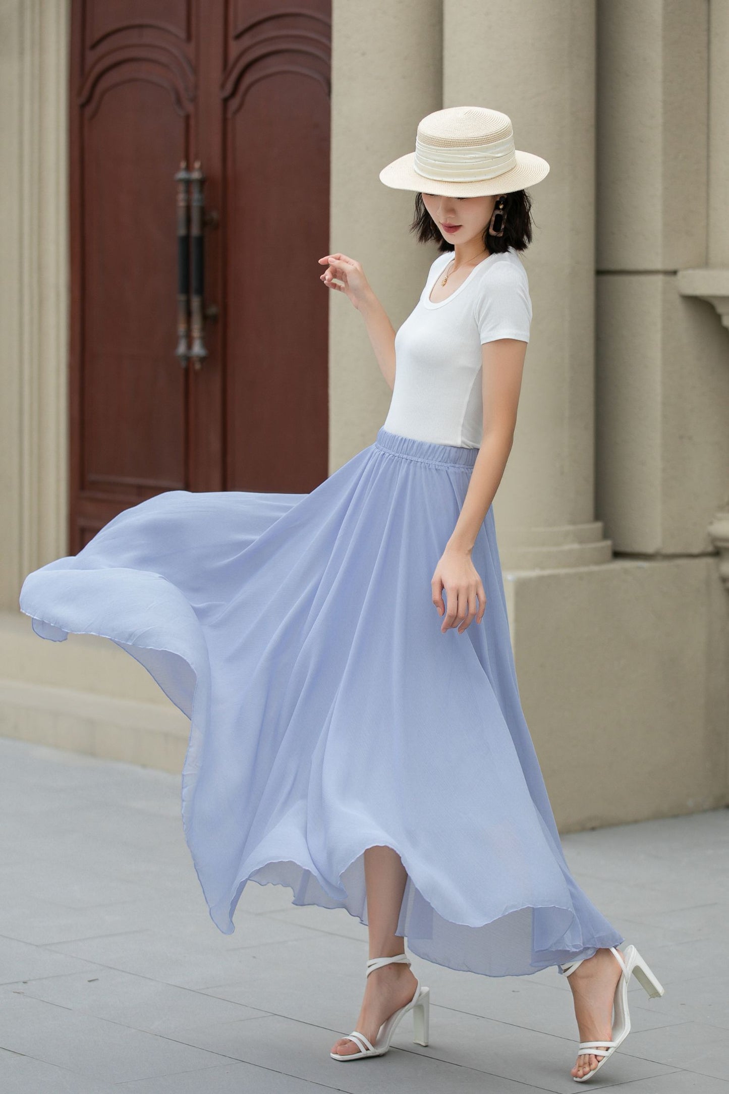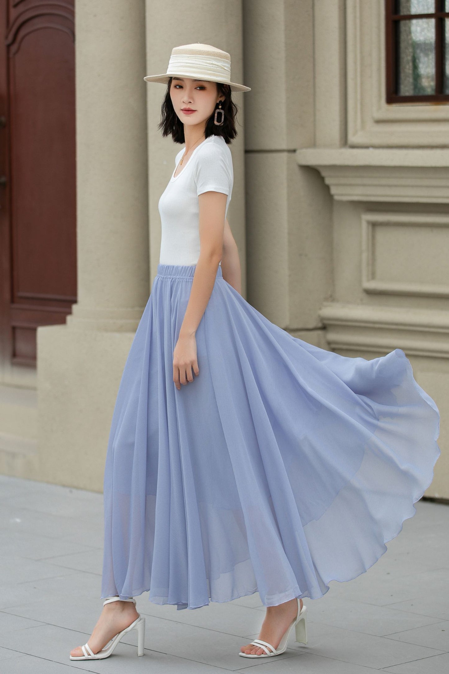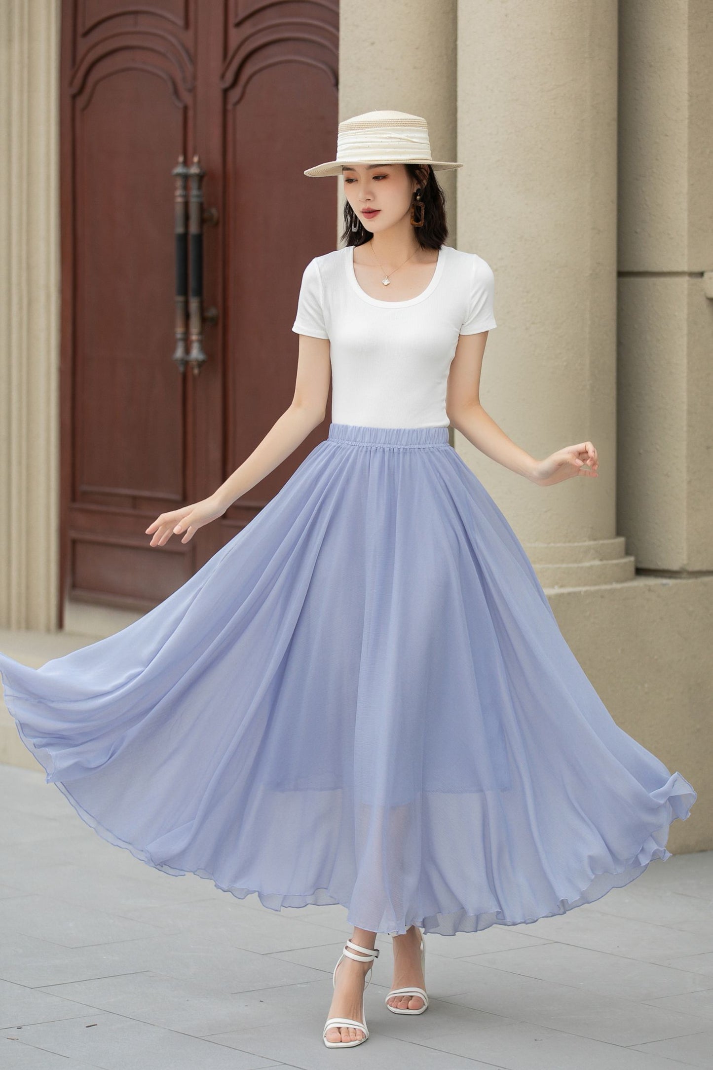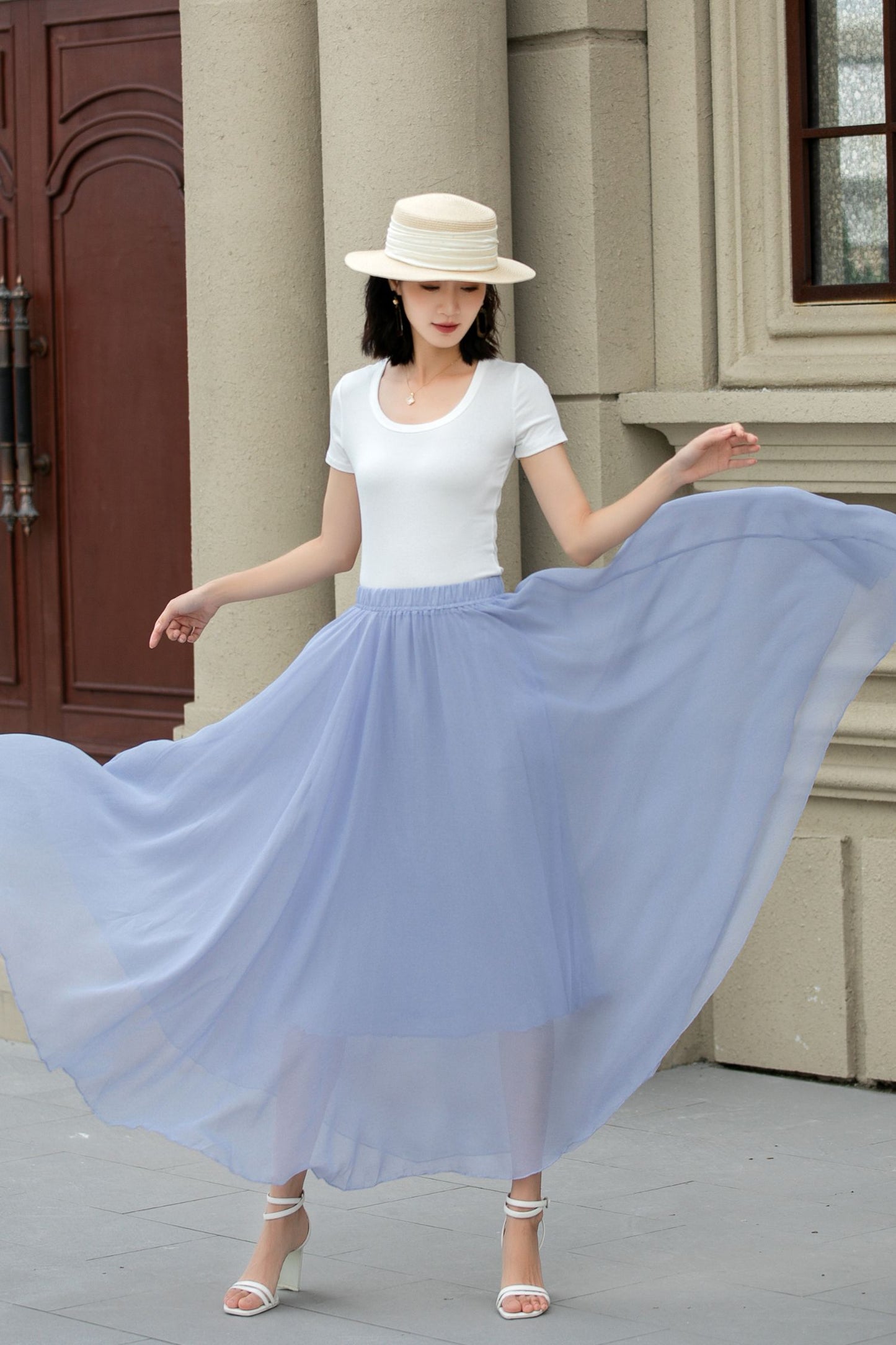 Handmade Light Blue Chiffon Midi Skirt – Flowing A-Line Swing with Elastic Waist 5110
