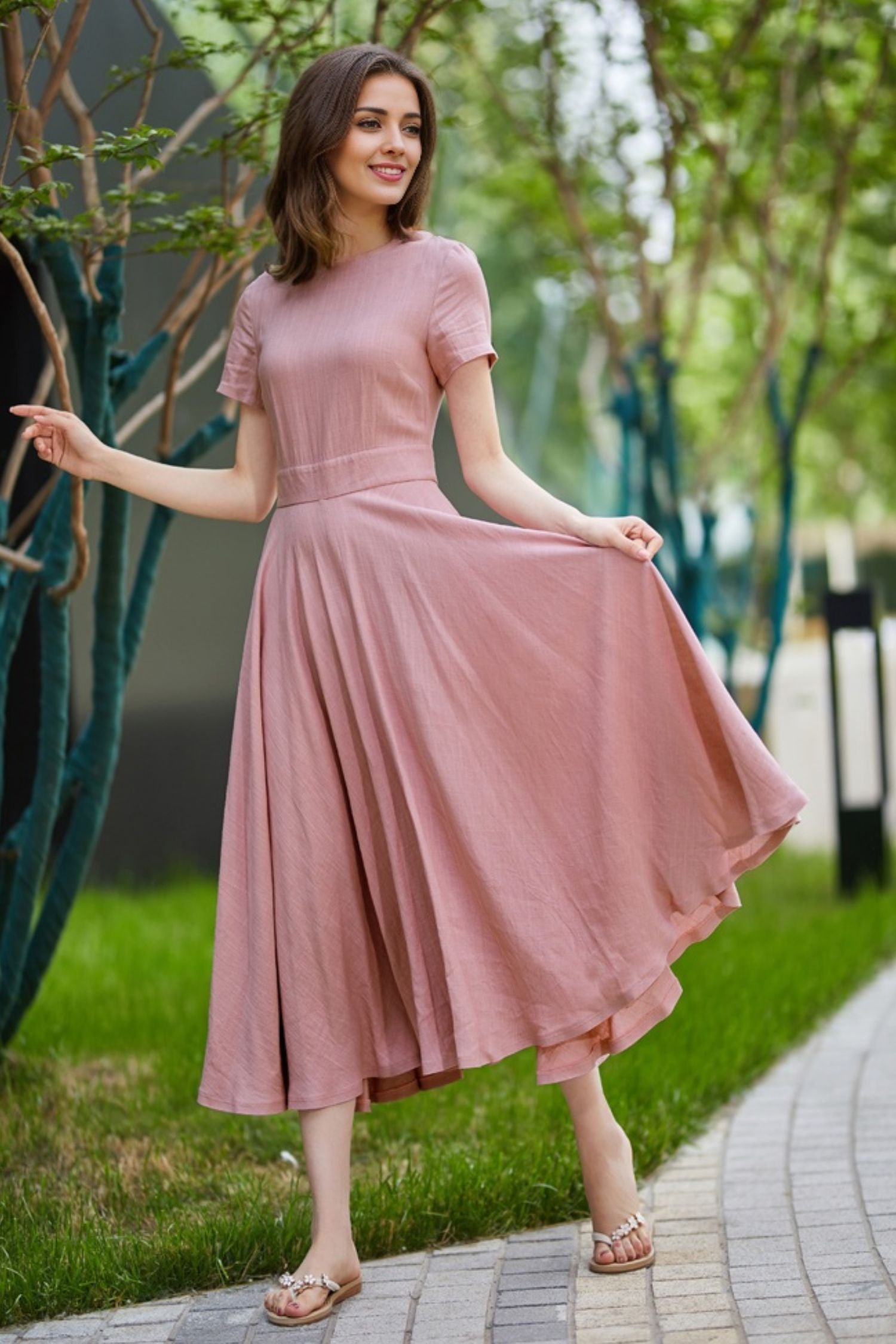 Summer womens Pink Linen Midi swing dress 5824
