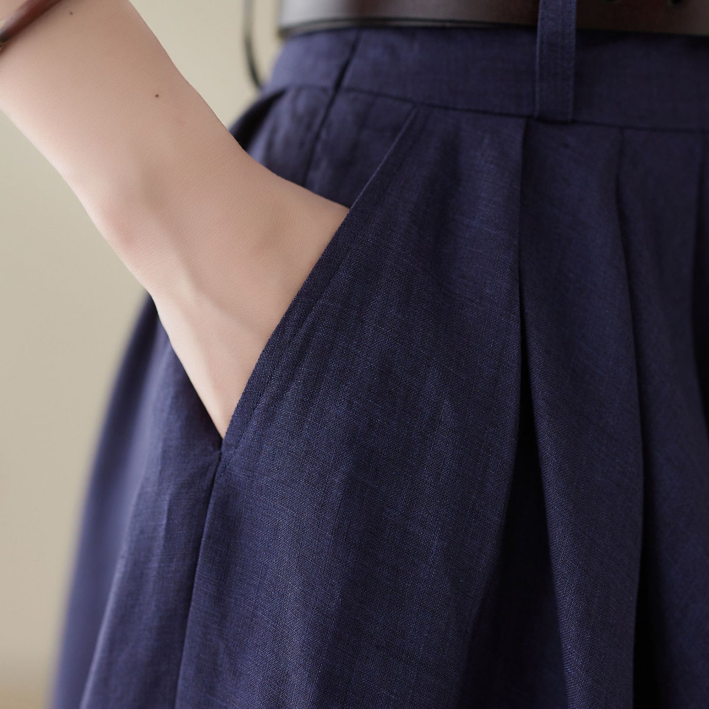 Comfortable, gathered, a-line, knee-length skirt with high waistband. And it has pockets! This linen skirt will makes you a feminine and effortless look when paired with a tee or tank, and any of your well-loved heels, sneakers, clogs, flats, or sandals. On a breezy day, the wind sways your skirt like a sail.