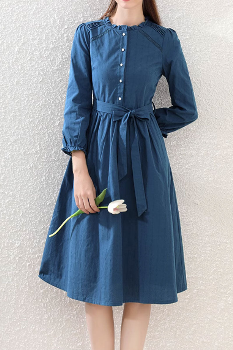Elevate your style with our stunning tie belt blue dress. Handmade with luxurious linen, this vintage-inspired dress features elegant ruffle details for a touch of sophistication. Perfect for any occasion, this dress will make you feel effortlessly chic and exclusive.
