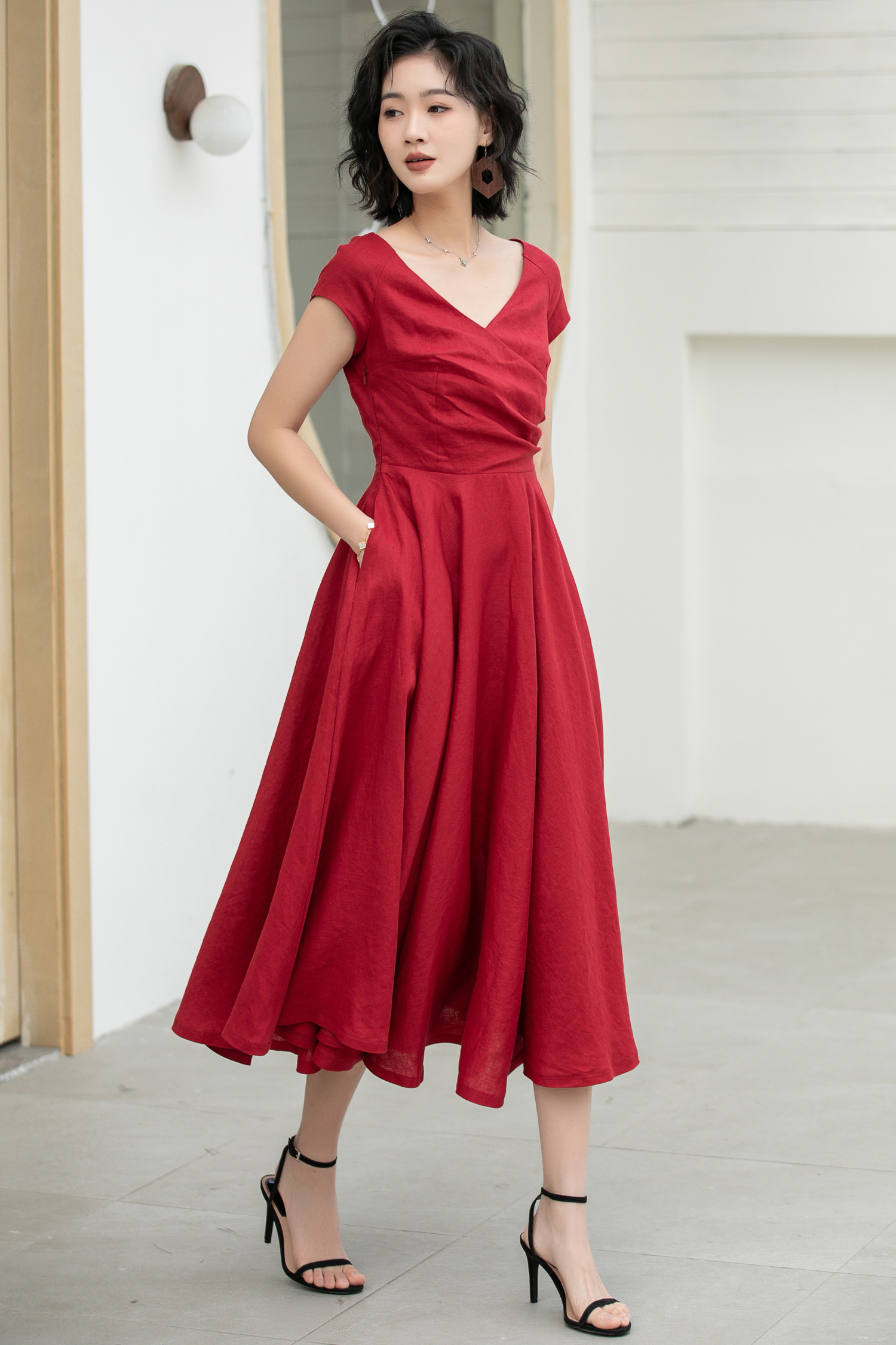 This delicate red linen dress is very bright color, short sleeves and V-neck design make it love to wear. fit and flare dress is exquisite, so embrace this dress on a hot summer day.
