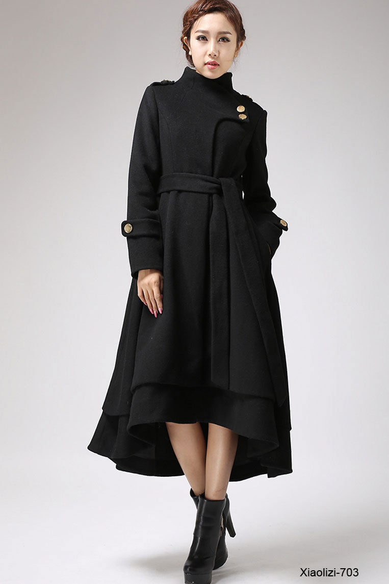 This dark green wool coat blends vintage military charm with modern tailoring, making it a standout women's winter coat. Featuring a structured silhouette, high asymmetrical collar, and a flared A-line hem, it's crafted from a cozy wool-blend fabric ideal for colder seasons.