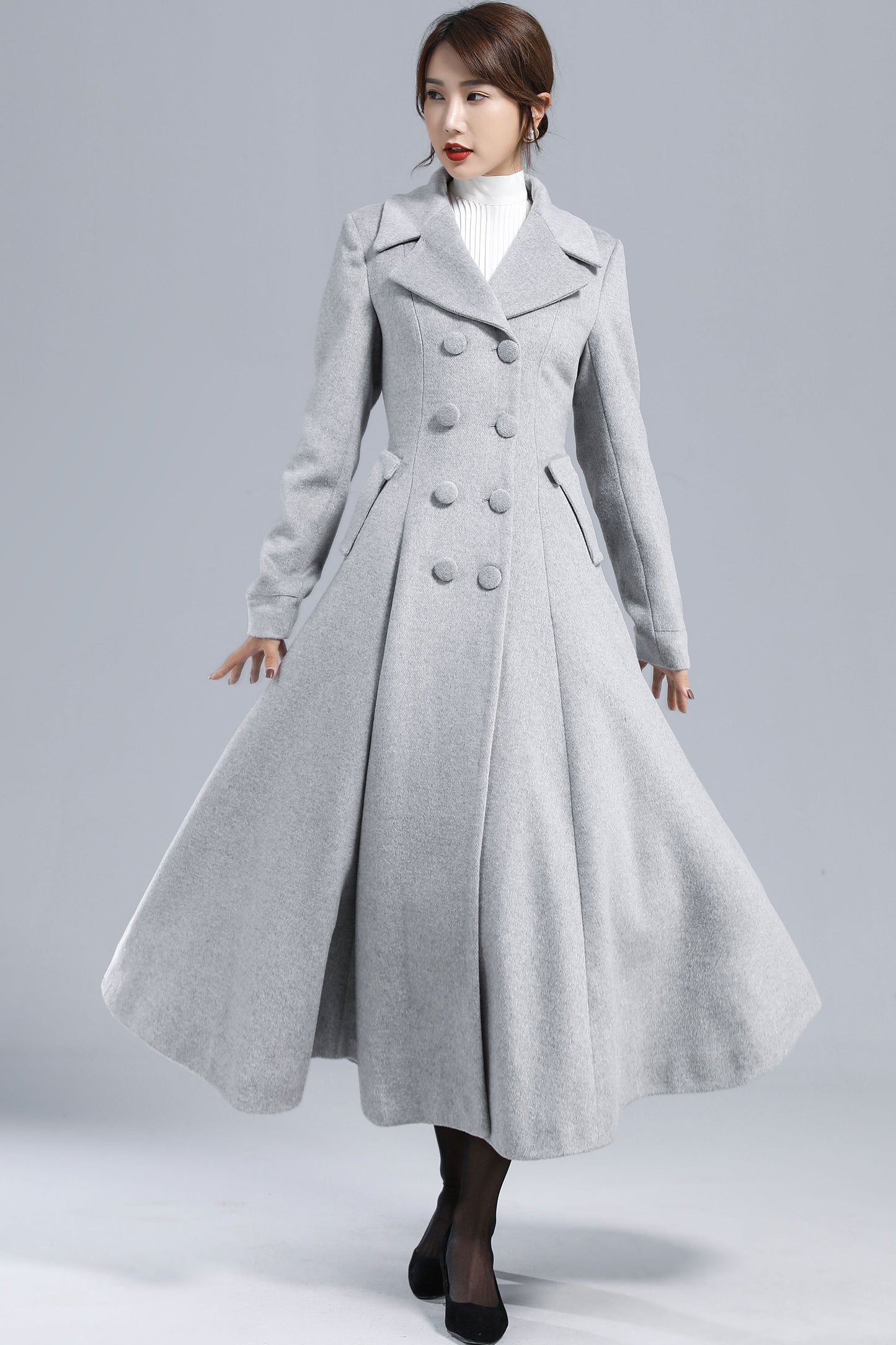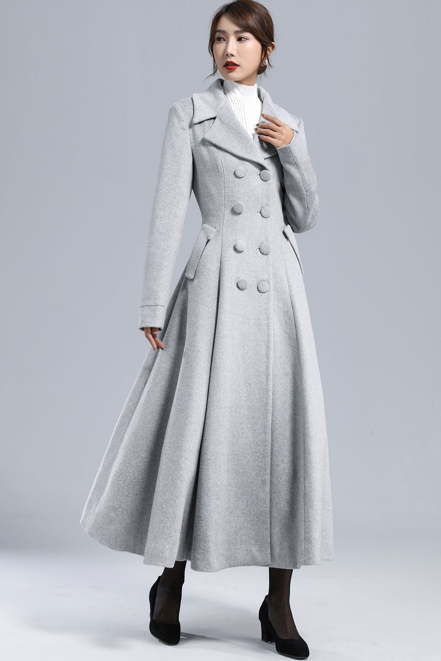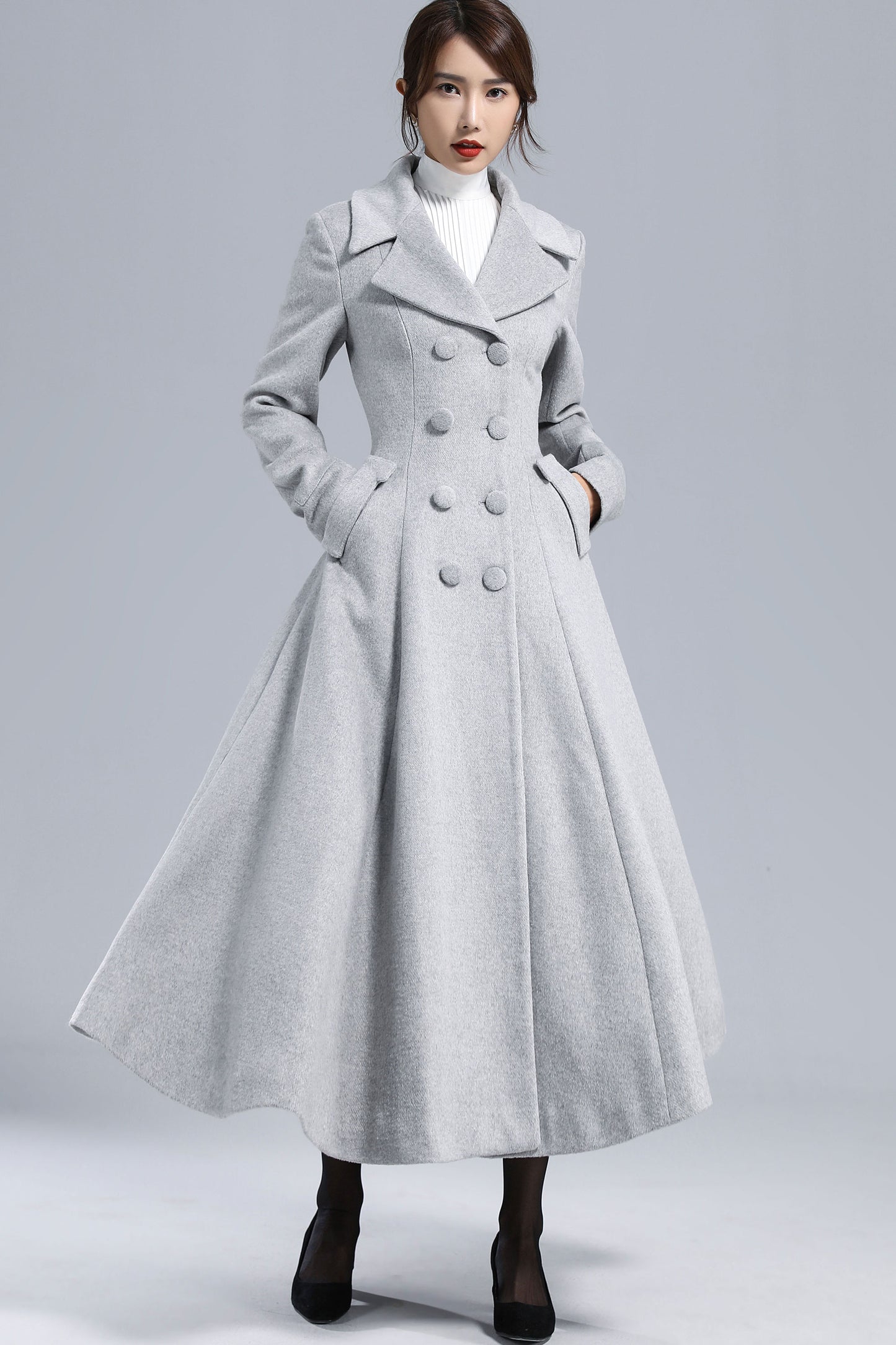 Chic, timeless, and effortlessly elegant — this light gray wool coat is your perfect winter statement piece. Designed with a double-breasted silhouette, wide lapel collar, and flared hem, it creates a graceful, feminine outline while keeping you warm in style. Whether for workdays, city strolls, or evening gatherings, it brings sophistication to every winter moment.