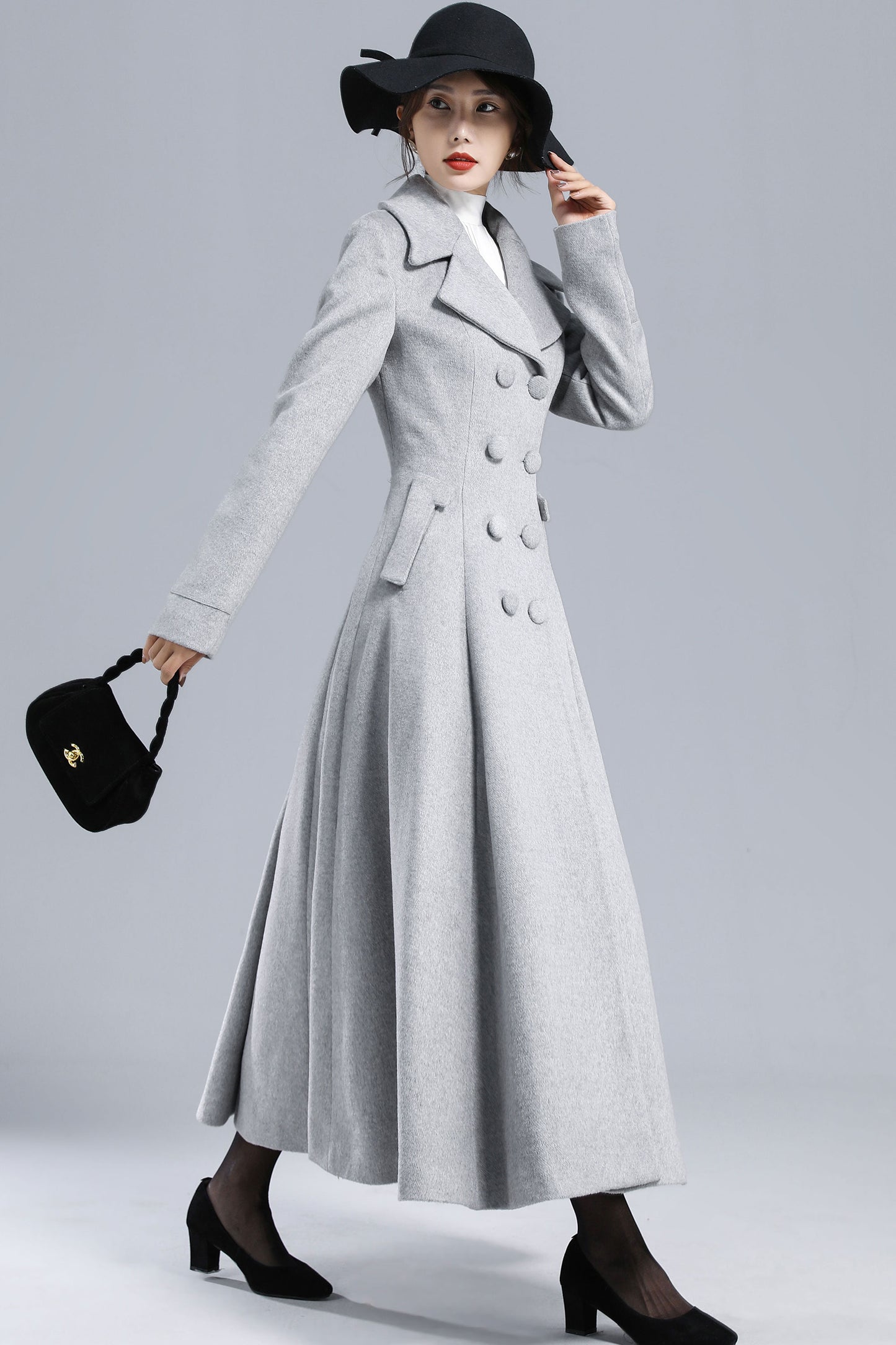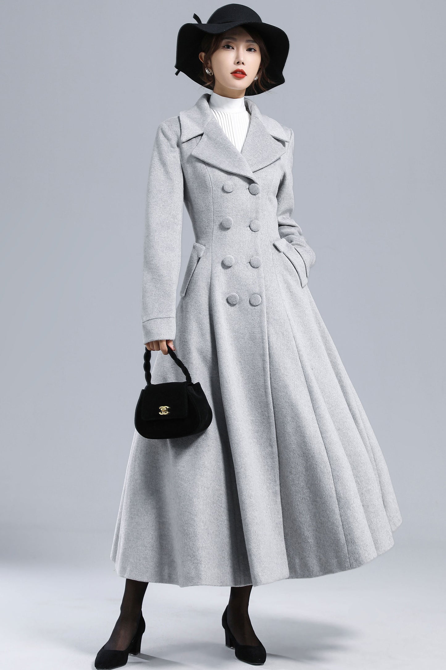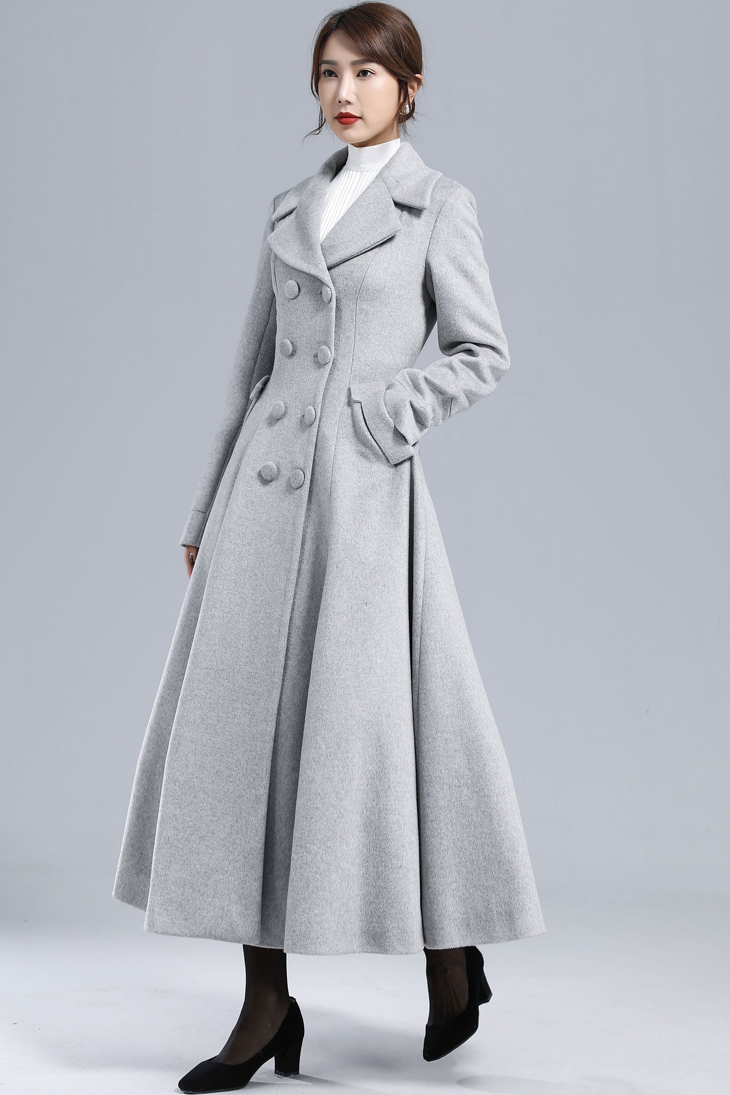 Chic, timeless, and effortlessly elegant — this light gray wool coat is your perfect winter statement piece. Designed with a double-breasted silhouette, wide lapel collar, and flared hem, it creates a graceful, feminine outline while keeping you warm in style. Whether for workdays, city strolls, or evening gatherings, it brings sophistication to every winter moment.