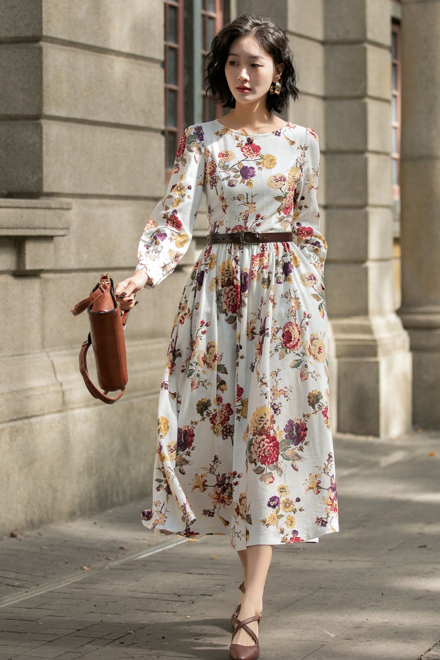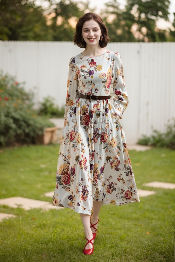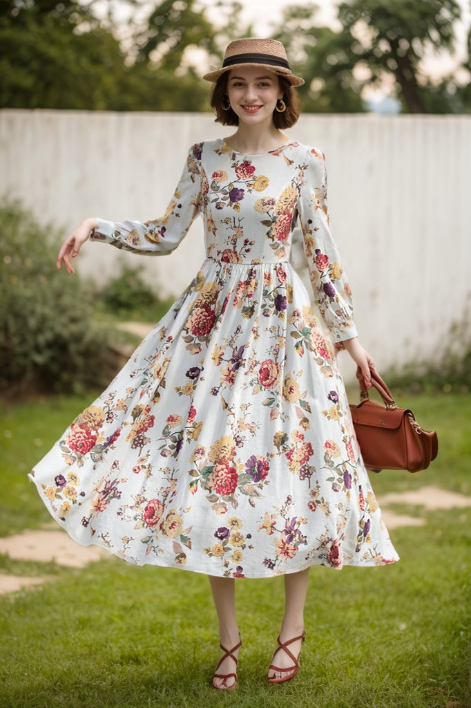Floral Linen Maxi Dress – Long Sleeve Vintage Swing Dress | Xiaolizi 5685
