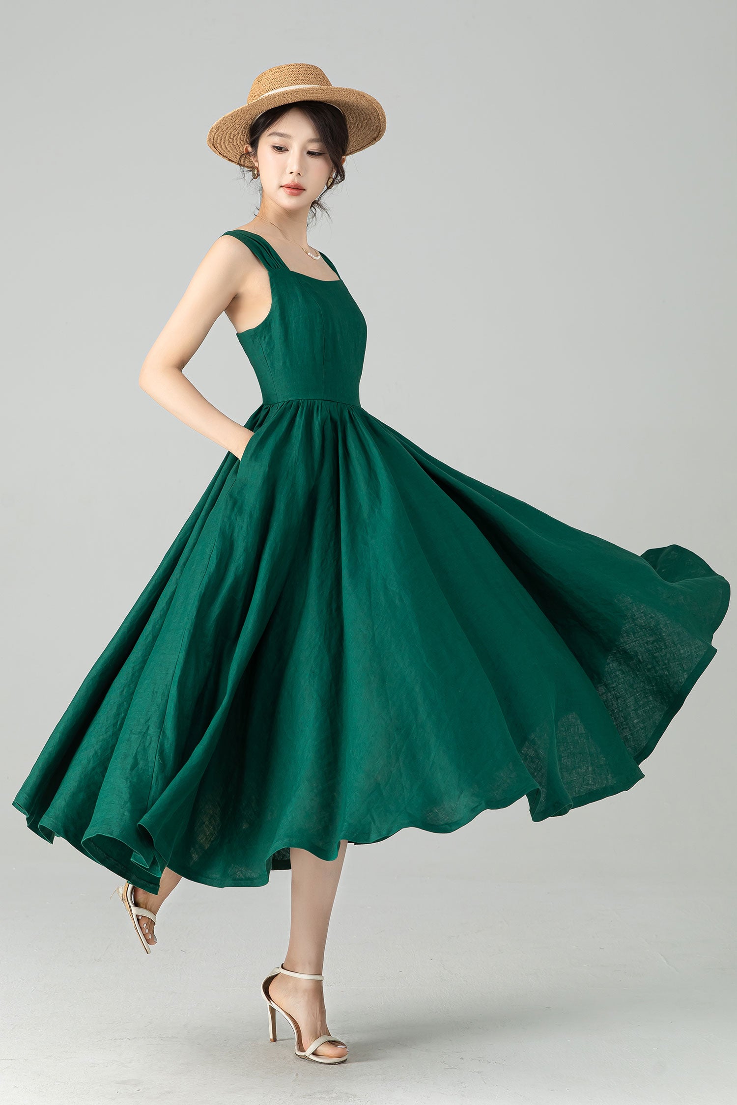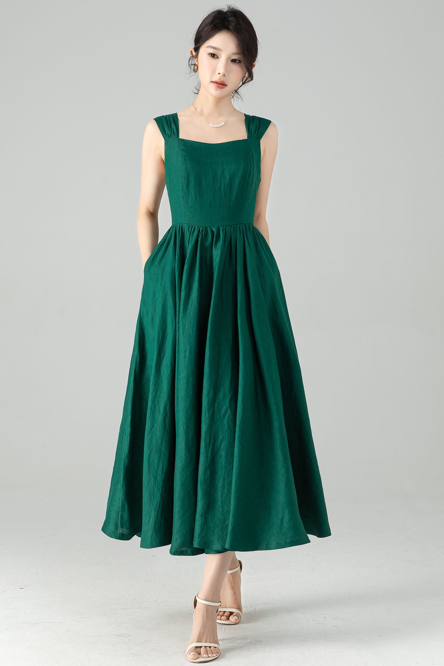 This dress features a flattering square neckline, wide shoulder straps, and a gracefully gathered A-line skirt. Perfect for summer garden parties, romantic picnics, vacations, or just strolling through town with effortless charm.