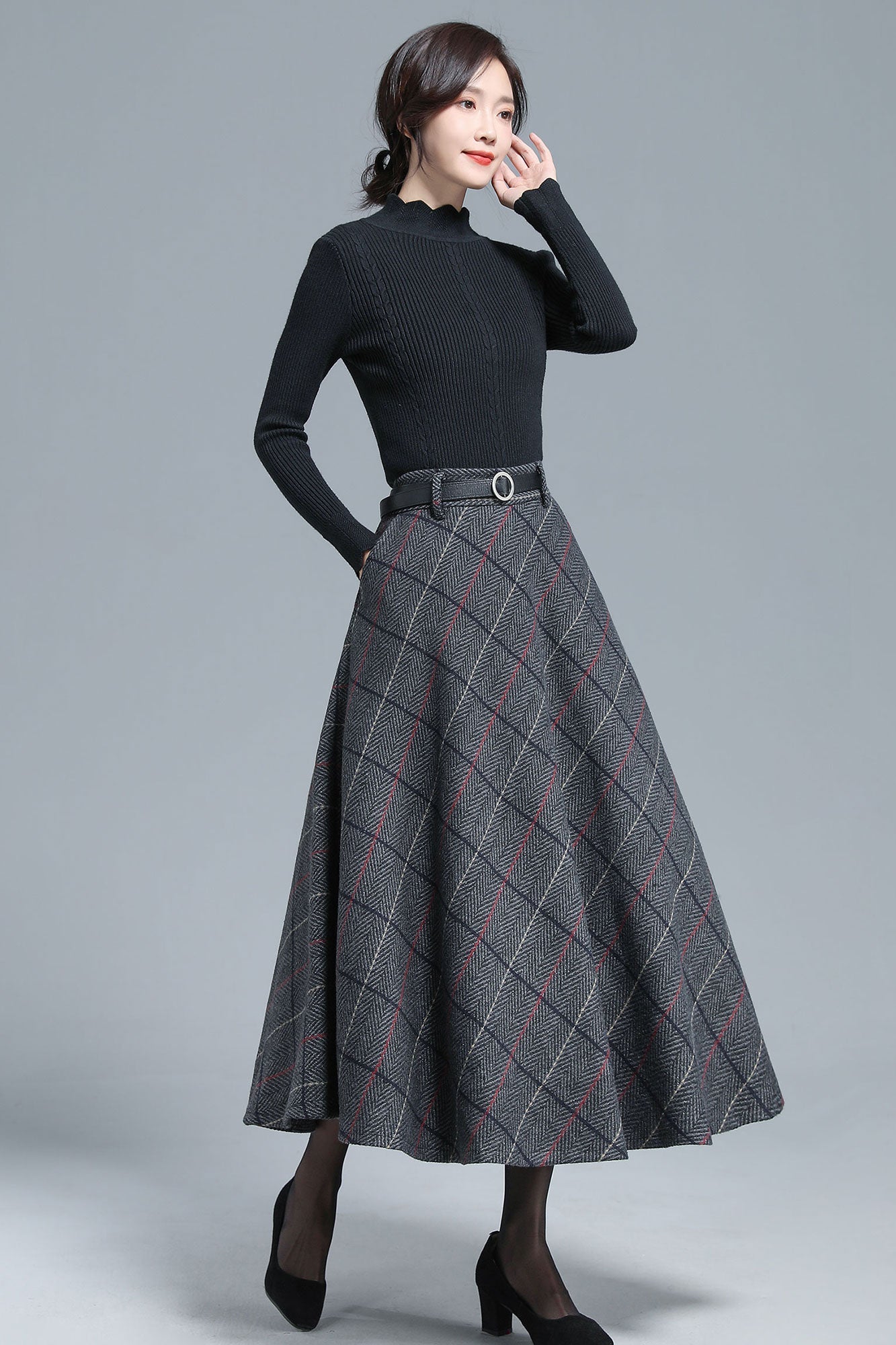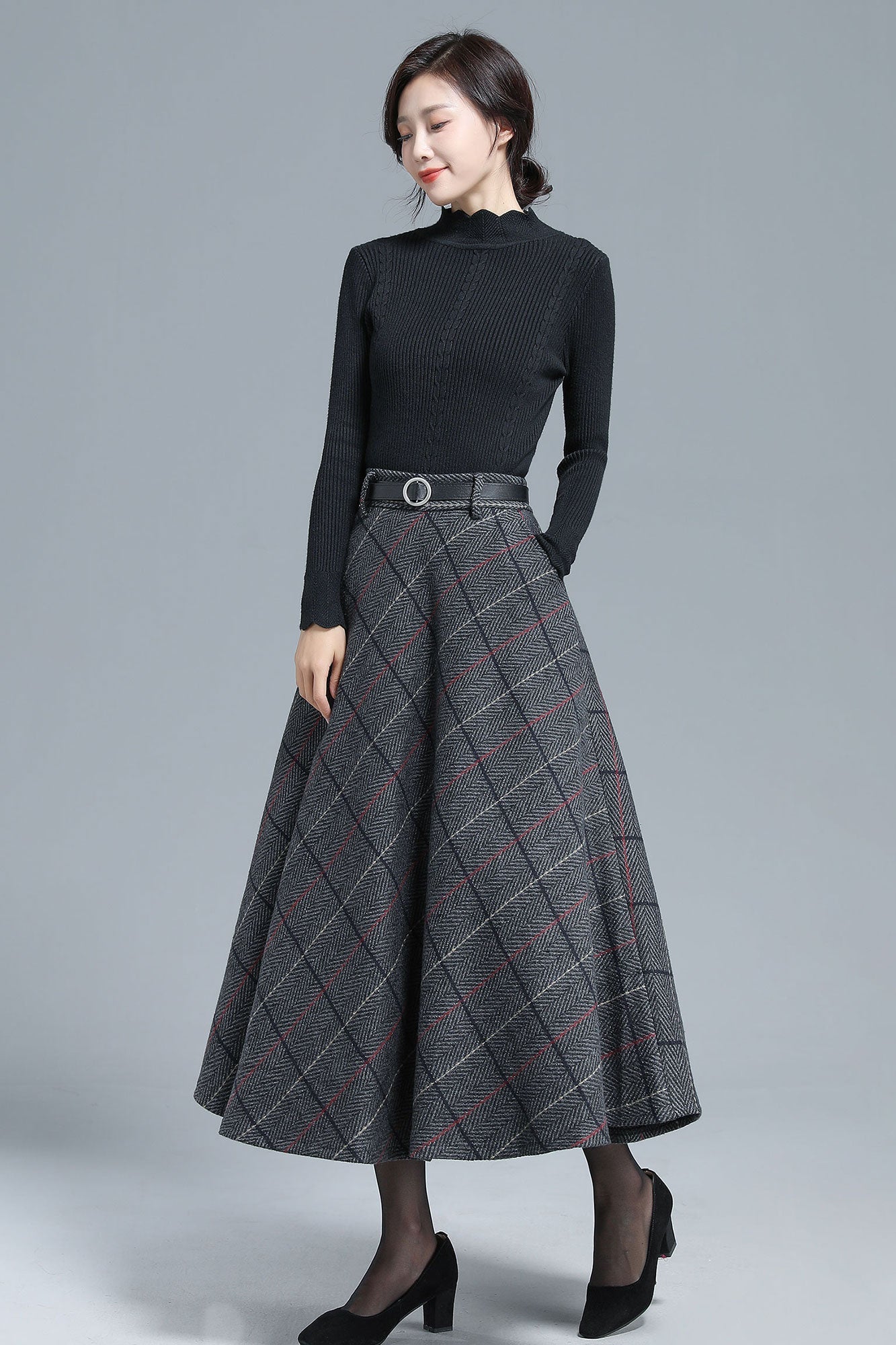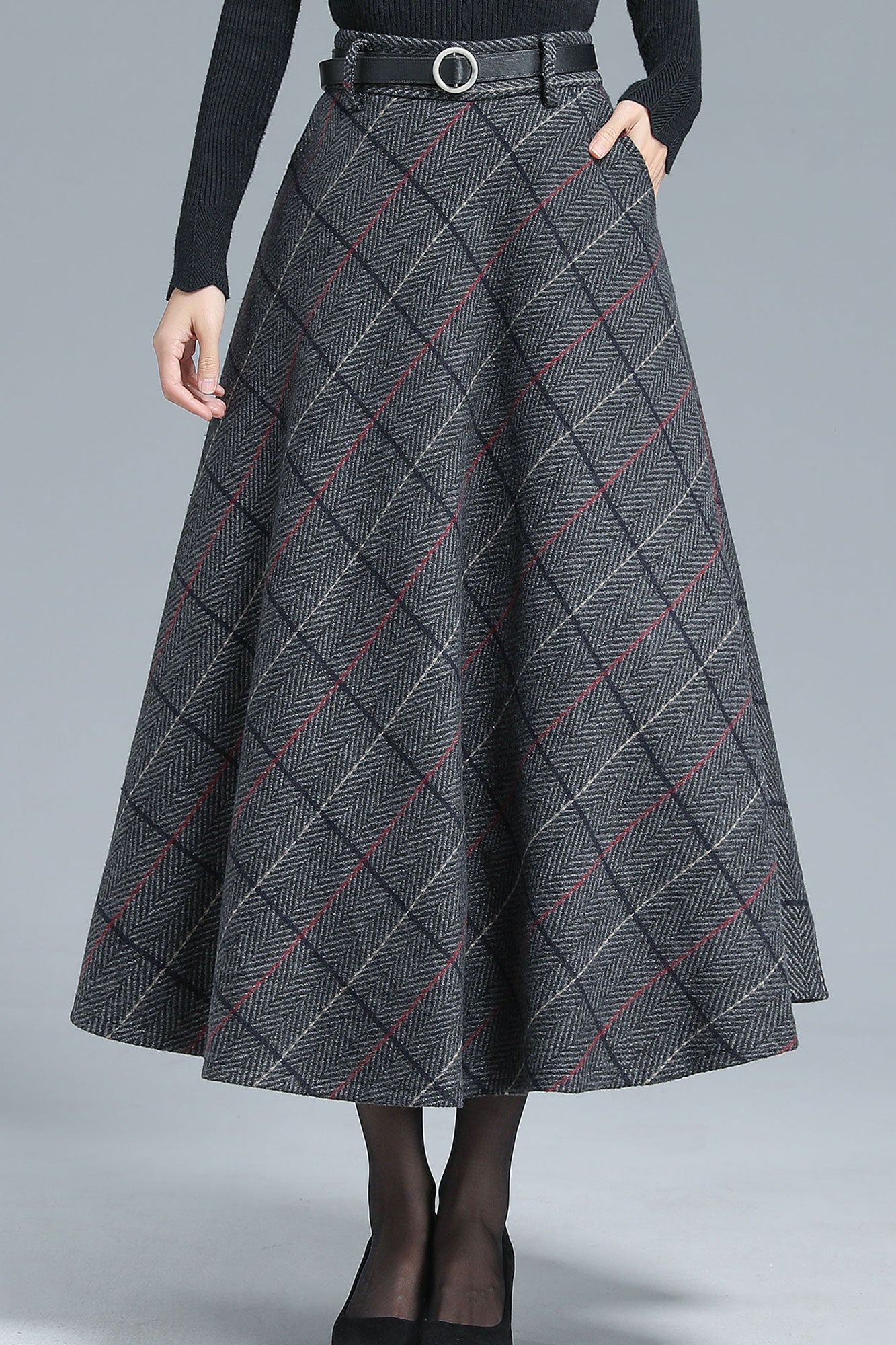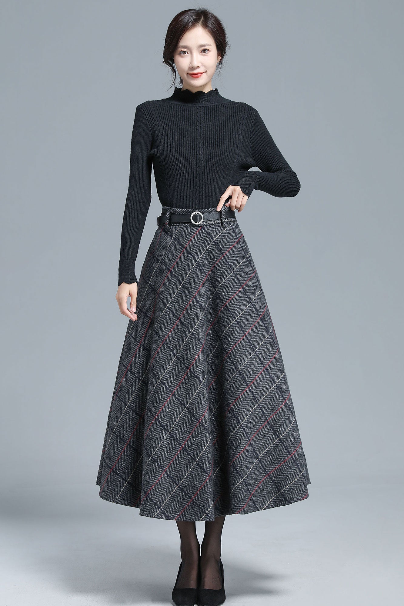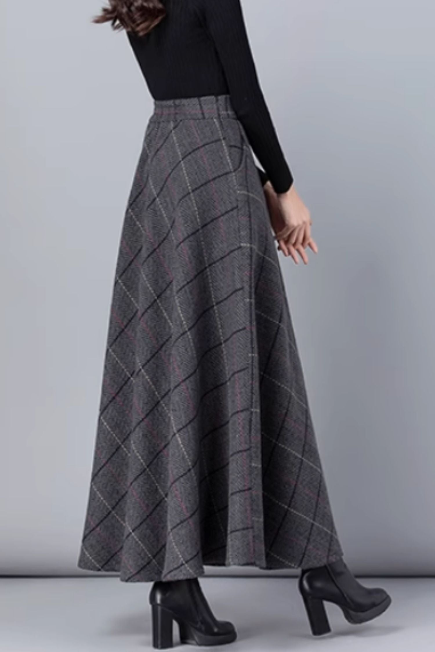 Vintage Inspired Tartan Plaid Midi Wool Skirt Woman 3138