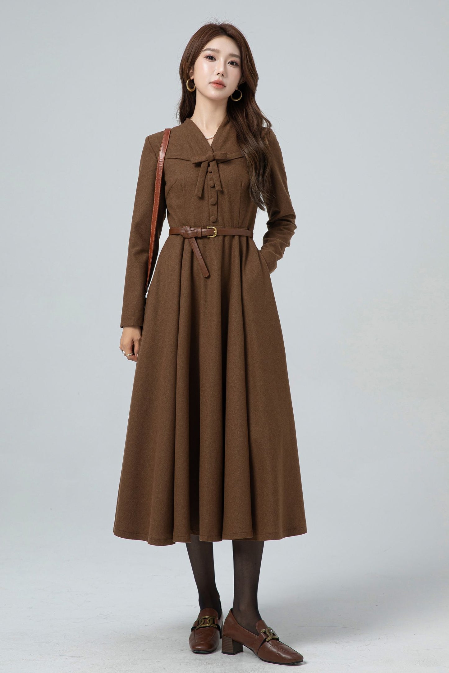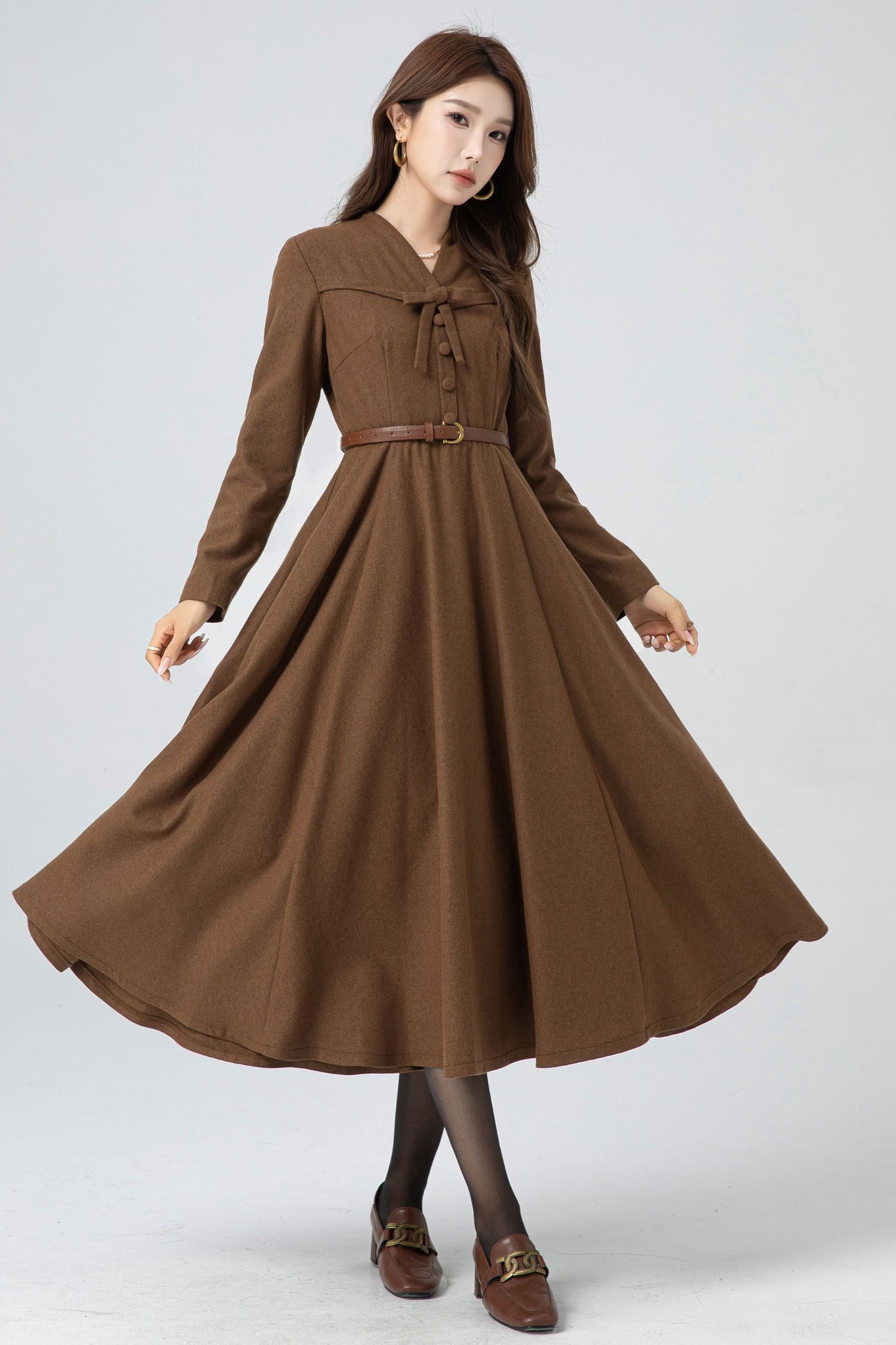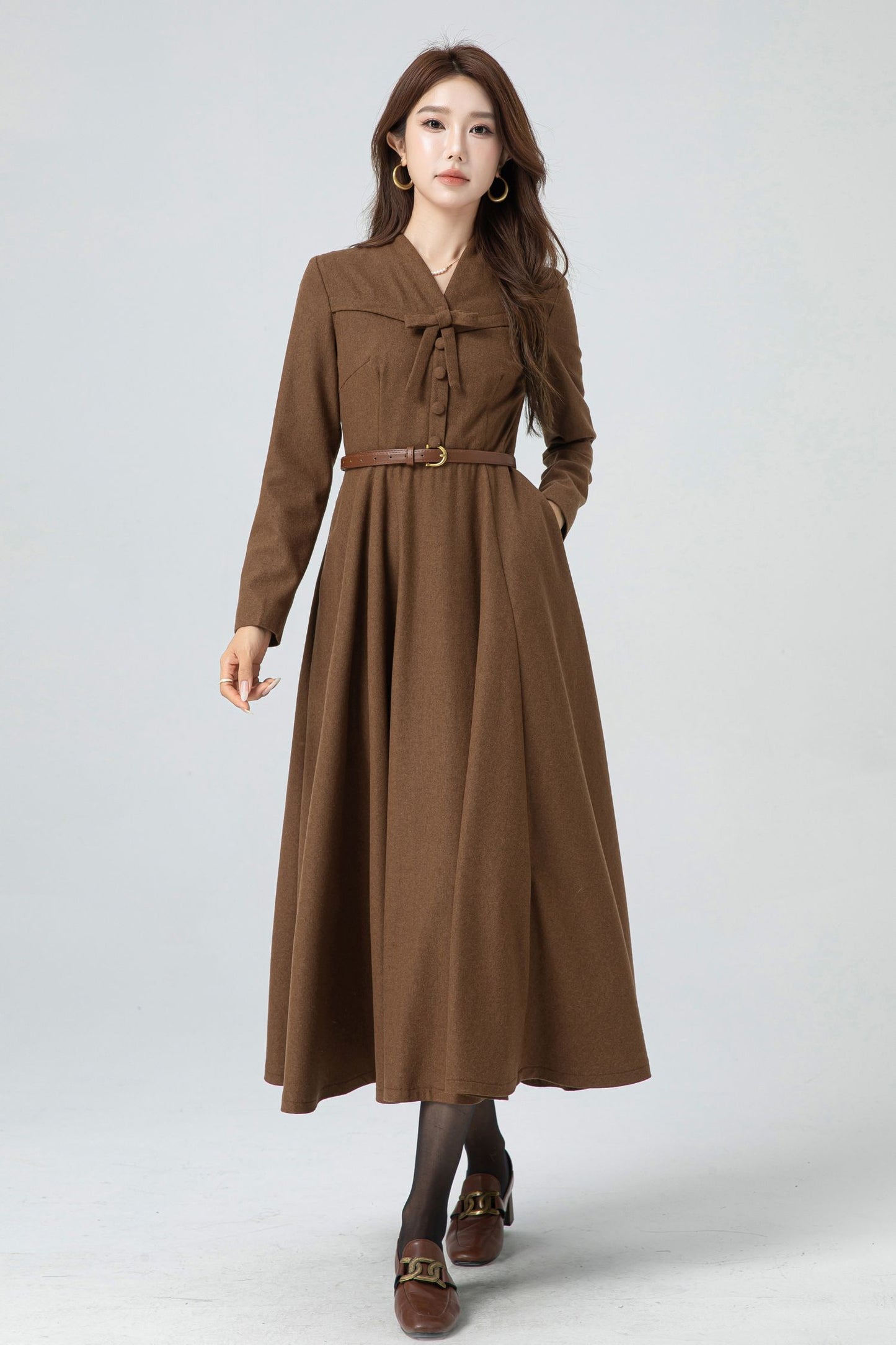 This long brown wool dress has bow and button decoration. The attention to detail in the construction of this women brown long wool dress is evident in every stitch, show casing the craftsmanship and expertise that went into its creation. This made-to-measure brown wool dress,crafted with an eye for detail and a commitment to excellence.