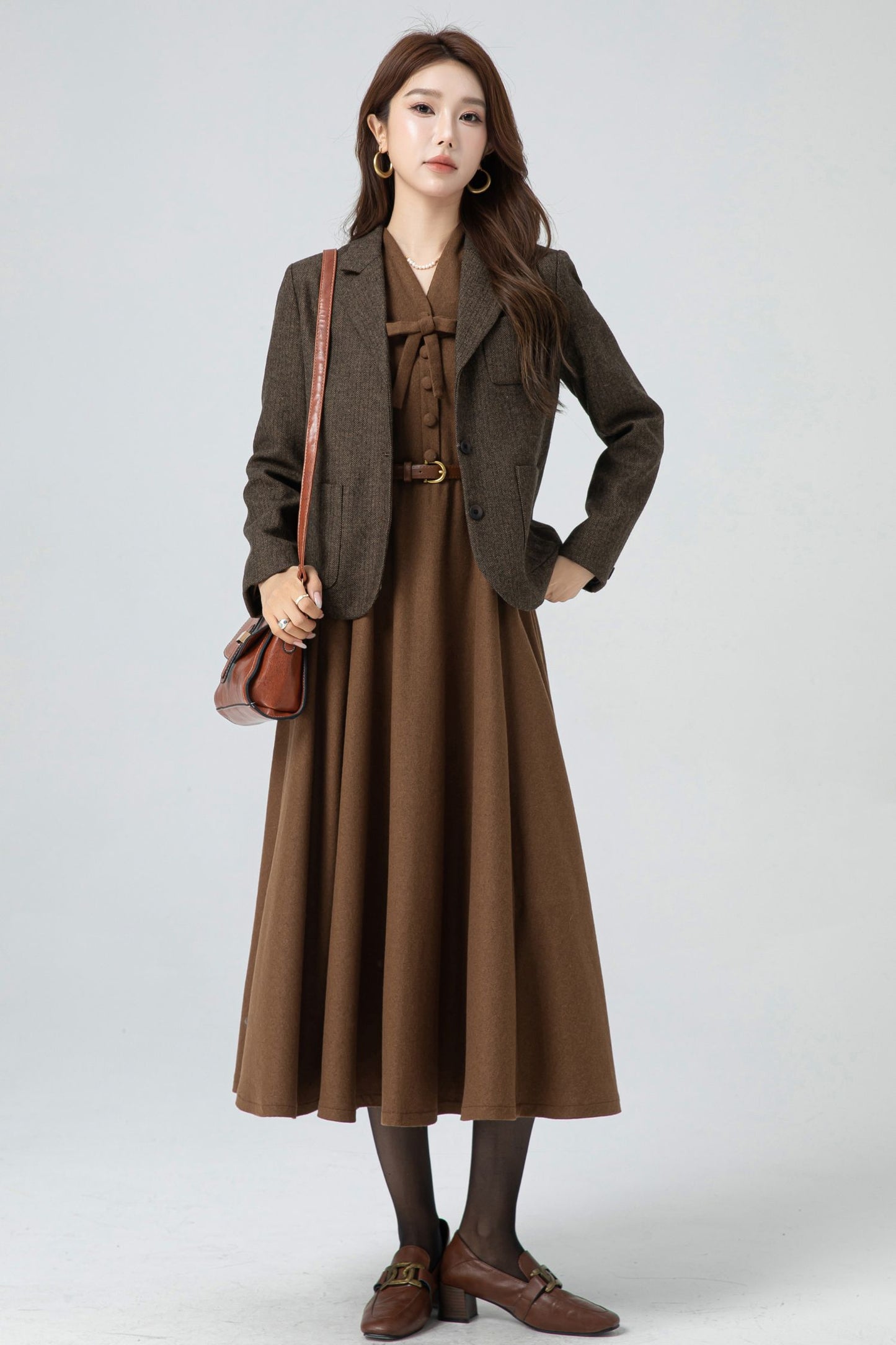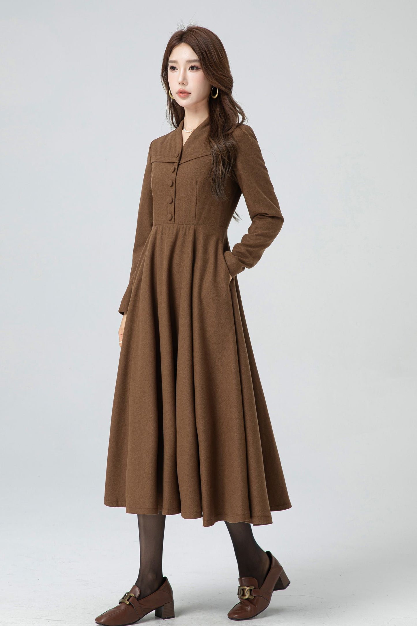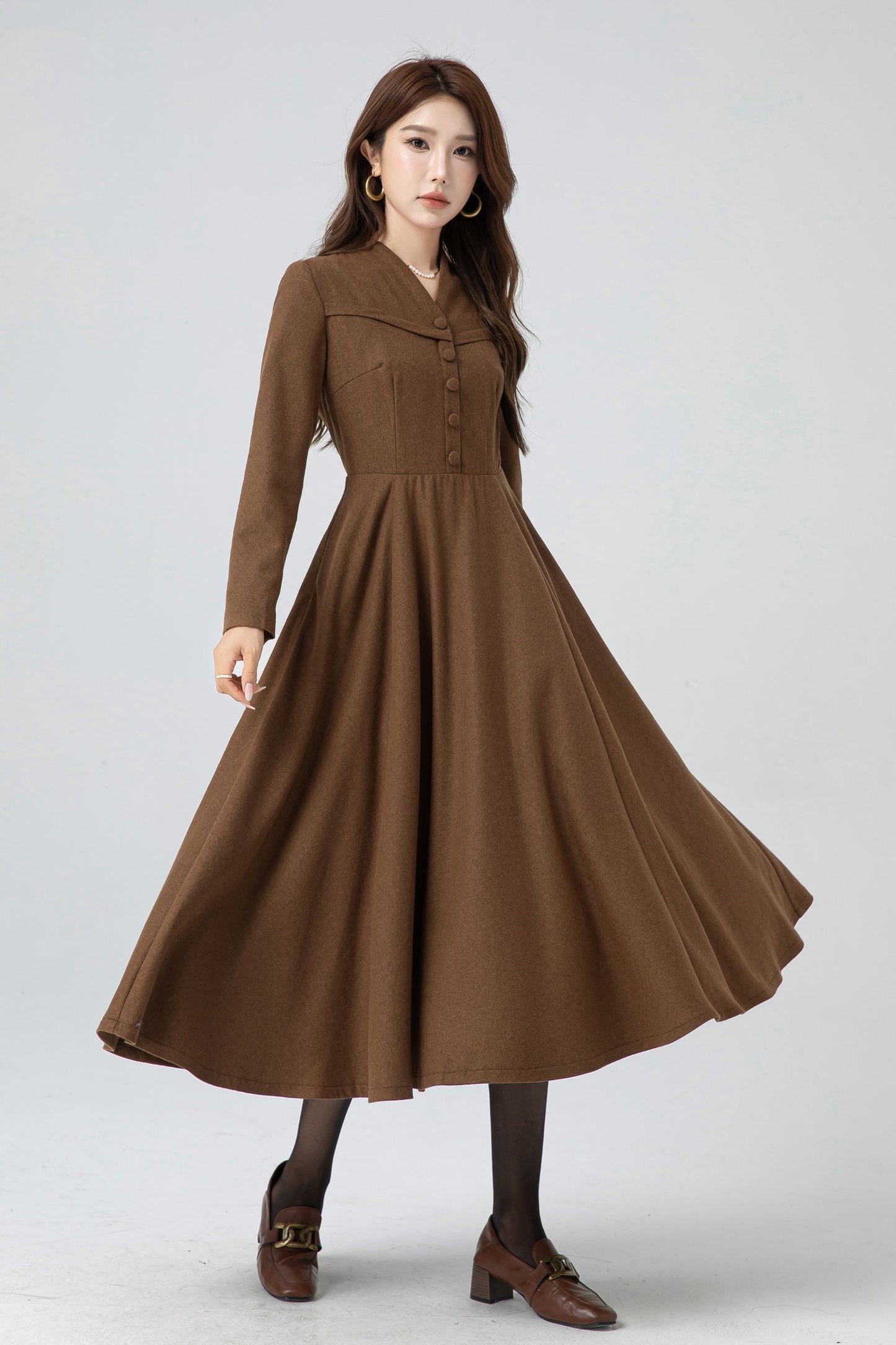 This long brown wool dress has bow and button decoration. The attention to detail in the construction of this women brown long wool dress is evident in every stitch, show casing the craftsmanship and expertise that went into its creation. This made-to-measure brown wool dress,crafted with an eye for detail and a commitment to excellence.