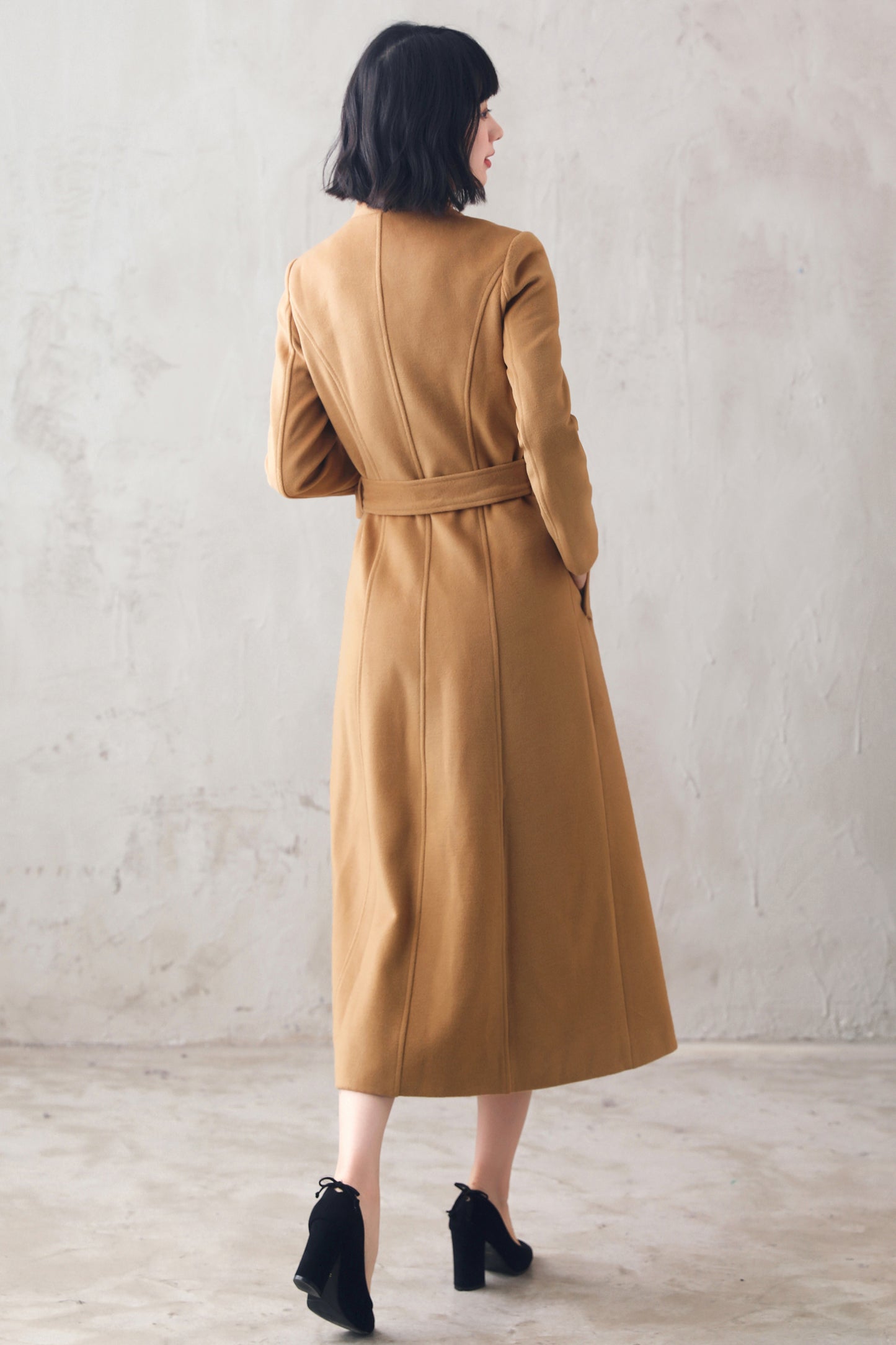 Bring timeless sophistication to your winter wardrobe with this handmade camel wool blend coat. Featuring a structured high collar, belted waist, and long elegant silhouette, it flatters the figure while keeping you warm. Perfect for city outings, office days, or festive gatherings, this coat captures the essence of classic elegance with a modern touch.