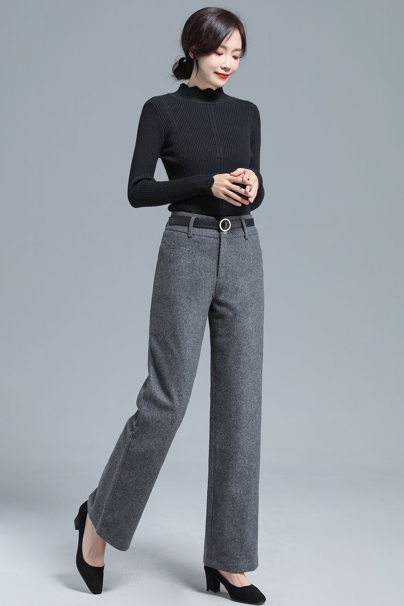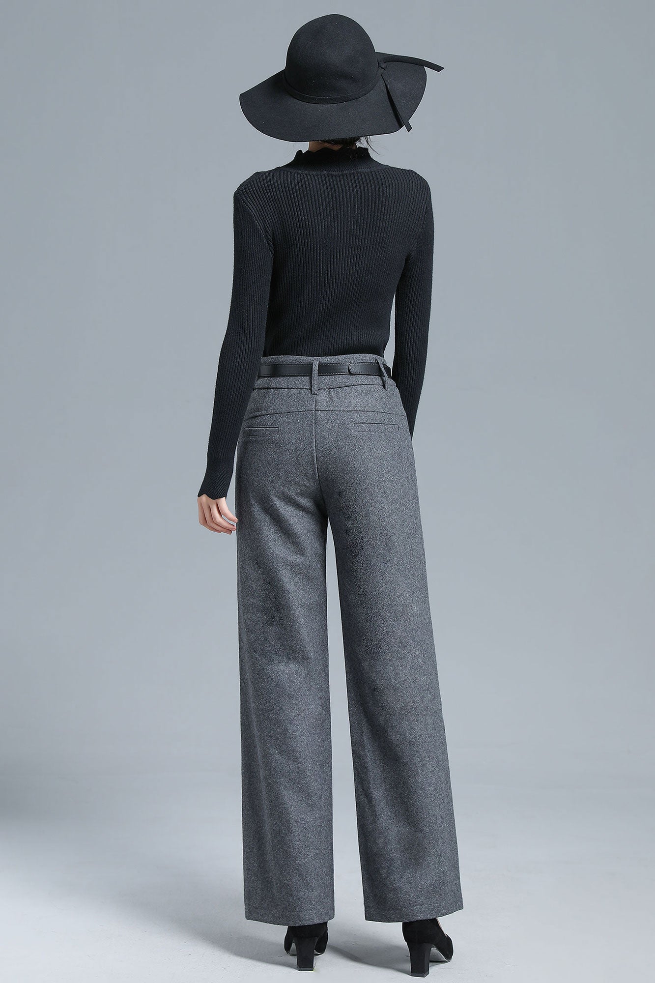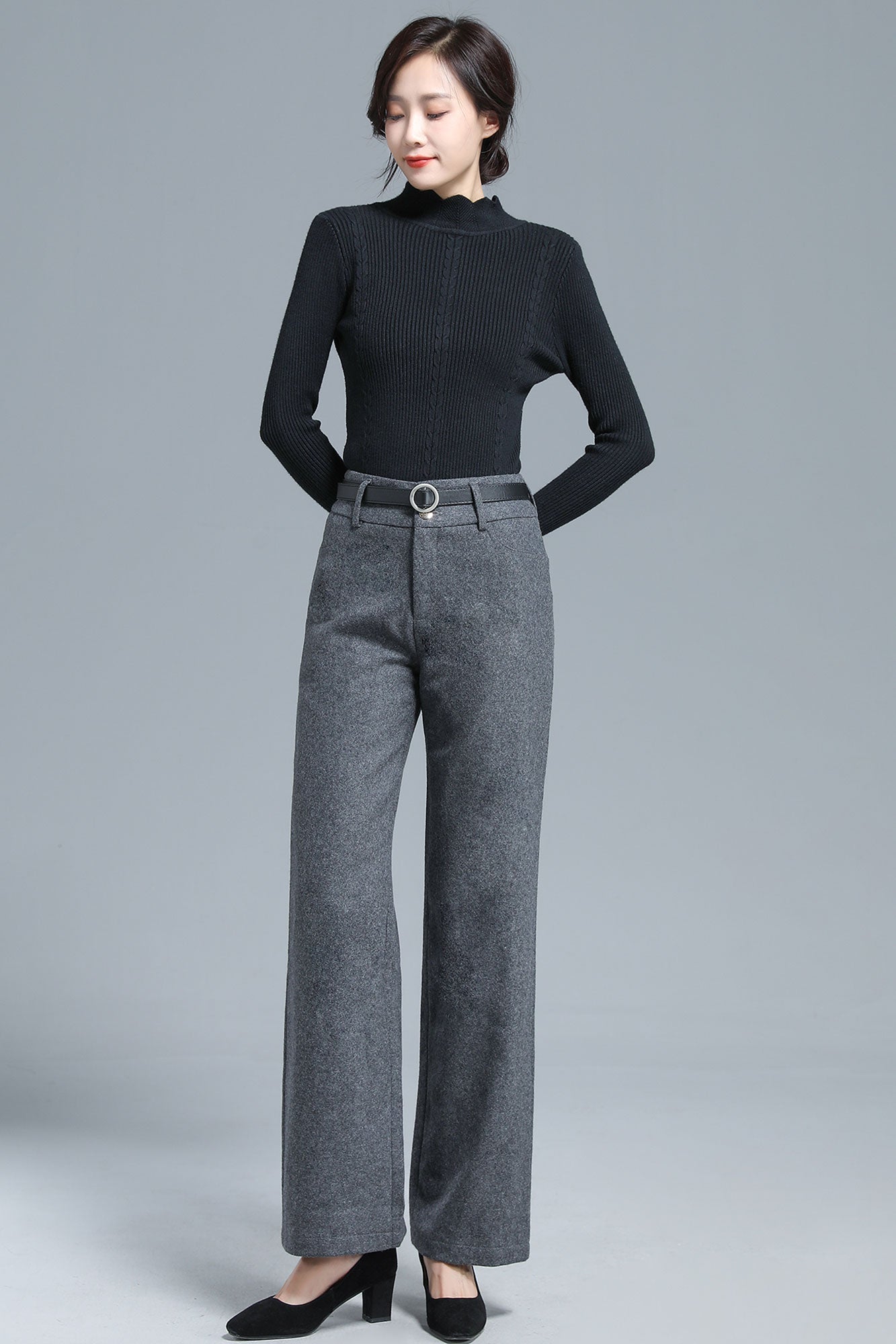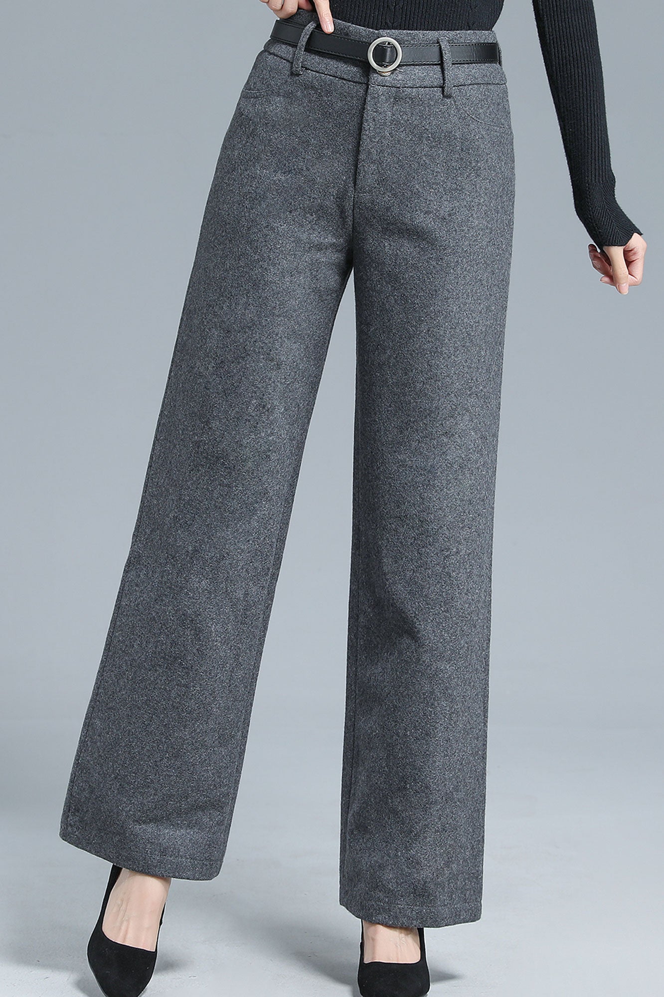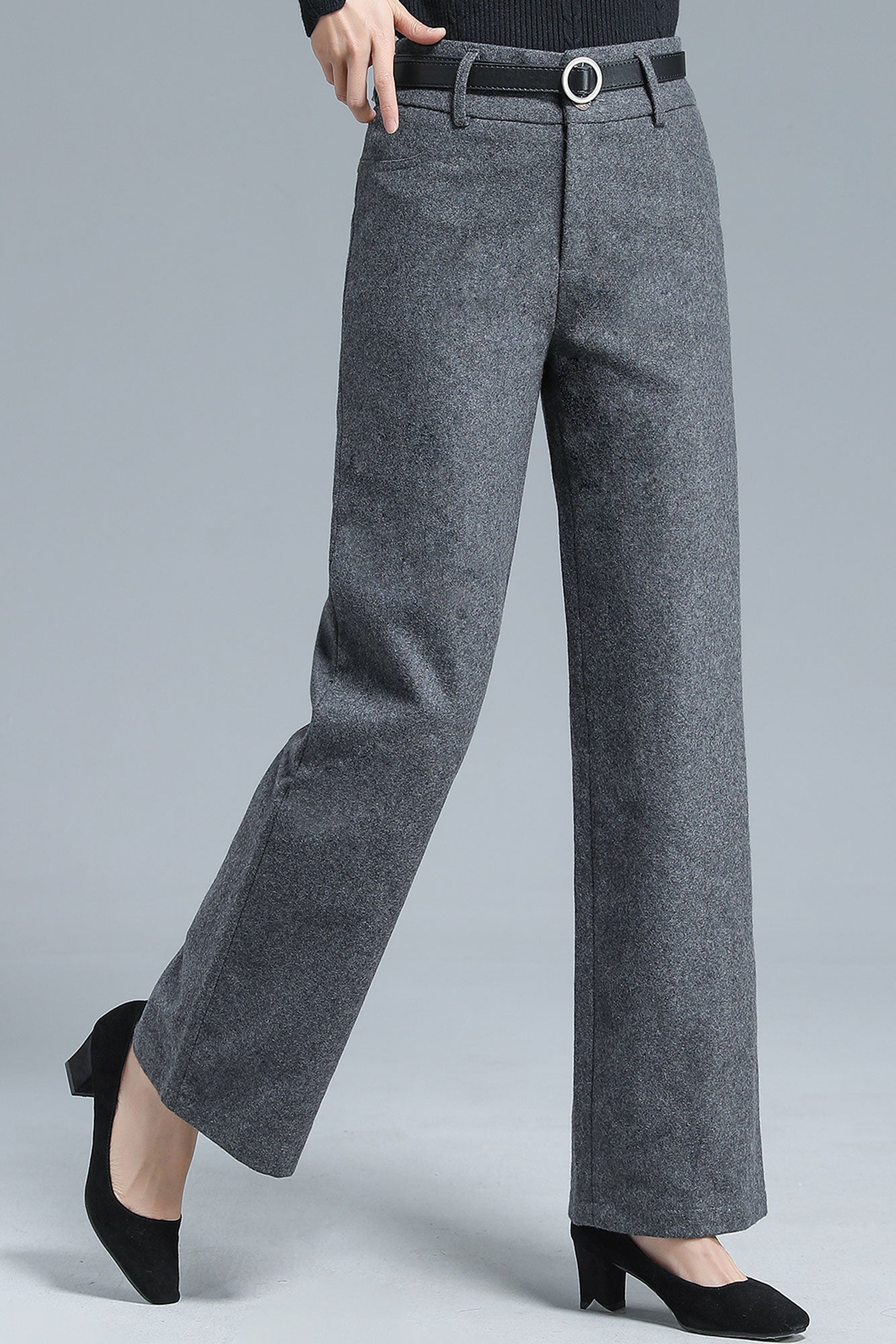 Add a touch of refined vintage charm to your winter wardrobe with these gray wool blend wide leg pants. The high-waist design and flowing straight-leg cut create an effortlessly elongated silhouette, while the soft wool blend fabric ensures both warmth and comfort. Perfect for pairing with sweaters, blouses, or coats, these trousers bring a sophisticated yet versatile edge to your everyday looks.