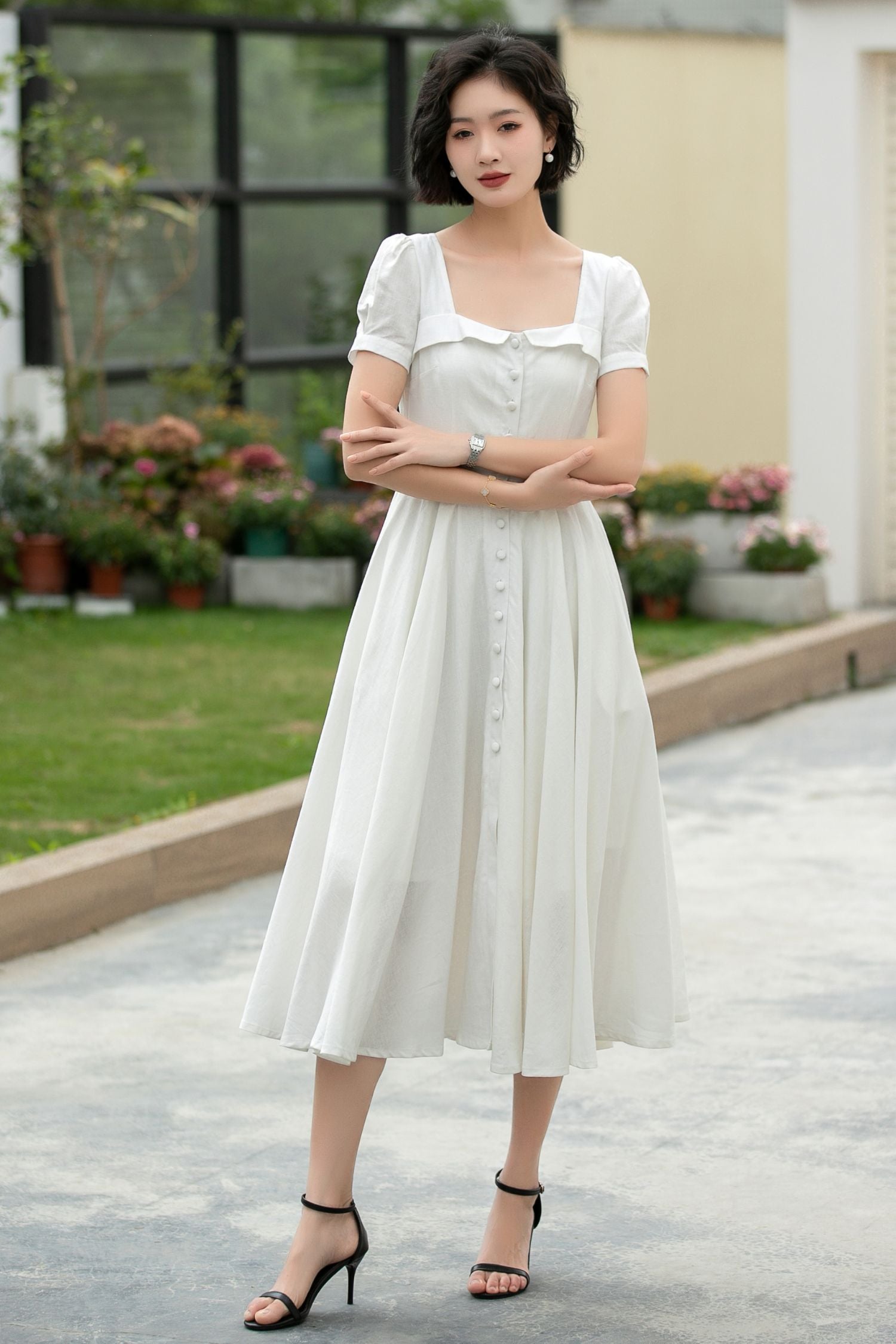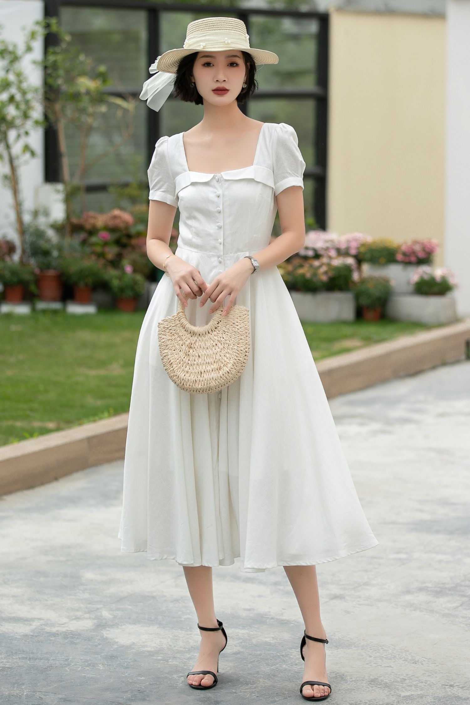 Embrace effortless elegance with this vintage-inspired white cotton-linen dress. Designed with a flattering square neckline, delicate puff sleeves, and a row of fabric-covered buttons, this dress exudes classic charm and feminine grace. The breathable cotton-linen blend ensures comfort, making it perfect for warm-weather outings, garden parties, or romantic strolls.