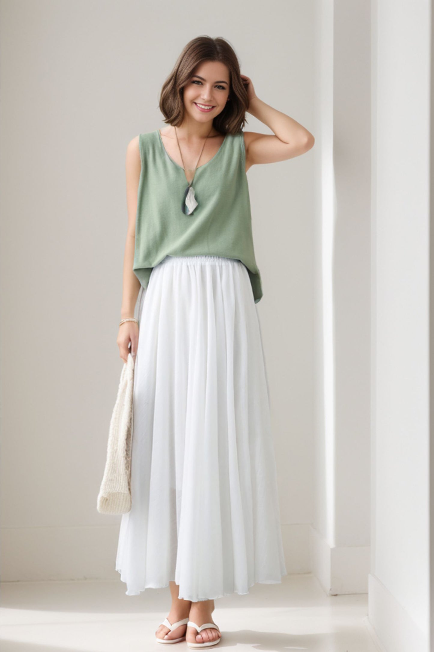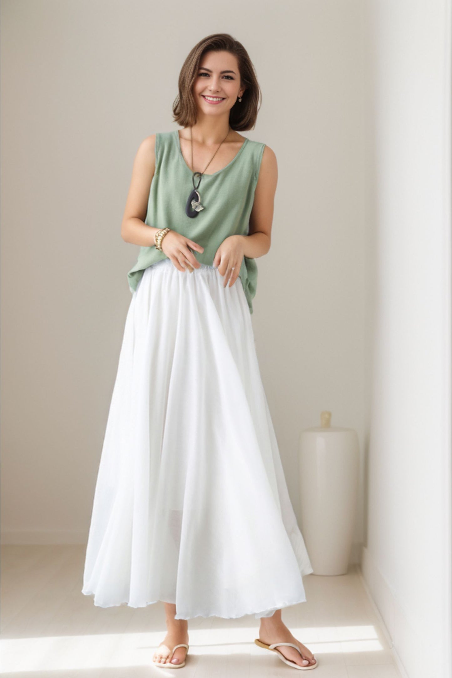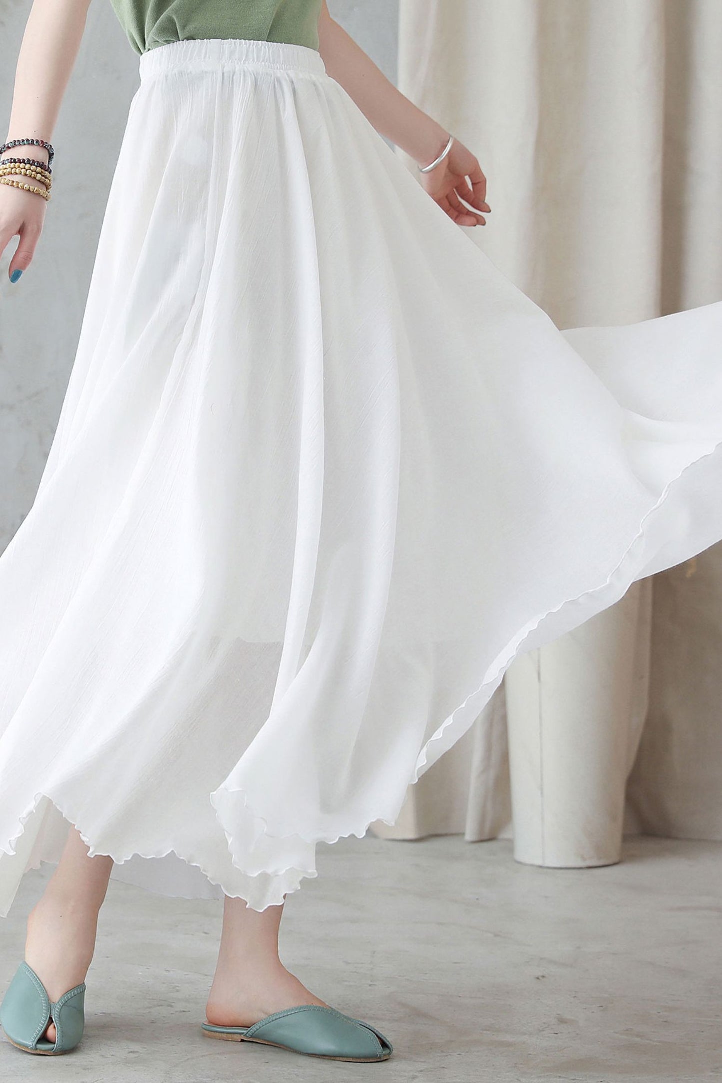 Elevate your summer style with our White Maxi Swing Skirt. Made from lightweight cotton linen, this skirt is perfect for warm days. Its elegant design and comfortable fit make it a must-have for any wardrobe. Experience the benefits of effortless style and comfort with our versatile White Maxi Swing Skirt.