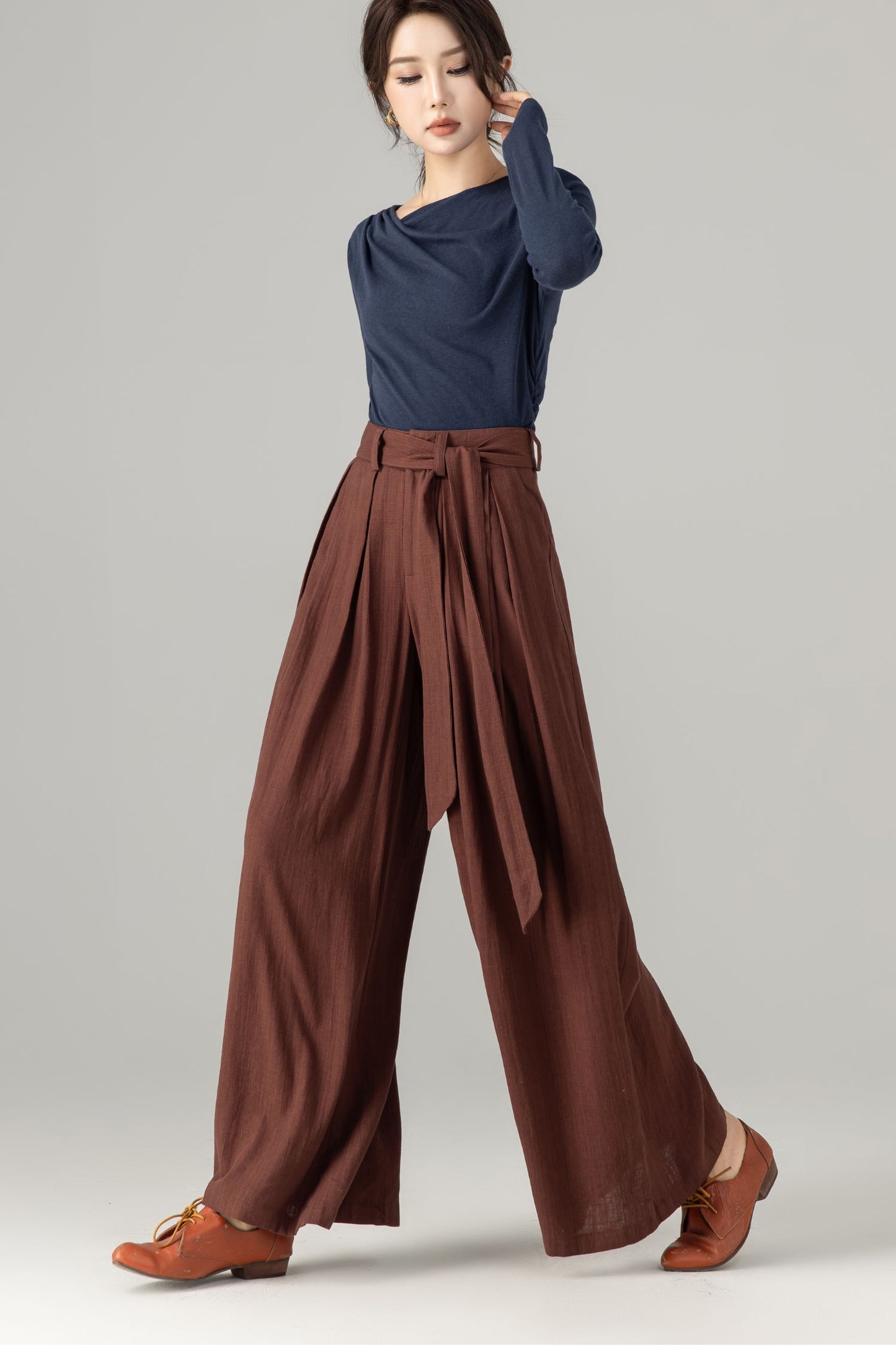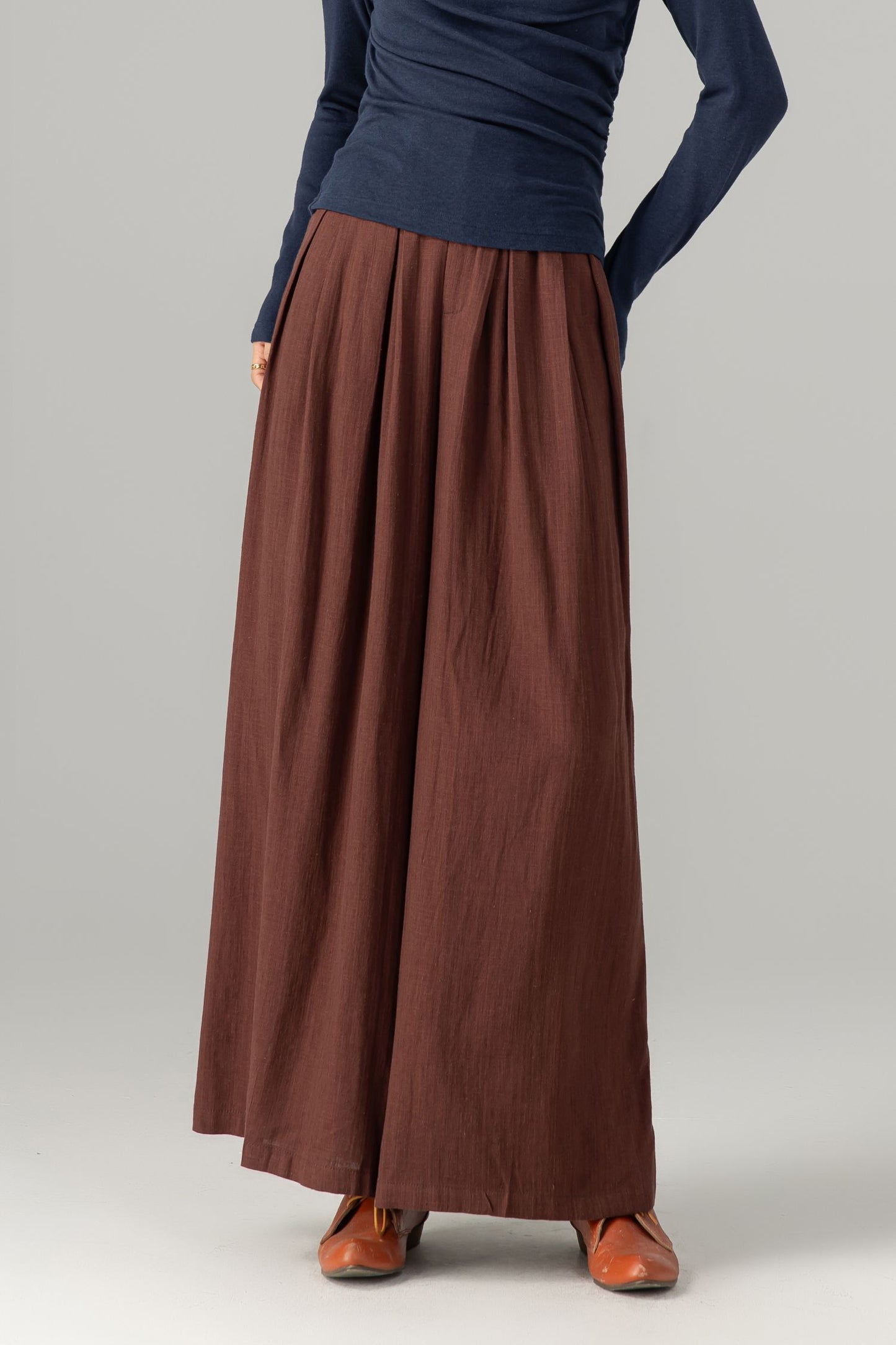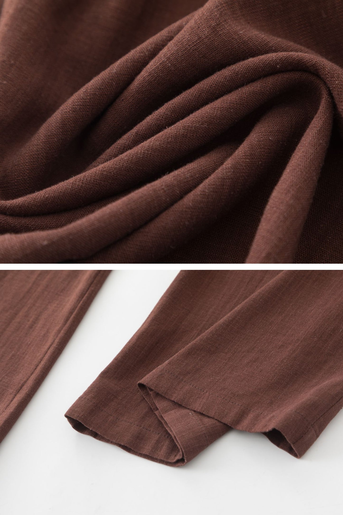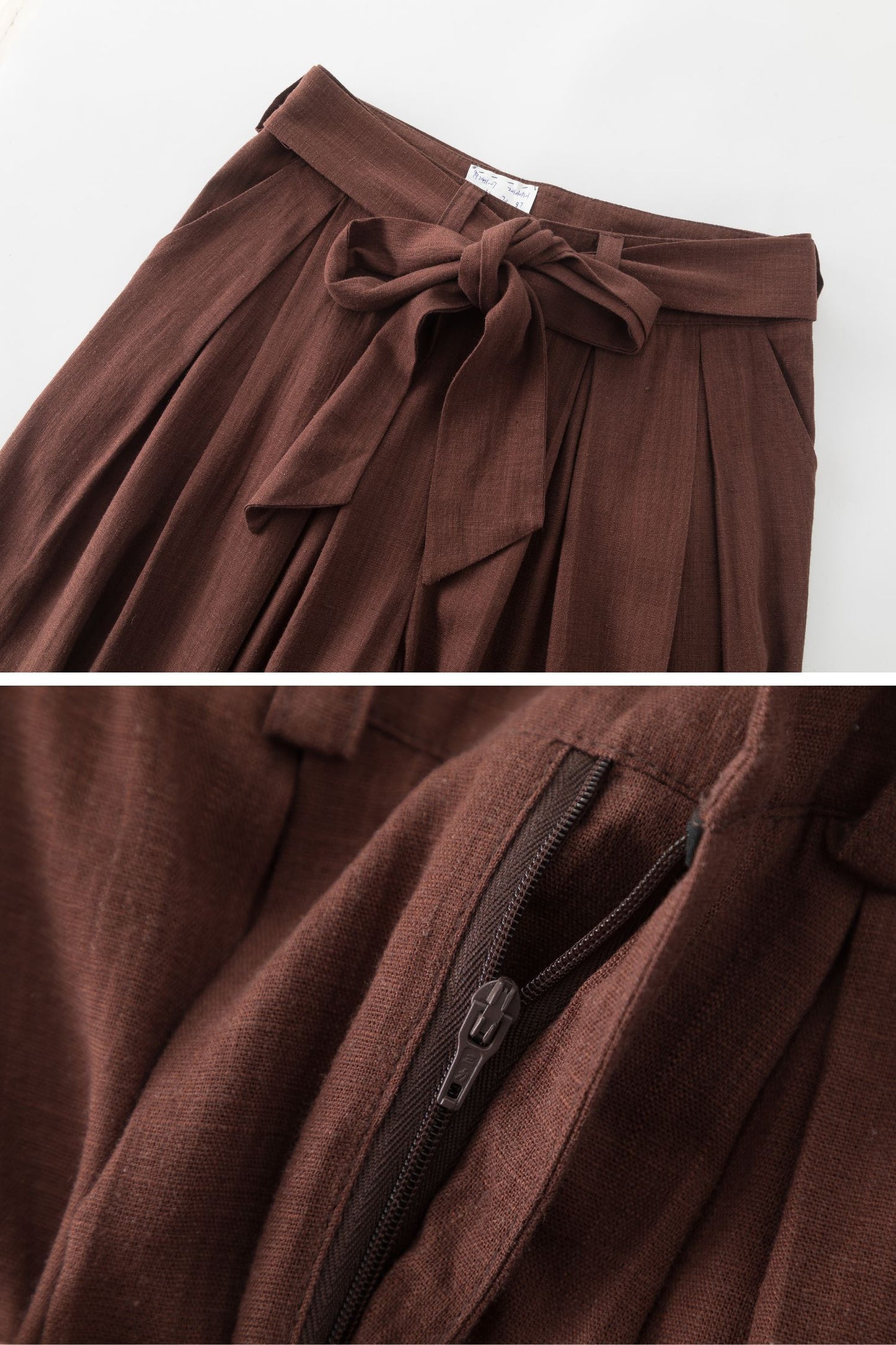 Our brown linen trousers are made from a soft fabric and have a fabric drawstring at the waist, making them stylish for summer and autumn. The style of the linen trousers gives them a skirt-like feel and the loose fit is comfortable to wear.